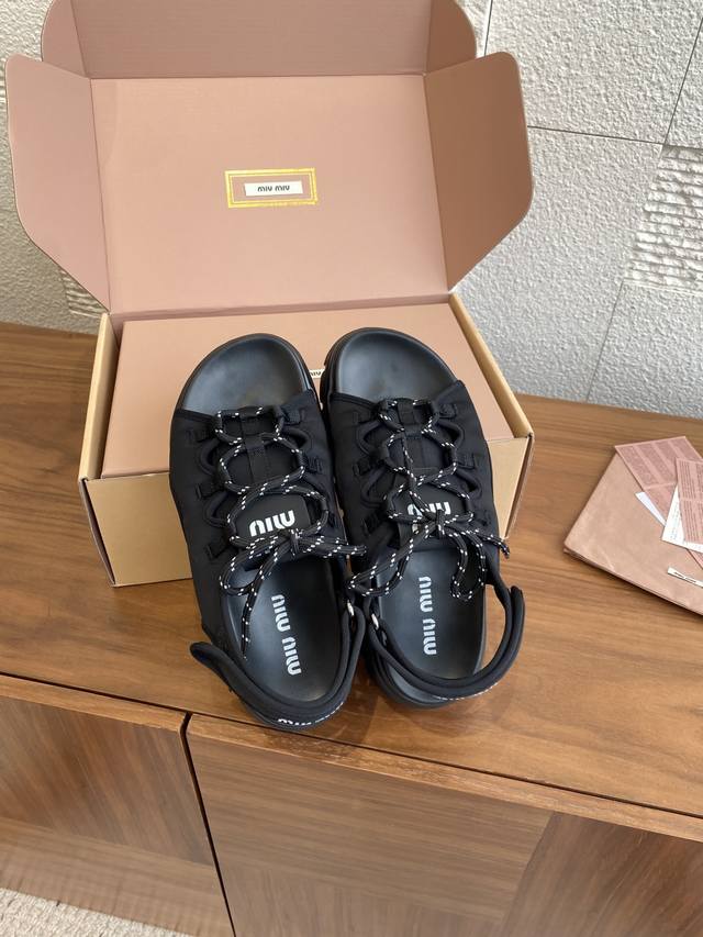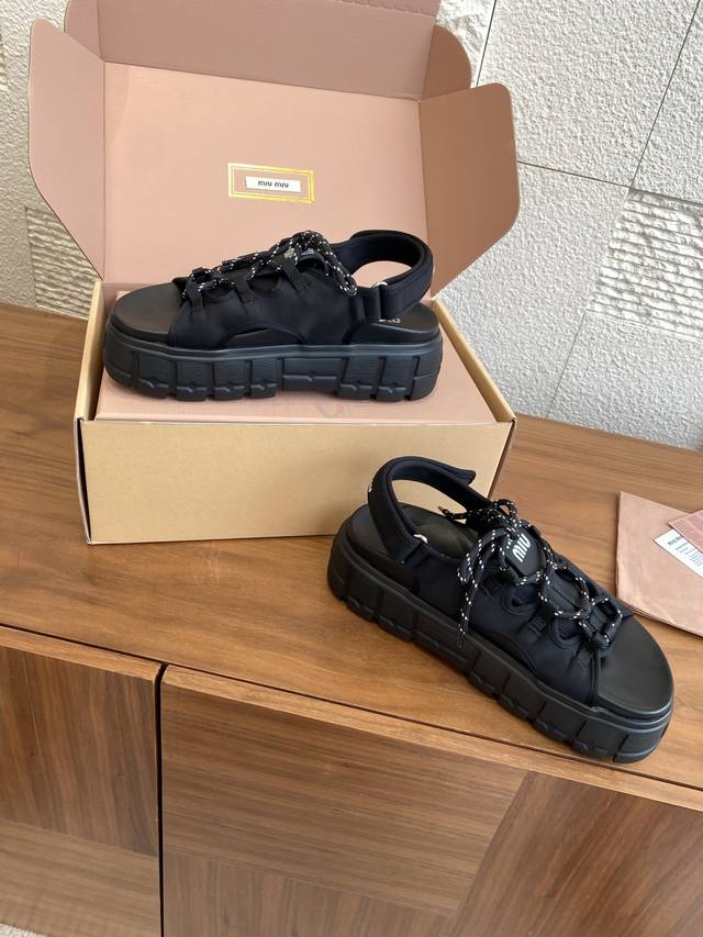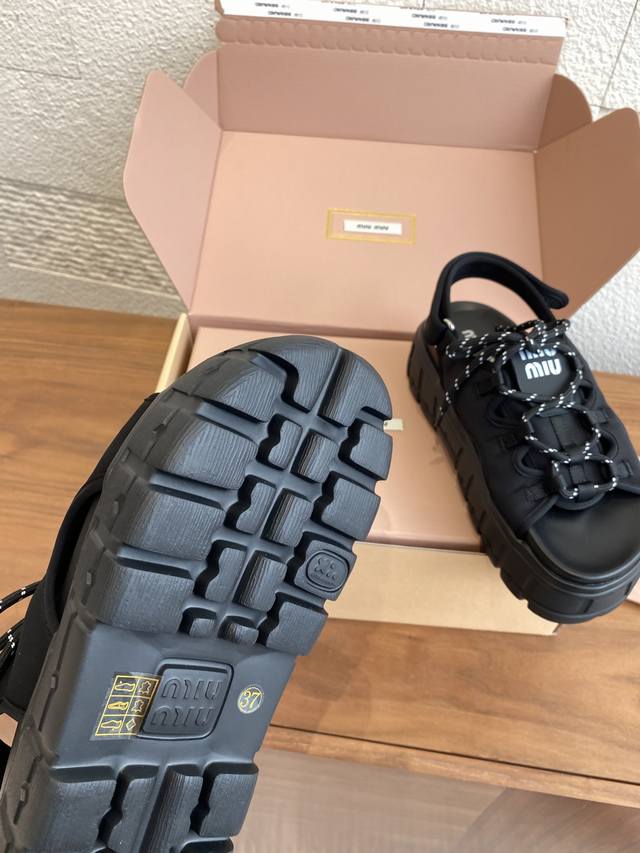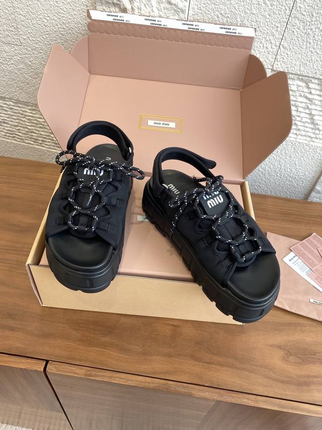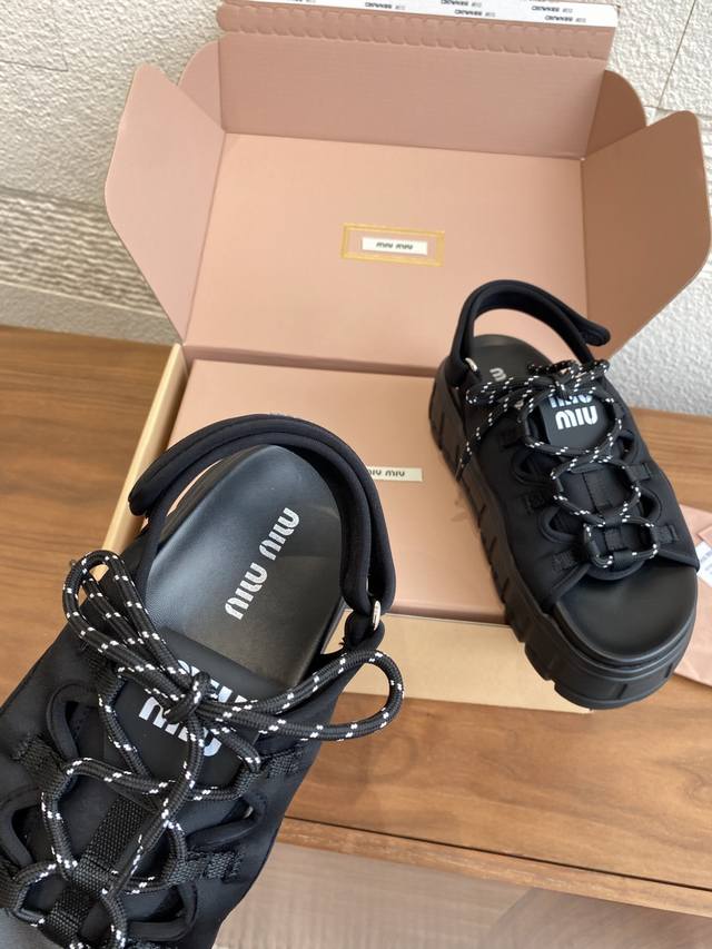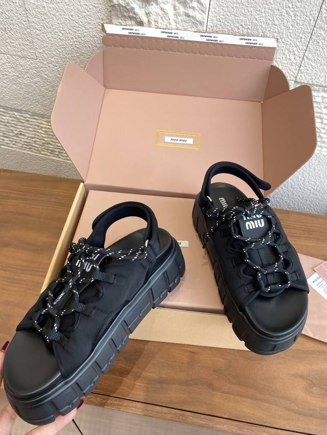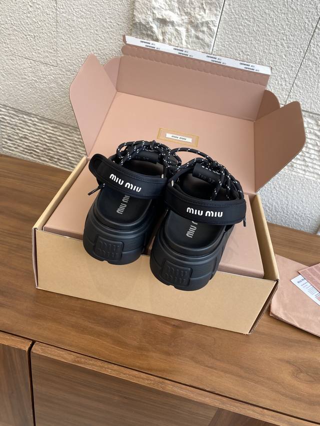 顶级版本: Miu Miu 缪缪 25Ss 夏季新款 绑带 魔术贴 厚底 凉鞋 这款休闲氯丁橡胶凉鞋采用前卫量感廓型设计,搭配双色鞋带,诠释Miu Miu品牌精