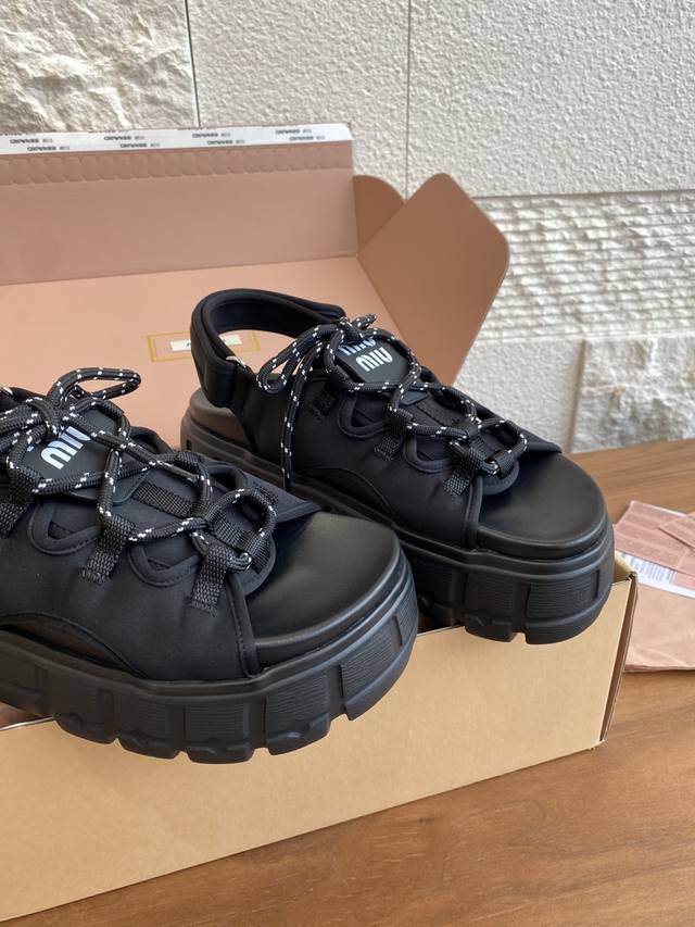 / 顶级版本: Miu Miu 缪缪 25Ss 夏季新款 绑带 魔术贴 厚底 凉鞋 这款休闲氯丁橡胶凉鞋采用前卫量感廓型设计,搭配双色鞋带,诠释Miu Miu品牌精