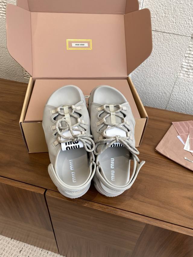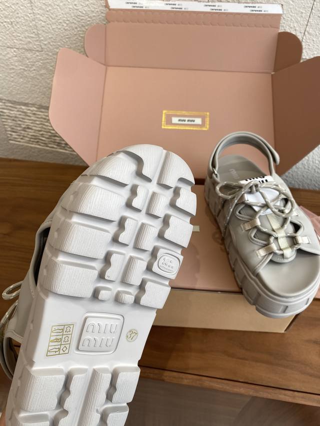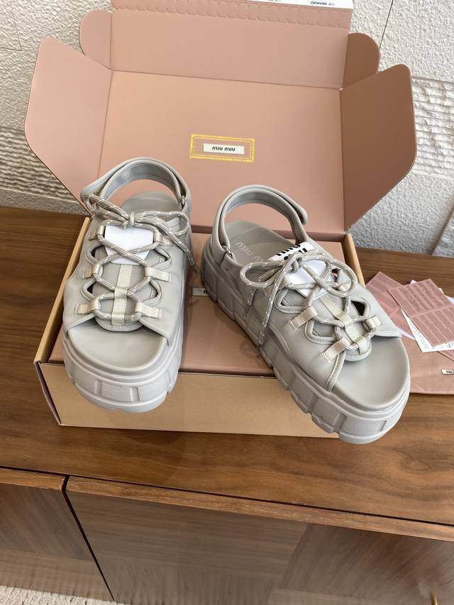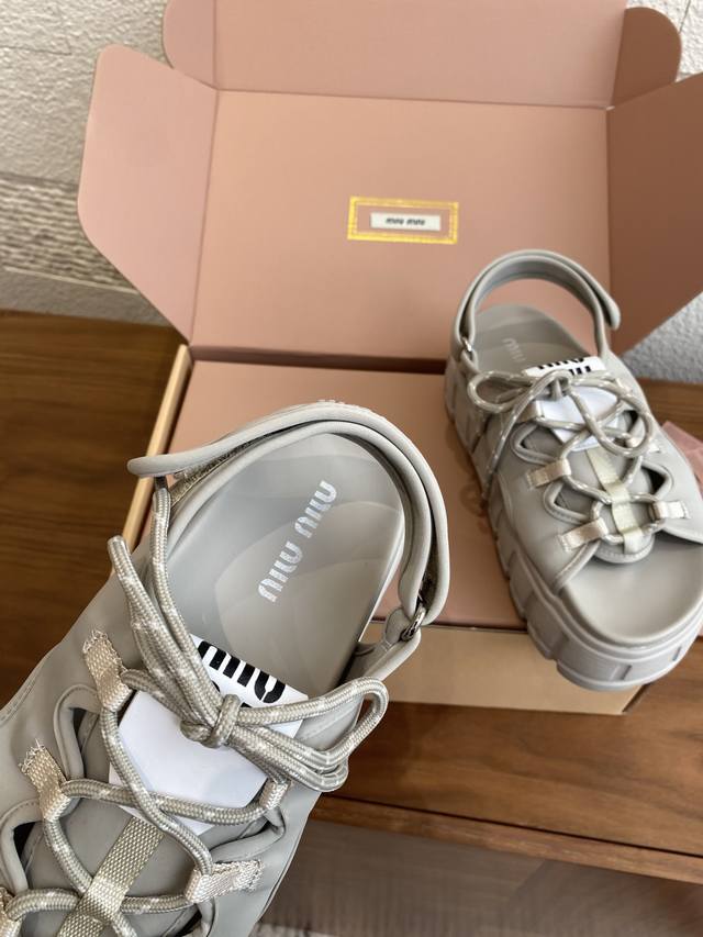 顶级版本: Miu Miu 缪缪 25Ss 夏季新款 绑带 魔术贴 厚底 凉鞋 这款休闲氯丁橡胶凉鞋采用前卫量感廓型设计,搭配双色鞋带,诠释Miu Miu品牌精