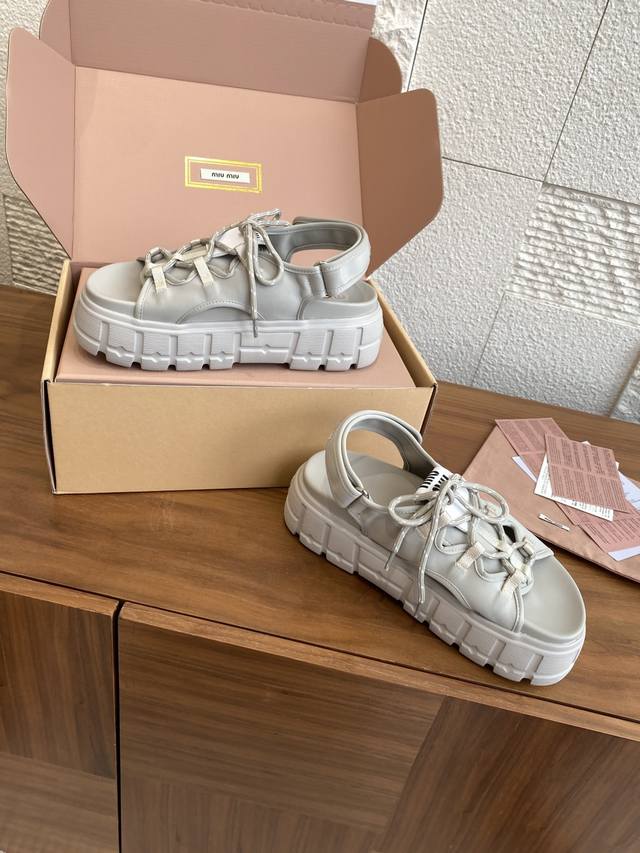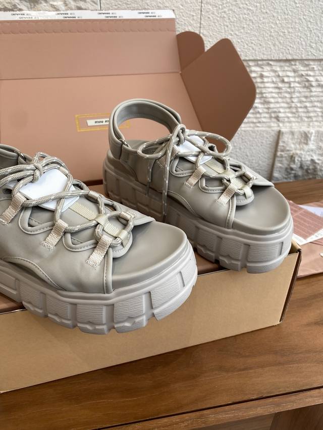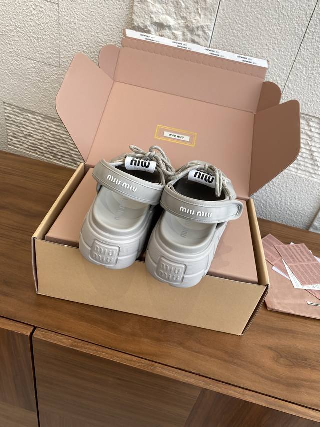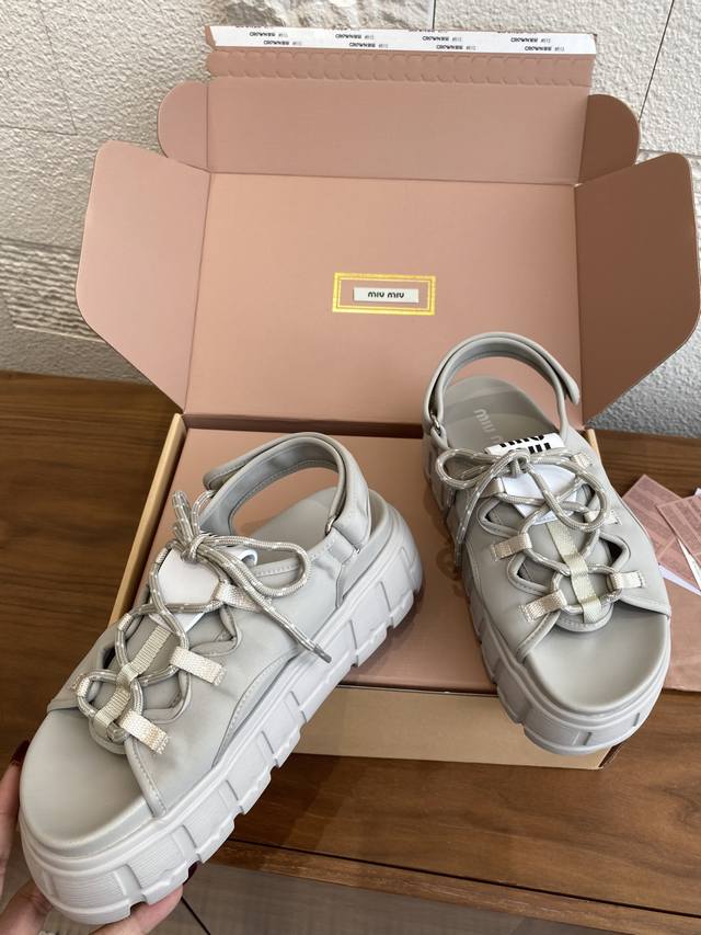 / 顶级版本: Miu Miu 缪缪 25Ss 夏季新款 绑带 魔术贴 厚底 凉鞋 这款休闲氯丁橡胶凉鞋采用前卫量感廓型设计,搭配双色鞋带,诠释Miu Miu品牌精