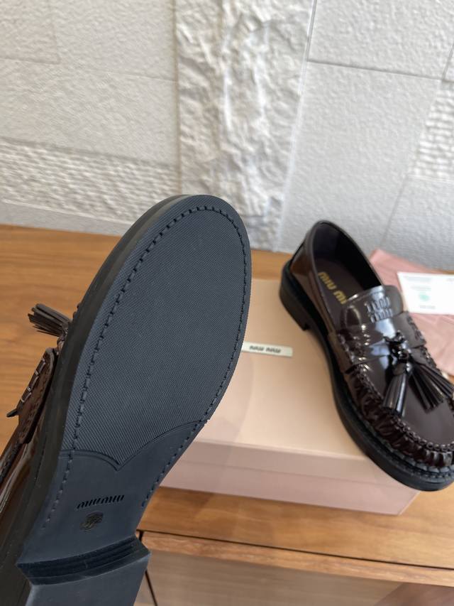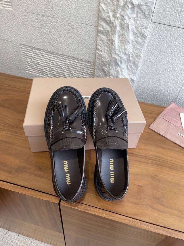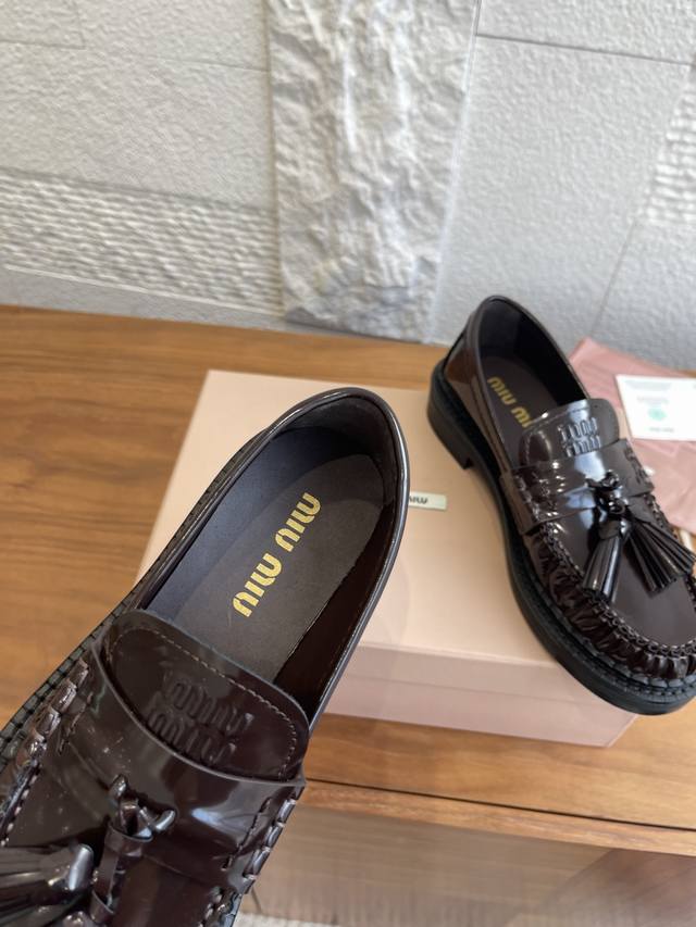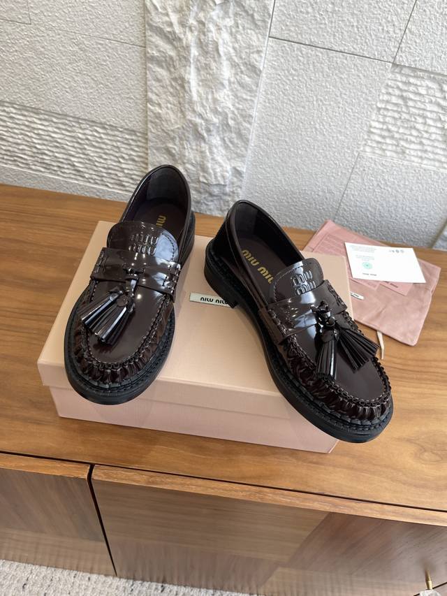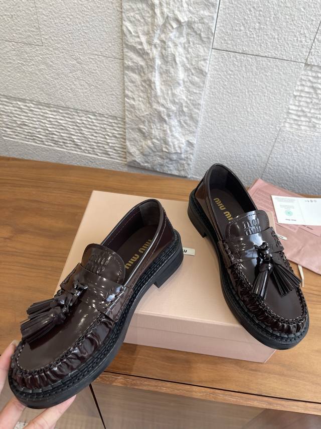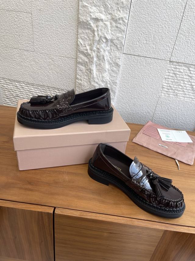 顶级版本: Miu Miu 缪缪 25Ss 秋冬新款 圆头 流苏 褶皱 乐福鞋 这款永不过时的小牛皮乐福鞋,鞋舌部位饰有压花Miu徽标,彰显别具一格的经典格调。鞋头盖点缀皮革饰带与特有的流苏饰带~ 上脚非常舒服 搭配还是可咸可甜 面料:定制进口头层牛皮 内里 垫脚:牛皮 大底:原版开模橡胶大底 Size:35-40 40定做不退换