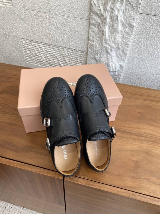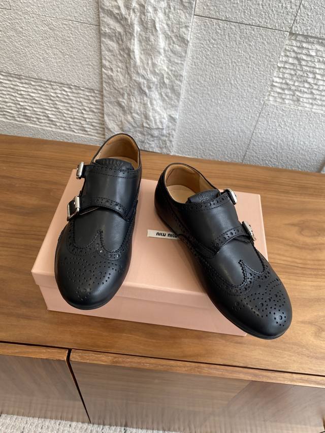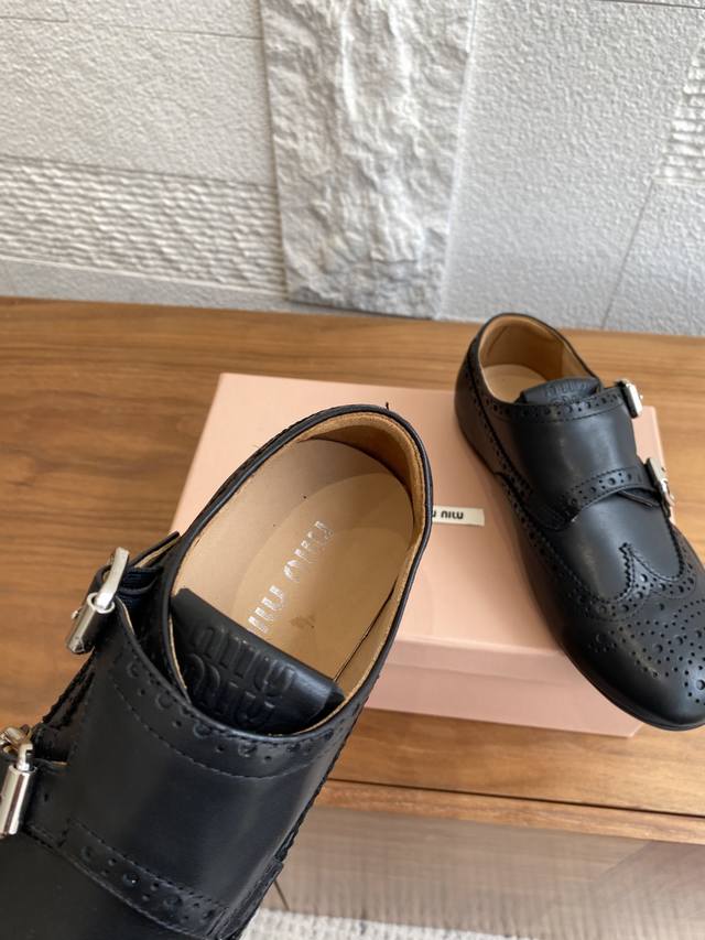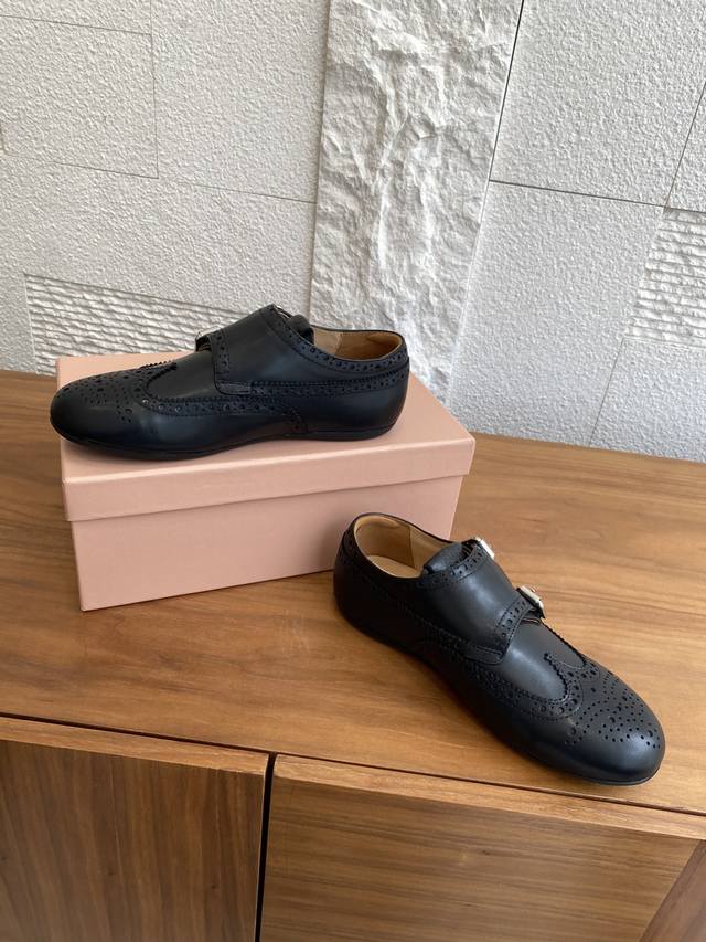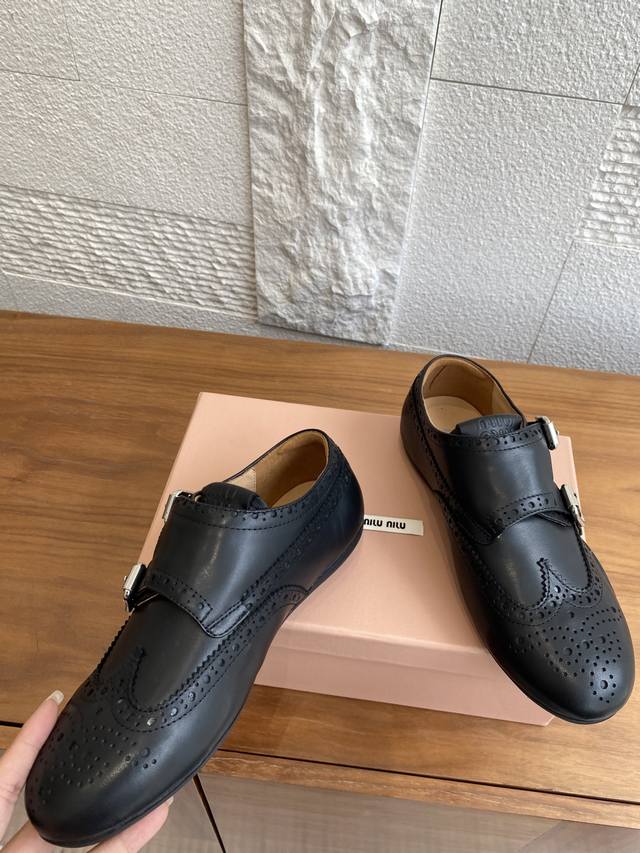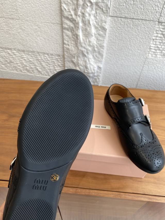顶级版本: Miu Miu 缪缪 25Ss 秋冬新款 复古做旧 带扣 镂空图案 布洛克鞋 德训鞋 Miumiu新款灵感源自经典男鞋,这款布洛克鞋的重新诠释将正式优雅与轻松舒适相结合,搭配轻便运动鞋底、柔软小牛皮革以及精致细节如扣饰和镂空装饰,鞋面配有搭扣,带金属搭扣的鞋带,鞋舌上压印徽标,内底上丝网印刷徽标。 面料:进口小牛皮 内里:进口牛皮里 大底:原版开模橡胶大底 Size:35-40 40定做不退换