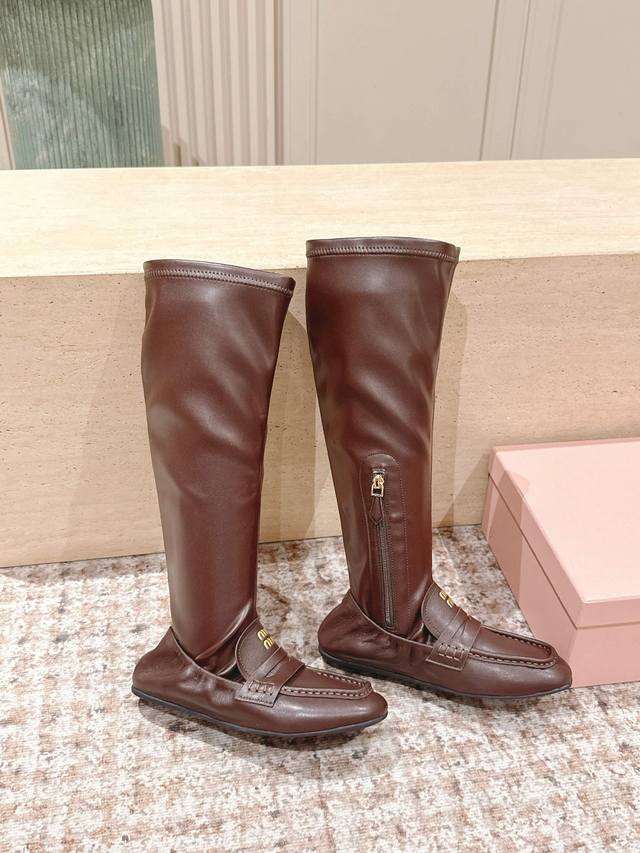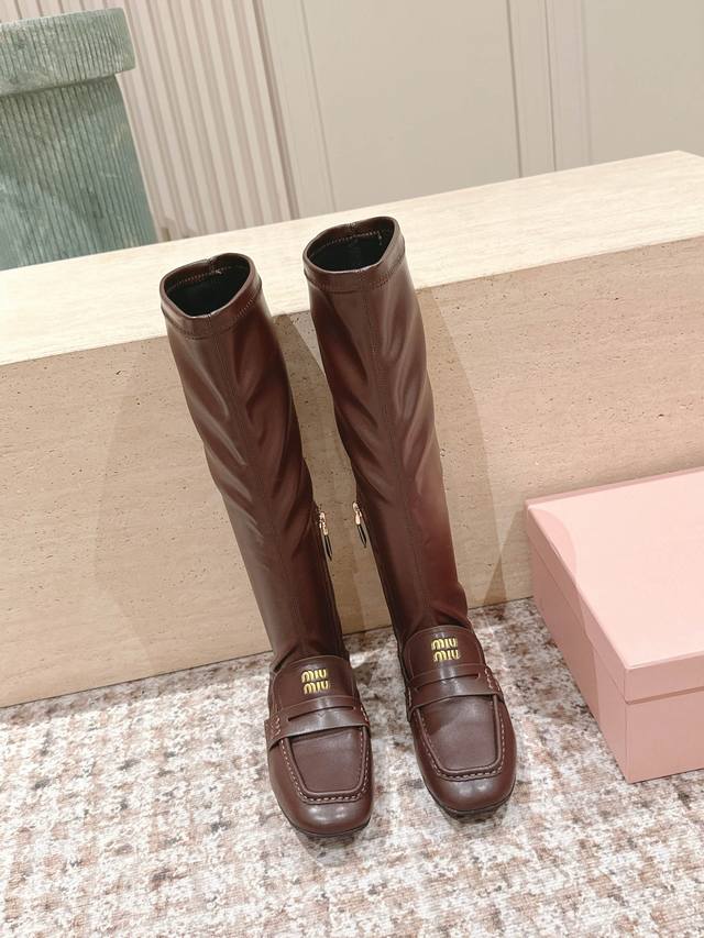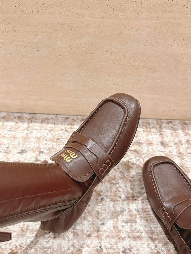/ 顶级版本: Miumiu谬谬25S新款高筒乐福拼接弹力靴皮靴 巨显瘦 大胆的拼接款式设计,未来感与经典碰撞 重构随性华美 充满活力、艺术、新鲜感风格随性的华美,
