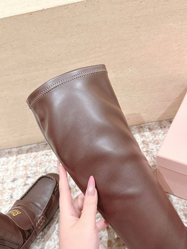 顶级版本: Miumiu谬谬25S新款高筒乐福拼接弹力靴皮靴 巨显瘦 大胆的拼接款式设计,未来感与经典碰撞 重构随性华美 充满活力、艺术、新鲜感风格随性的华美,