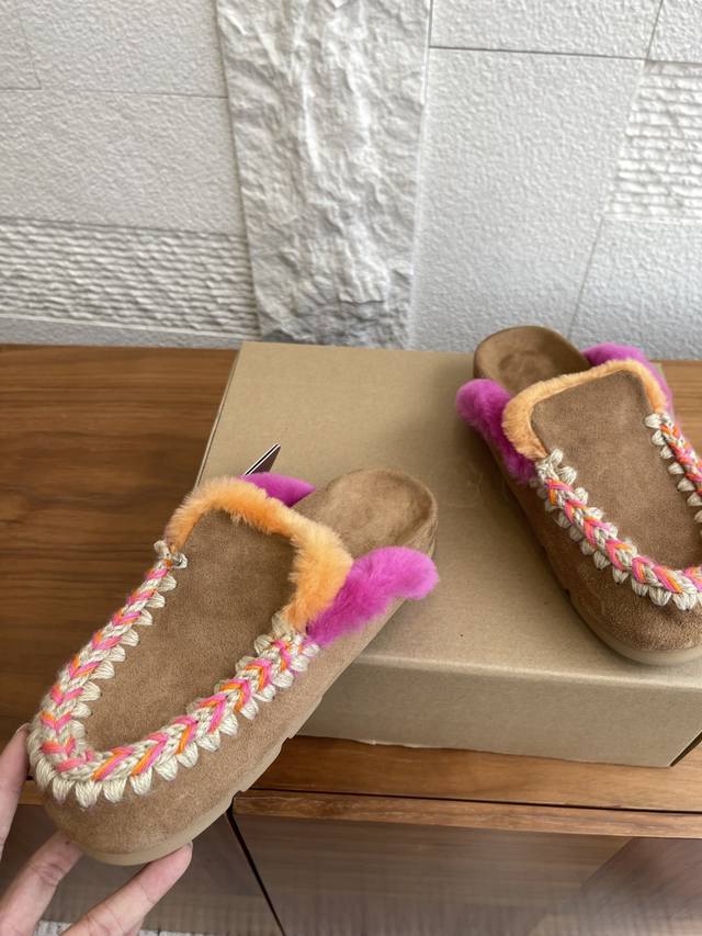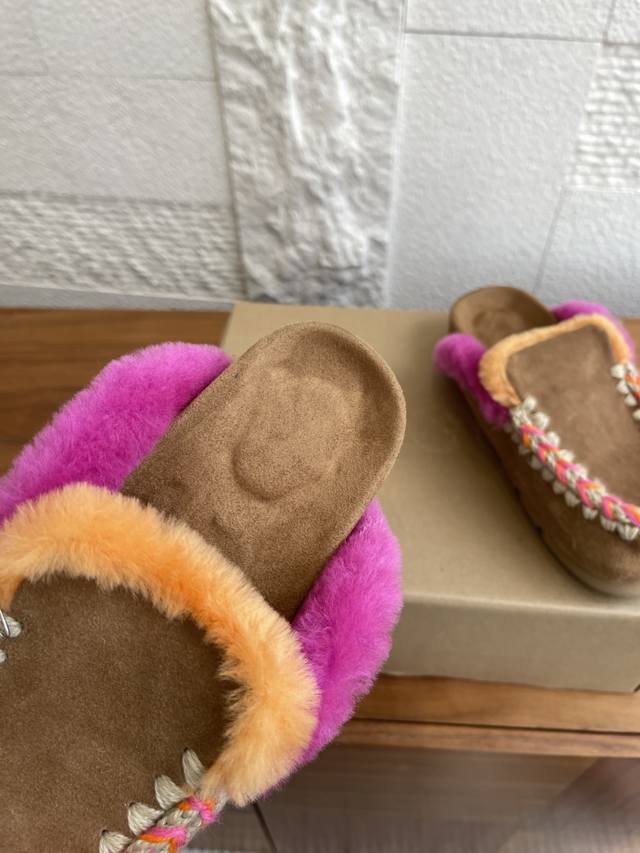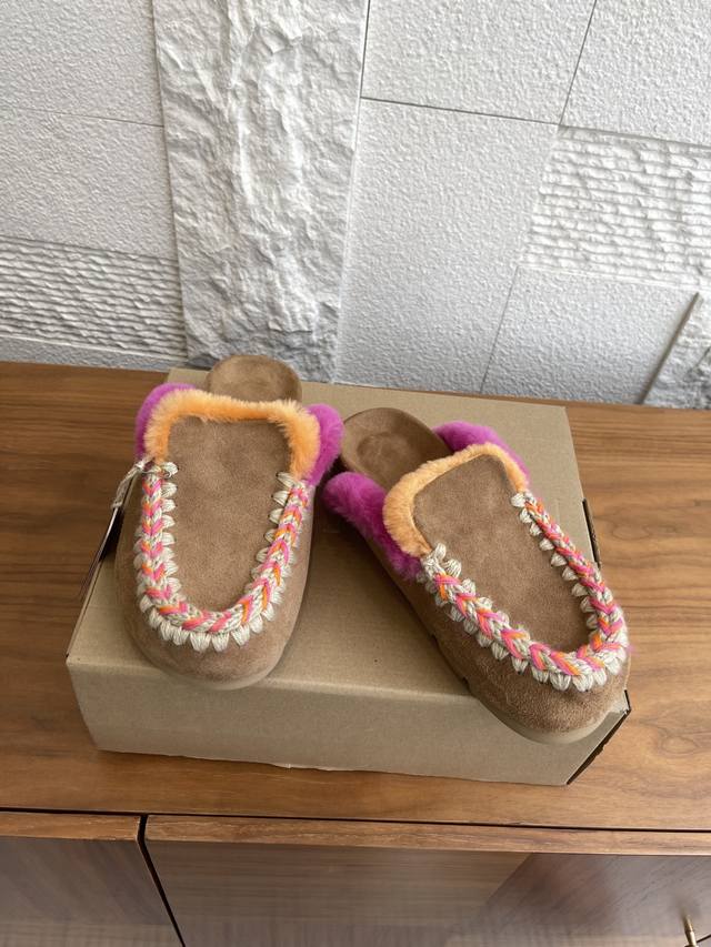 / 顶级版本: Mou 小众潮牌 2025 秋冬新款 撞色暖感后空 毛毛拖鞋 Mou暖感后空 鞋系列Winter Bio潮流手工缝线便鞋,鞋面采用奢华绒面和柔软浓密