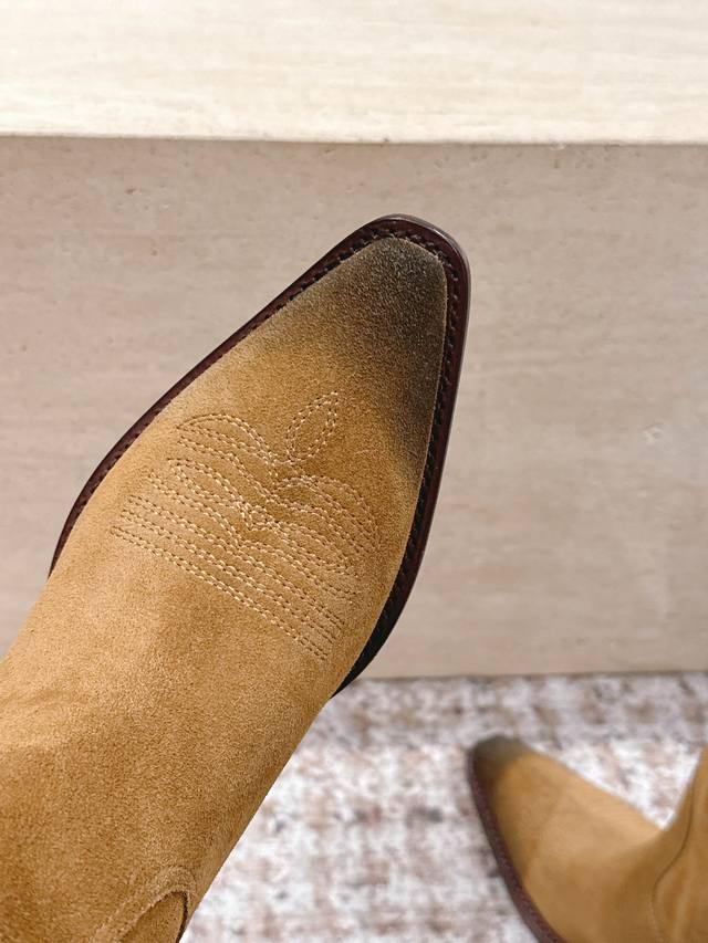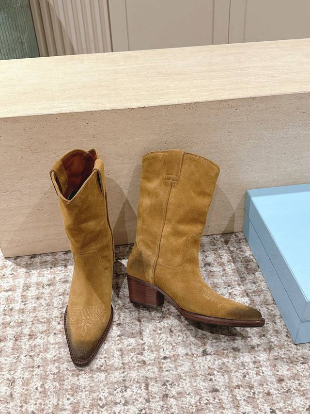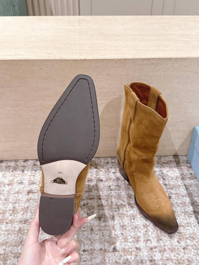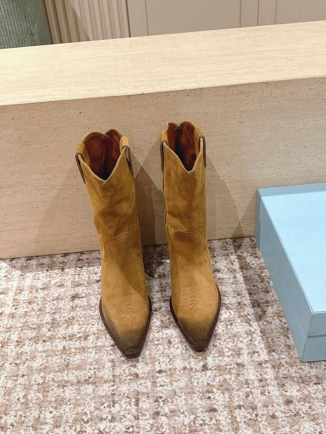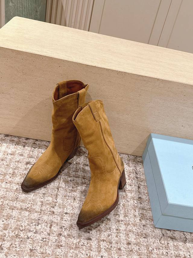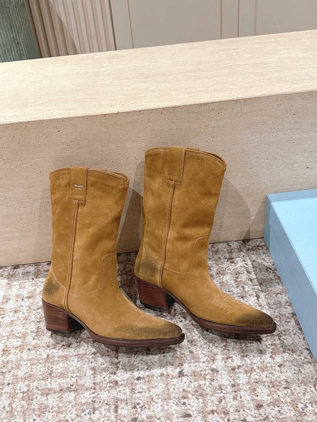 顶级版本: :prada Fw25 New Arrival~ p家25秋冬西部靴新品 定制原版风格小牛皮,做手工做旧工艺 很扎实的料子,出来的质感很赞,感觉越传