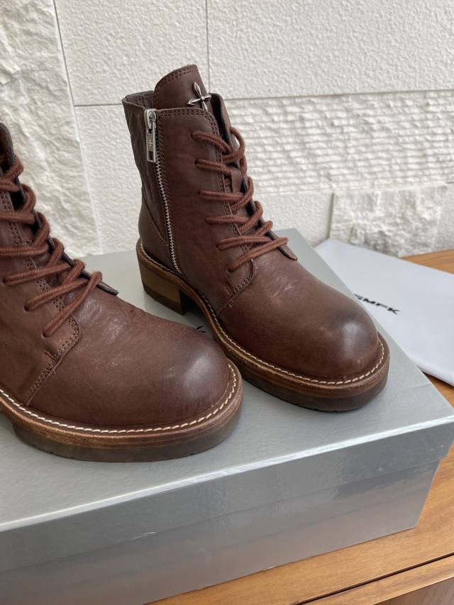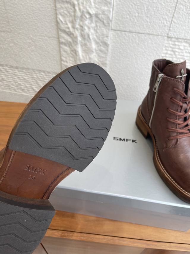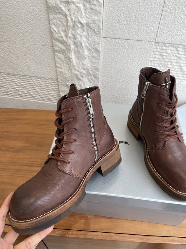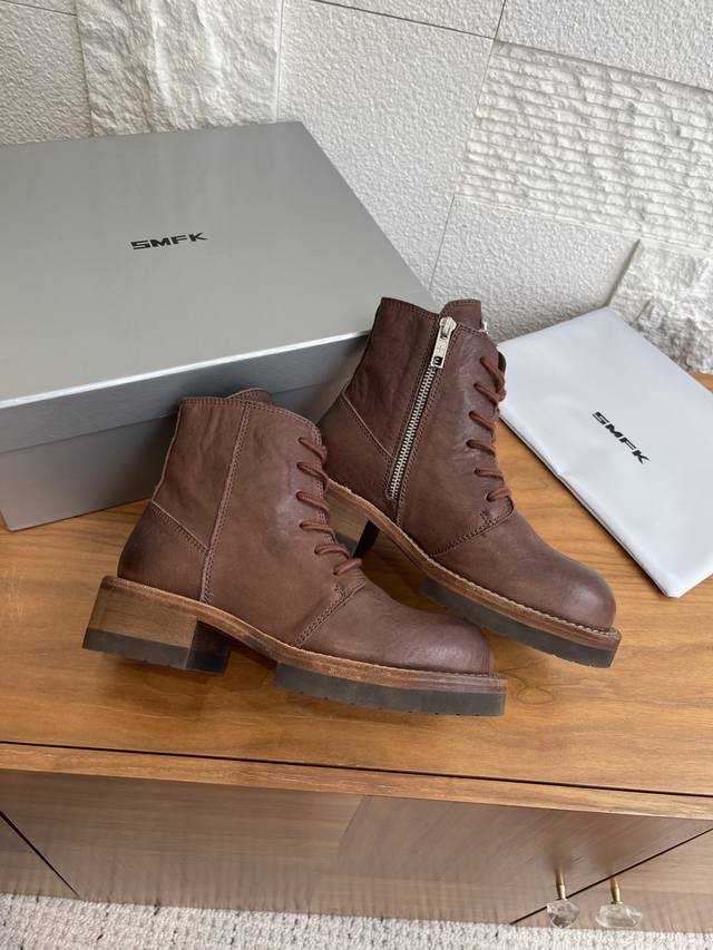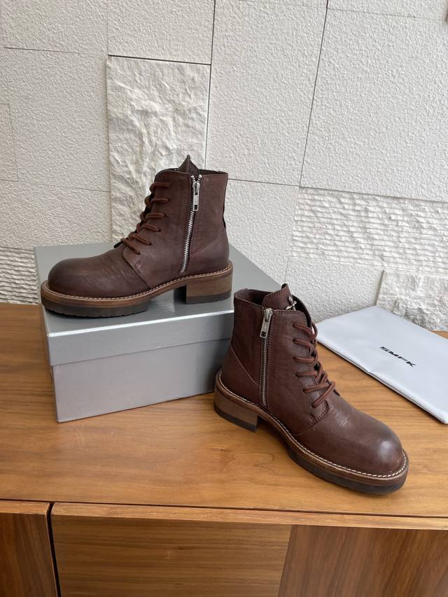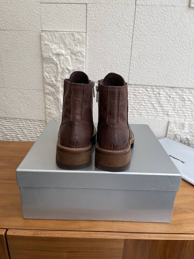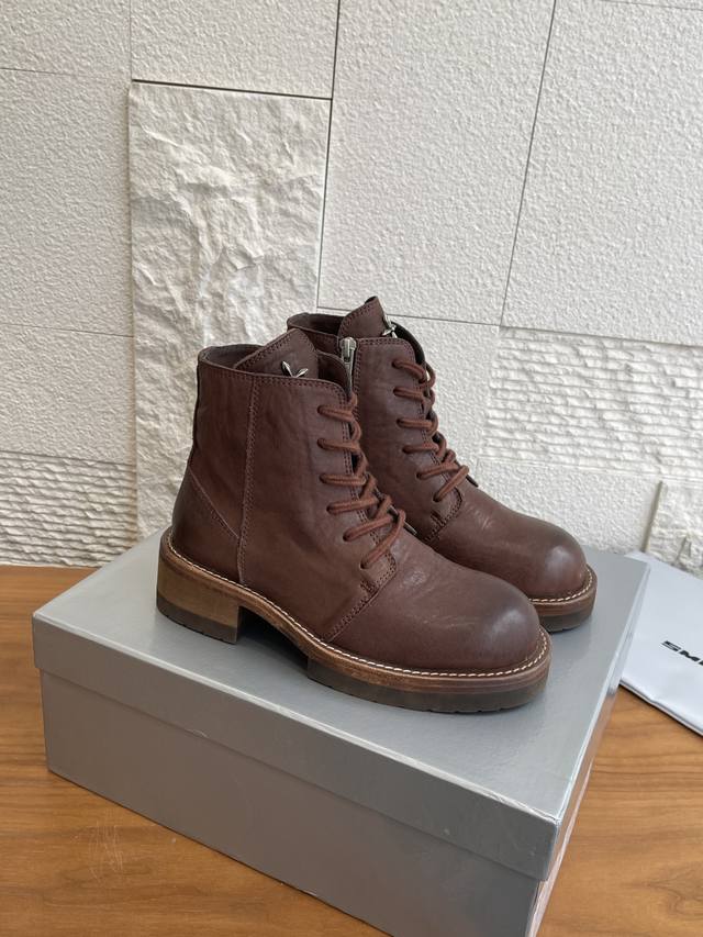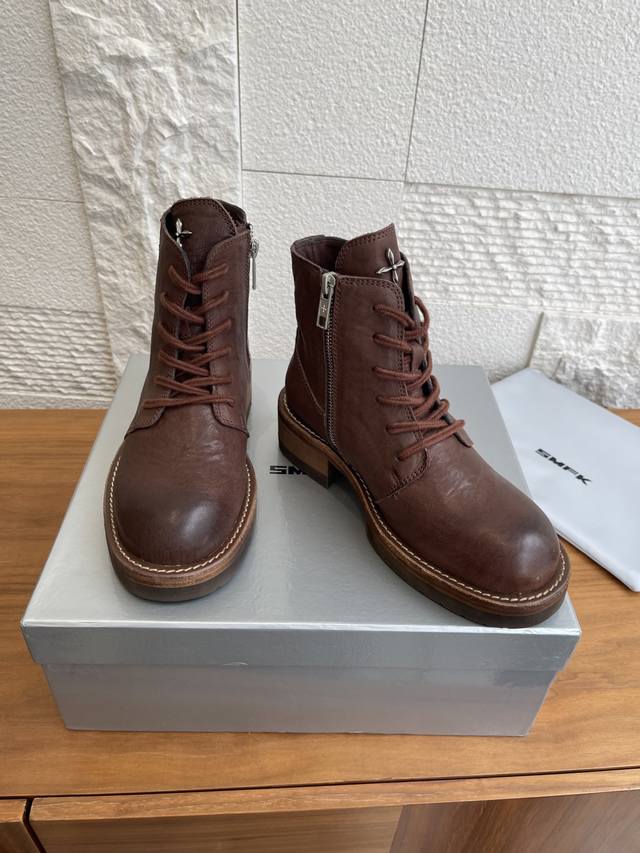 顶级版本: DDD Smfk 十字 25Ss 秋冬新款 Rage Wild 野性起源系列 系带 马丁靴 机车靴 DDD Rage野性手工的鞋履系列,传承延续经典鞋履制造工艺,从材料制作与挑选出发,打造具有Smfk野性美学的的原生感鞋靴系列。野性起源系列,采用古典的水染鞋履制作工艺,原色皮质鞋履制成后,将染料与批次的鞋履在滚简中水洗染色,在滚动的过程中,鞋身的皮质和鞋底的皮质上色并互相打磨抛光,让皮质拥有班驳的颇色的同时也体现皮质自身纹理及油润光泽。困特昇 Goodyear 手工鞋顯制傲工艺,将皮身与皮底结