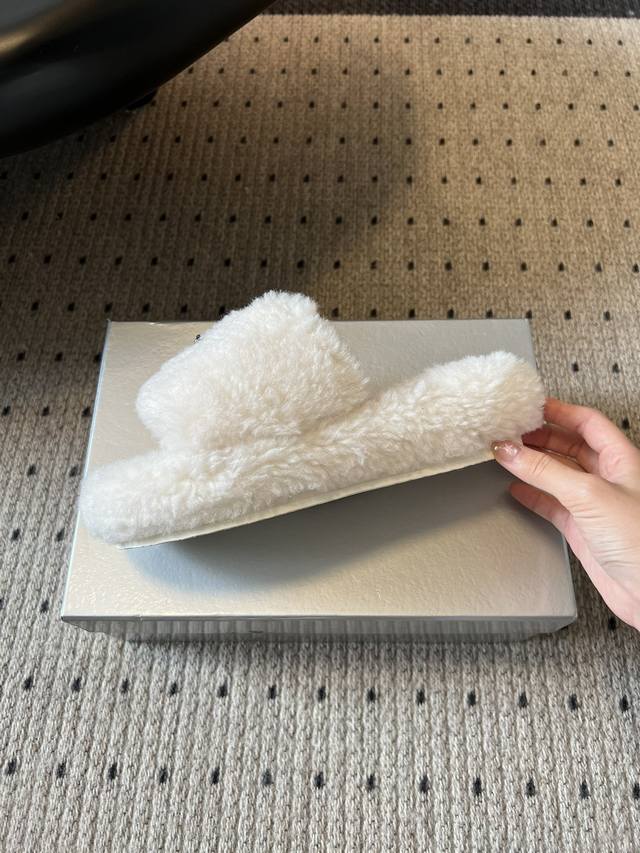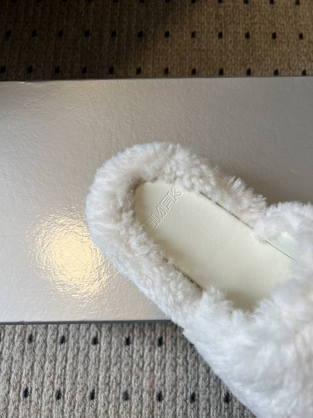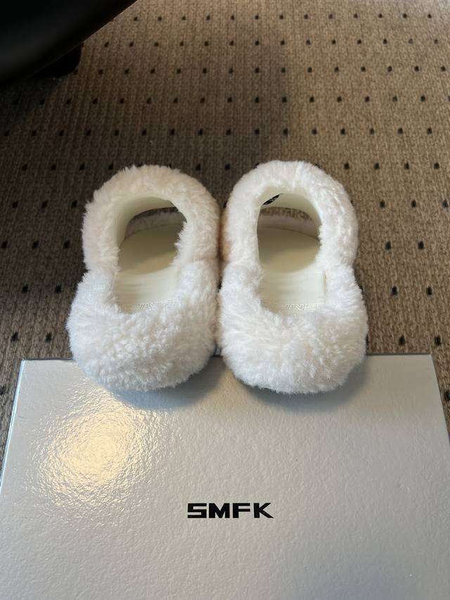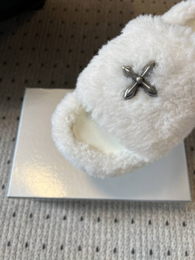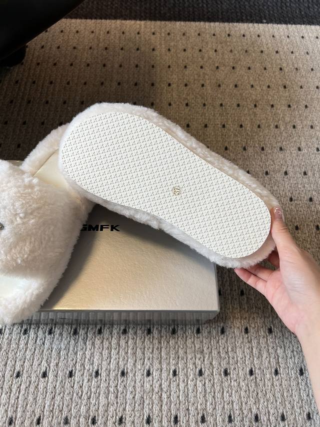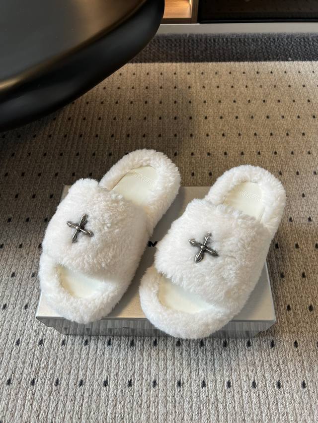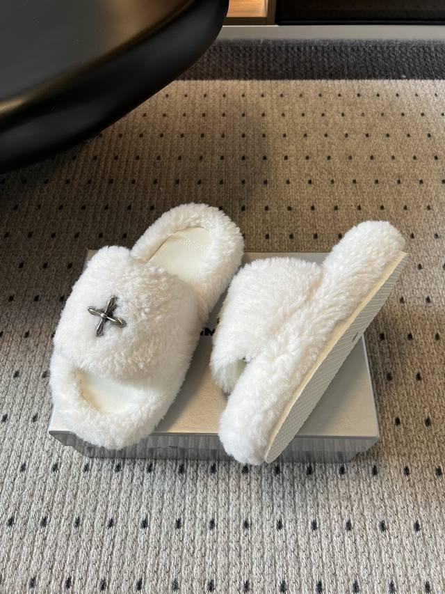 顶级版本 Smfk 25Ss厚底毛绒露趾拖鞋 采用仿羊羔毛材质,触感柔软蓬松,保暖性较好;鞋面上有金属十字装饰,增添了设计感与精致度。为露趾拖鞋型,风格休闲随性
