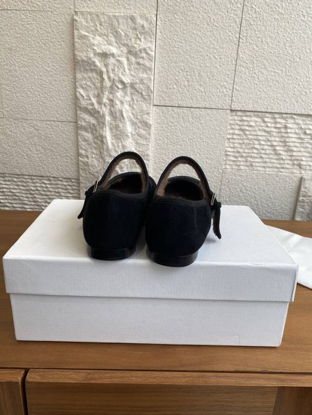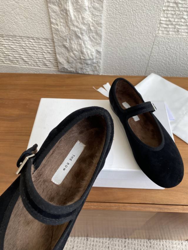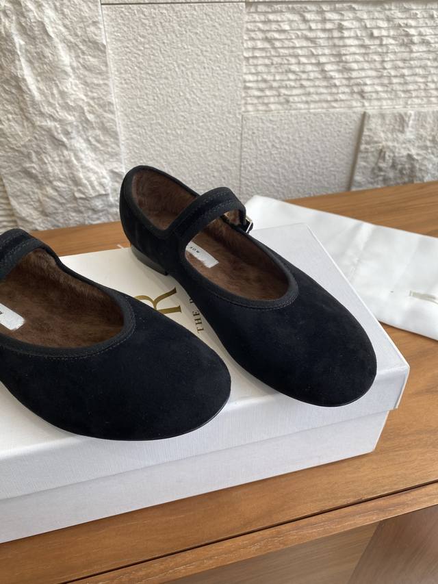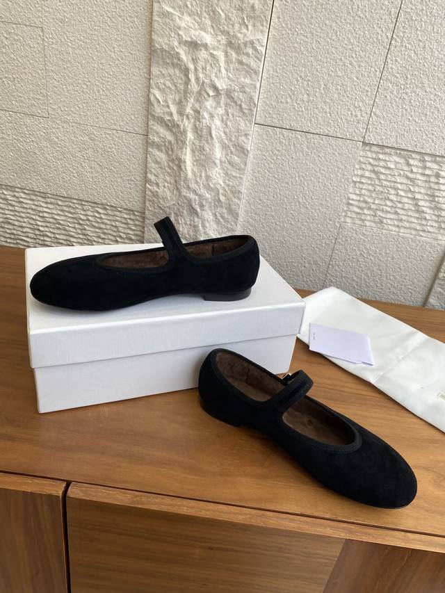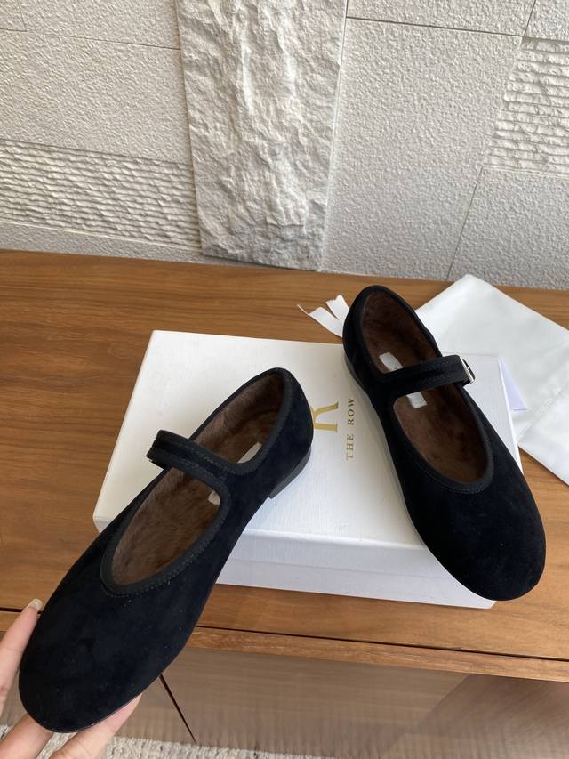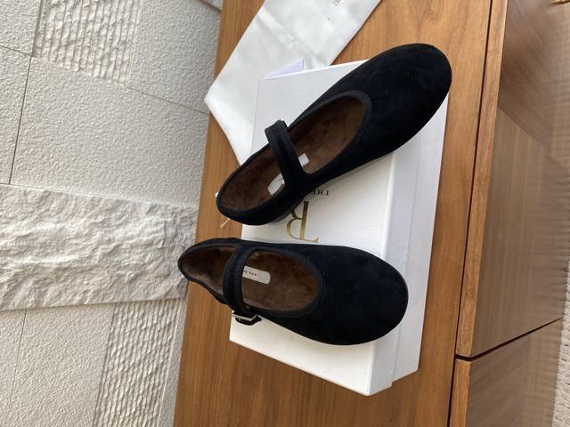 顶级版本: The Row 25Ss 秋冬新款 Boheme 芭蕾舞鞋 搭扣带 羊毛内衬 平底 玛丽珍 The Row 本季玛丽珍平底鞋正当红,这款“Boheme”以柔软的绒面革制成,设有搭扣鞋袢带,舒适、优雅又百搭。让它即使在众多品牌中也能脱颖而出,成为小众时尚的宠儿。无论是上班通勤还是周末闲逛,这双玛丽珍鞋都能成为你的完美选择。 鞋面用的是进口麂皮摸起来超级舒服,羊毛内衬细腻得像云朵一样柔软,穿上脚特别亲肤。颜色也很高级,不是那种很夸张的亮色,而是低调又有质感的色调。鞋子特别轻巧,透气性超好,秋冬天穿