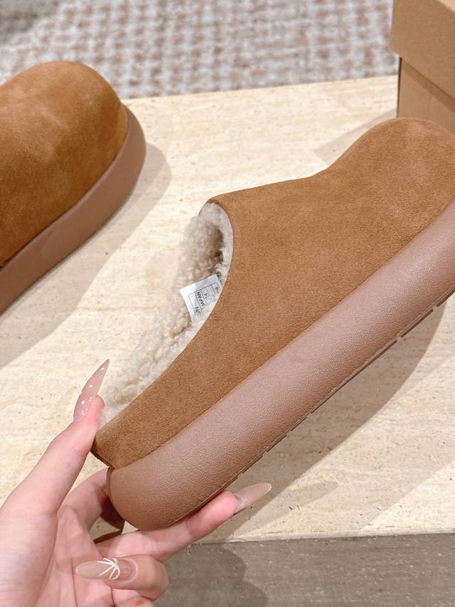 顶级版本: :Ug*秋冬新款圆头加绒穆勒拖鞋 鞋面采用反绒皮材质,触感柔软且质感高级;鞋内填充厚实羊毛内衬,紧密锁温,能在秋冬季节提供充足的保暖效果,贴合脚部肌