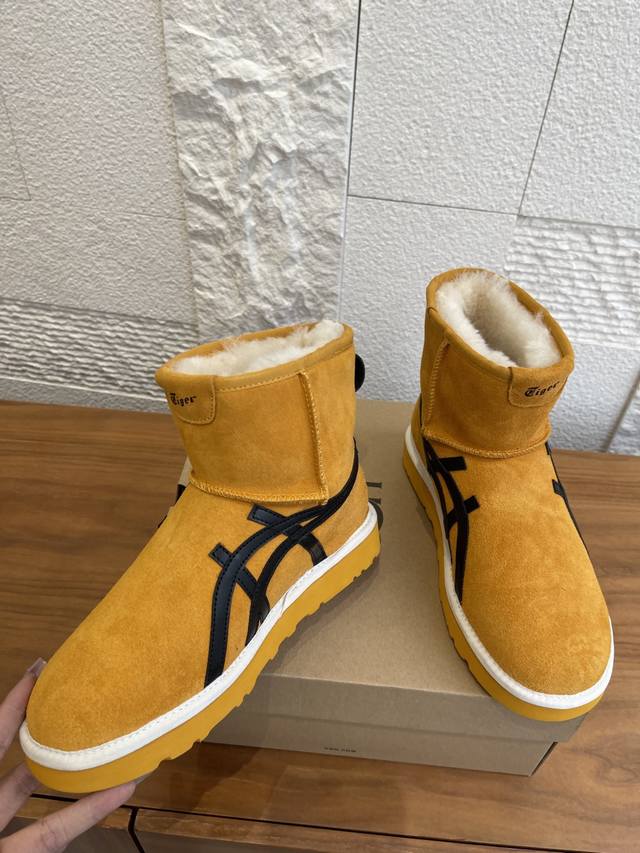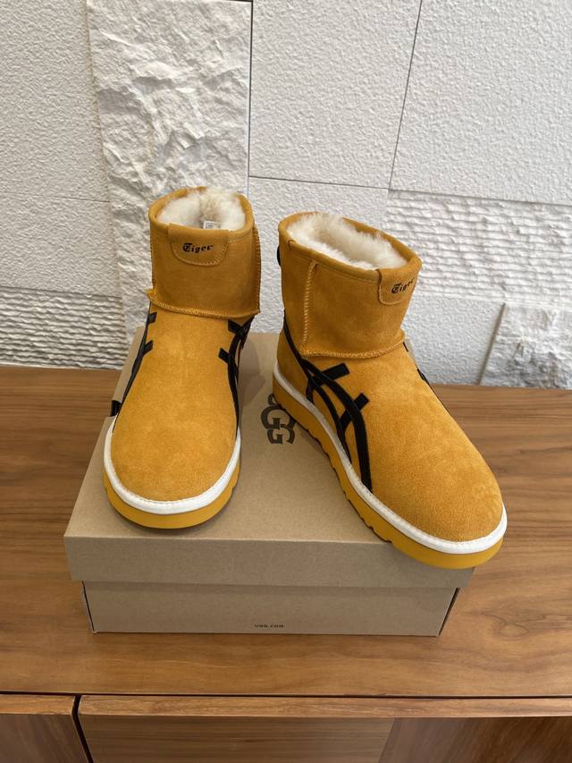 顶级版本: DDD Ugg X Onitsuka Tiger 2025 秋冬新款 联名款雪地靴 DDD Ugg联手Onitsuka Tiger鬼冢虎推出的联名雪地靴,采用黄色翻毛皮鞋面,搭配经典黑色虎爪条纹,复古又潮流。Ugg厚实鞋底,抓地力强,穿着舒适,保暖力满分获。穿脱超方便,兼具时尚与功能性,冬季出街必备! DDD 面料:进口牛反绒 DDD 内里:进口羊毛 DDD 大底:原版开模Eva大底 DDD Size:35-40 40定做不退换 DDD
