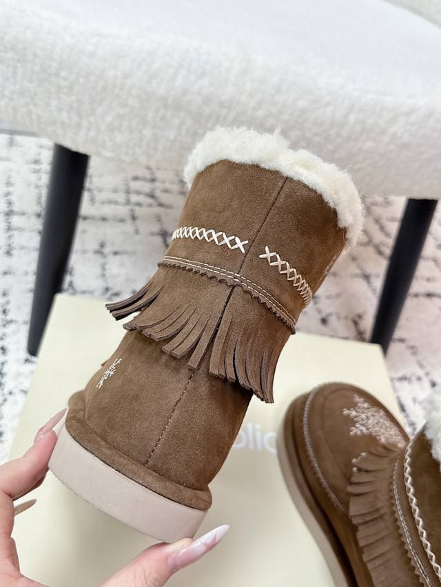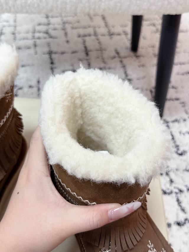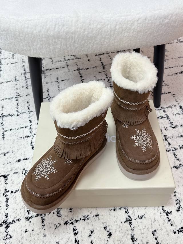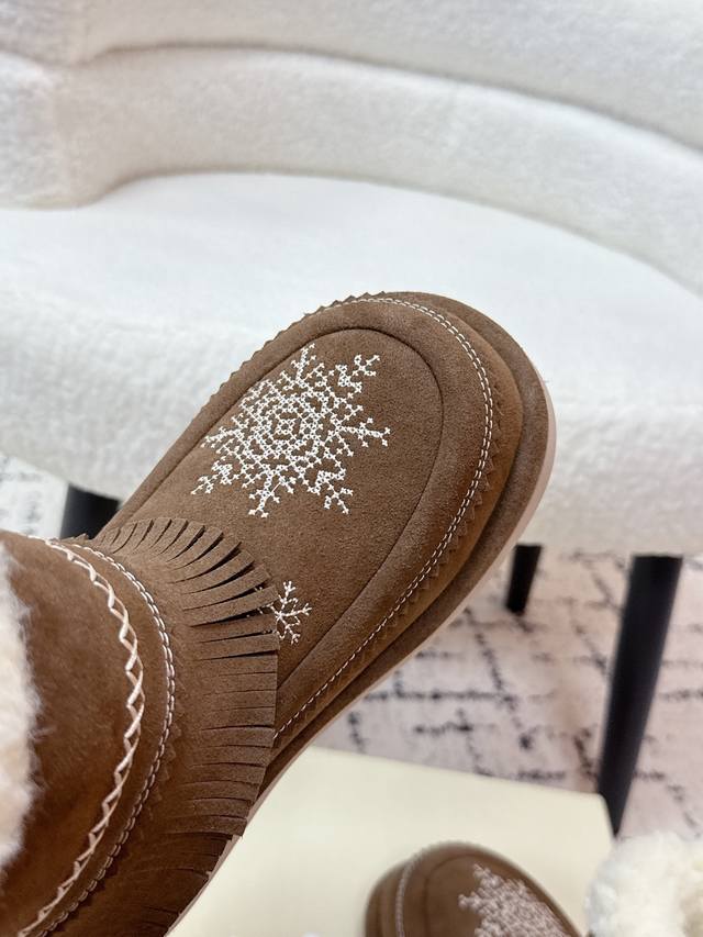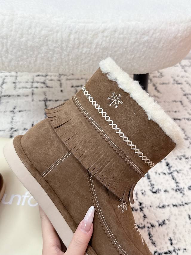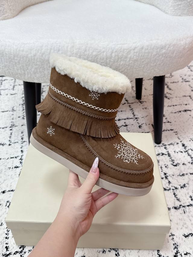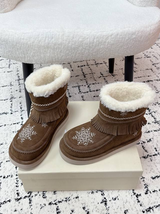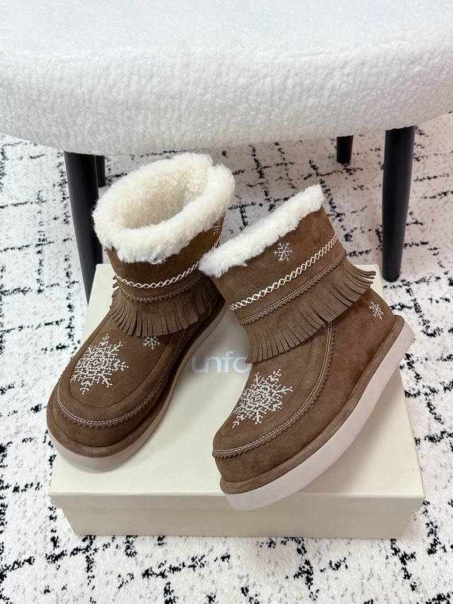 顶级版本 Unfolio 潮牌 25 冬季 最新 主推款 短筒 雪地靴 流苏设计 几万针刺绣雪花 图案 内里羊毛 小众设计师25发布会新款 面料 : 高丝光牛反