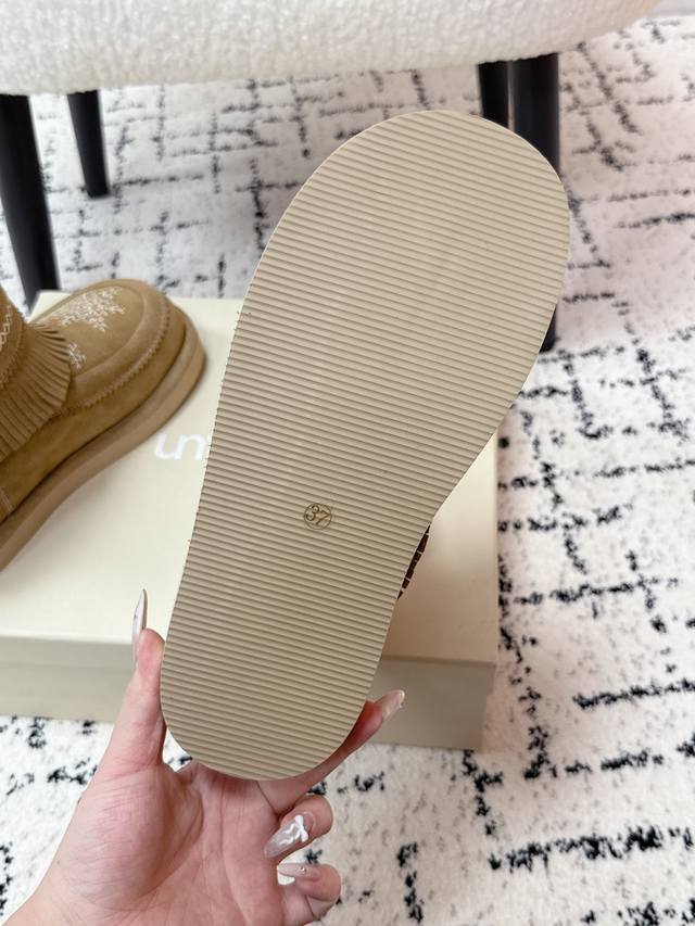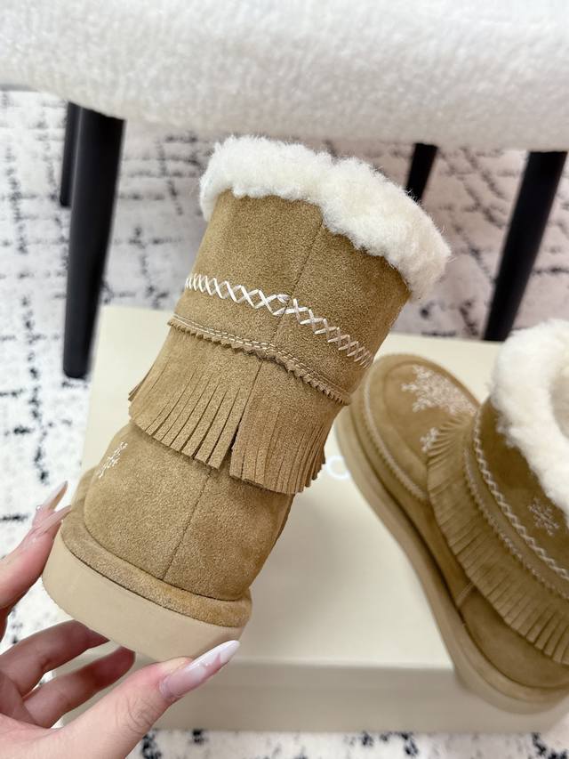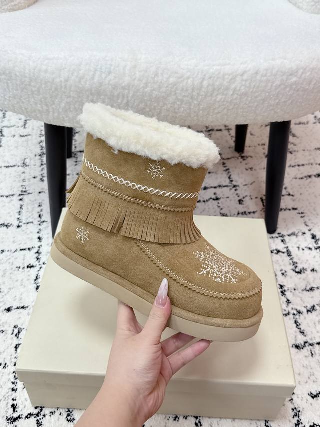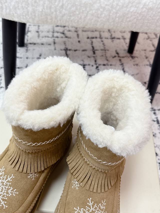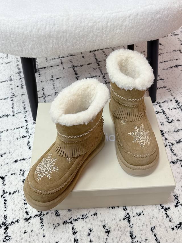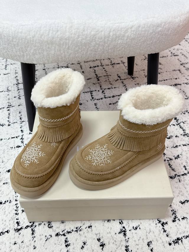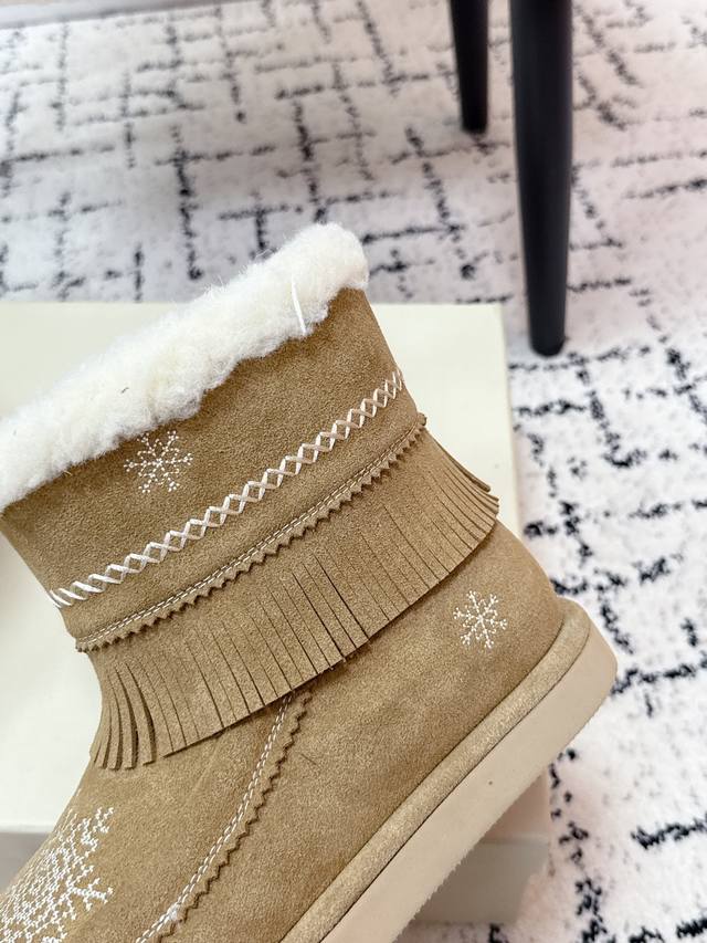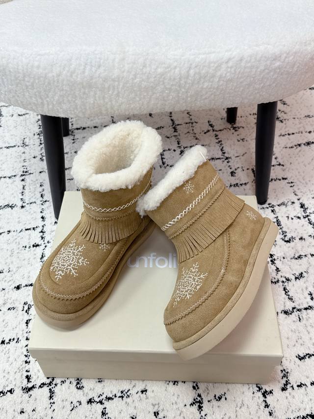 顶级版本 Unfolio 潮牌 25 冬季 最新 主推款 短筒 雪地靴 流苏设计 几万针刺绣雪花 图案 内里羊毛 小众设计师25发布会新款 面料 : 高丝光牛反