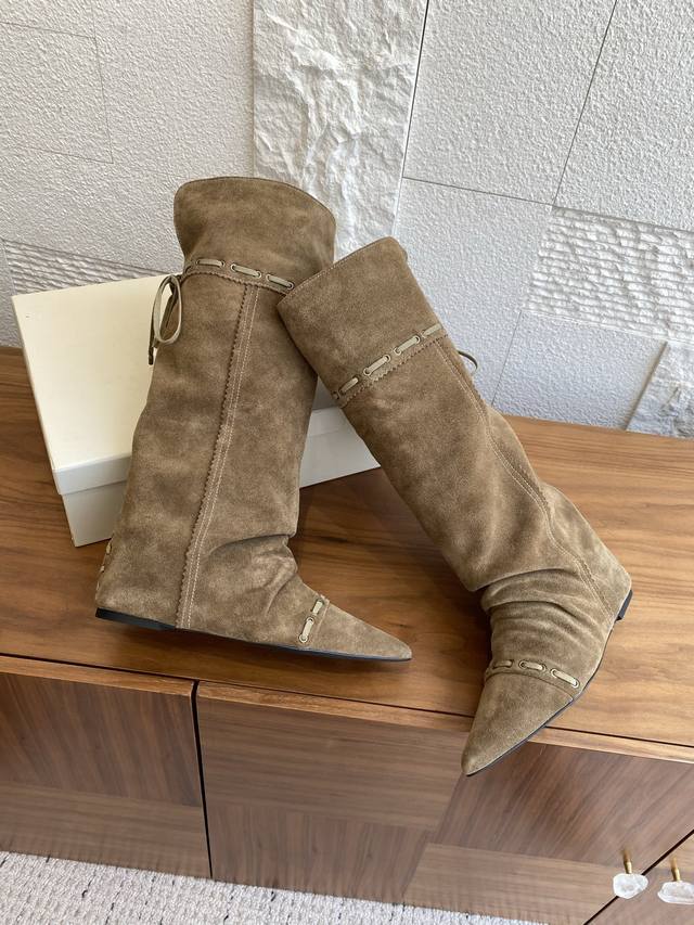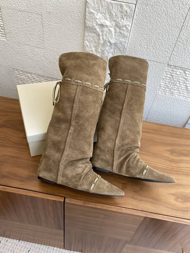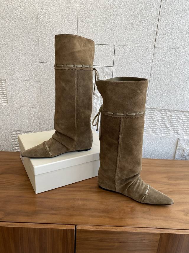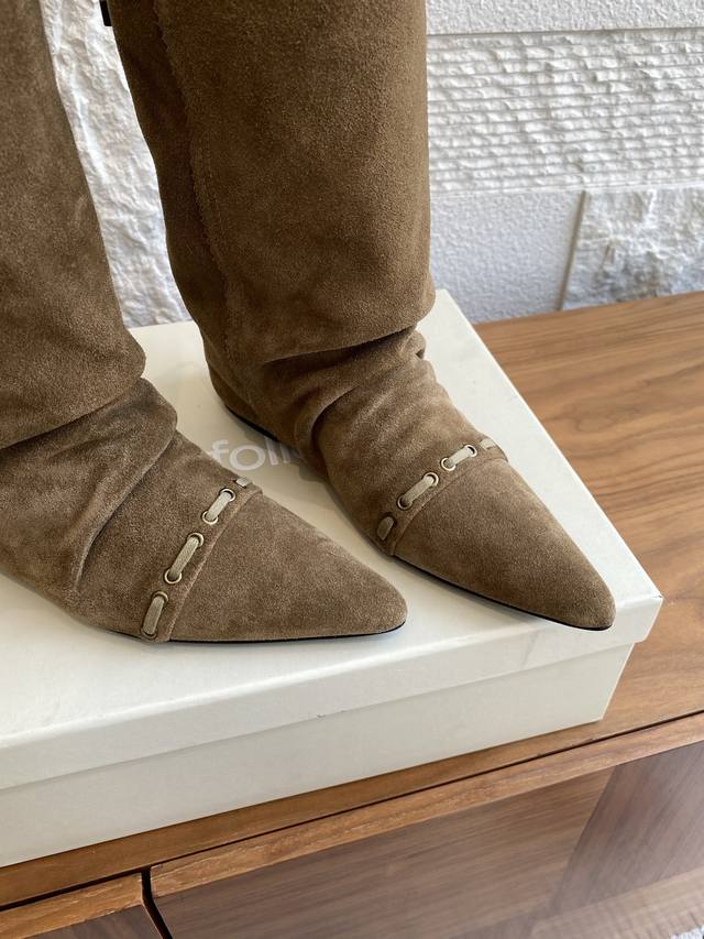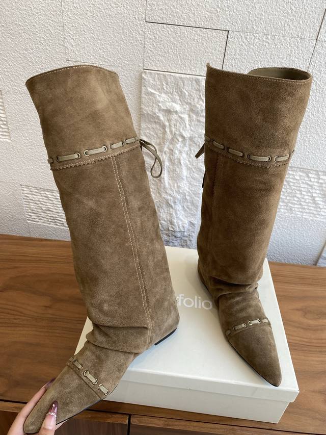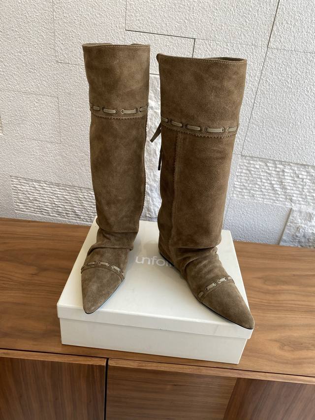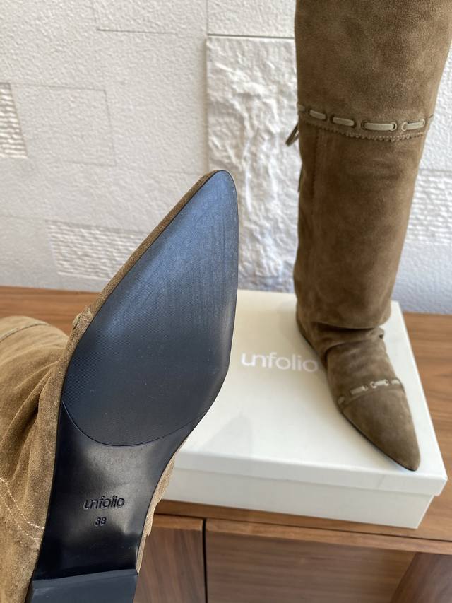 顶级版本: Unfolio 2025 早秋新款 及膝靴 可折叠两穿 尖头 长靴 Sienna 堆叠感及膝靴,黑色甄选小牛皮,皮质光滑细腻,纹理目然流畅,触感紧实且富有光泽,呈现低调优雅的质感;反毛牛皮款则自带慵懒随性气质,绒面触感柔和温润,随穿着愈发贴合足部,尽显松弛自在的风格。内里均采用高弹织物材质,春夏季节穿着不闷脚,秋冬包裹感拉满,兼具保暖性与舒适亲肤性。特别加入3Cm 隐形内增高设计,增高不突兀,既修饰腿部线条,又避免普通增高鞋的笨重感,久穿不累。鞋底选用超软橡胶材质,柔韧度优异,能随步伐灵活弯曲