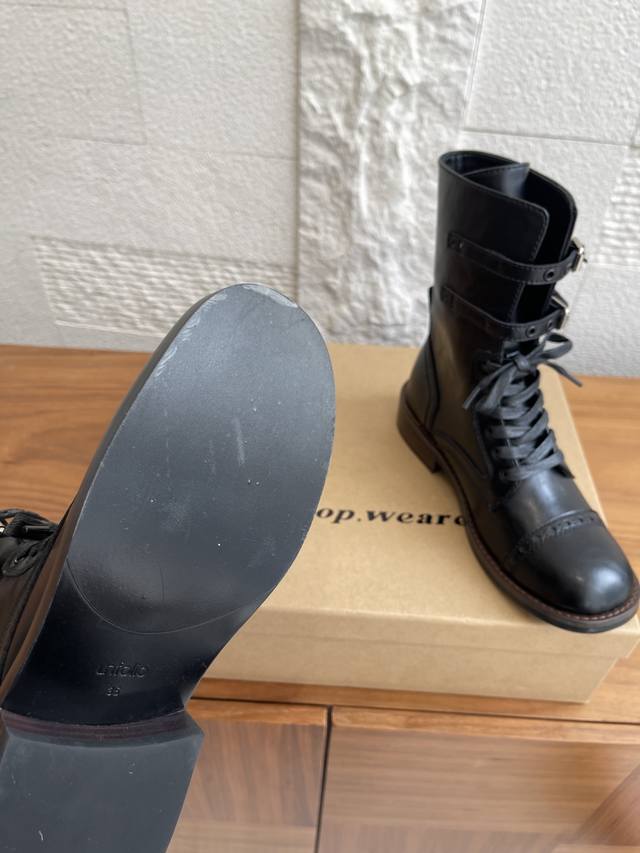 顶级版本: Unfolio 2025 早秋新款 Eloise金属搭扣 经典复古系带 中筒靴 短靴 Ehoise 系带搭扣短靴以经典 M1943作战靴为蓝本,它以硬朗高腰、牛皮鞋面与橡胶鞋底为标志,经战后改良持续风靡。Eloise设计保留经典高腰双扣带,弱化军事硬朗感,融入复古文艺基因。鞋面选择除了单一牛皮外,创新用羊毛呢与牛皮拼接,柔和材质碰撞出层次感,适配女性穿搭的细腻审美;皮质手工沿条加固鞋型,橡胶鞋底保留抓地优势同时轻量化处理,将军靴经典元素与手工皮鞋工艺融合。既借复古轮廓致敬历史,又以羊毛呢拼接、