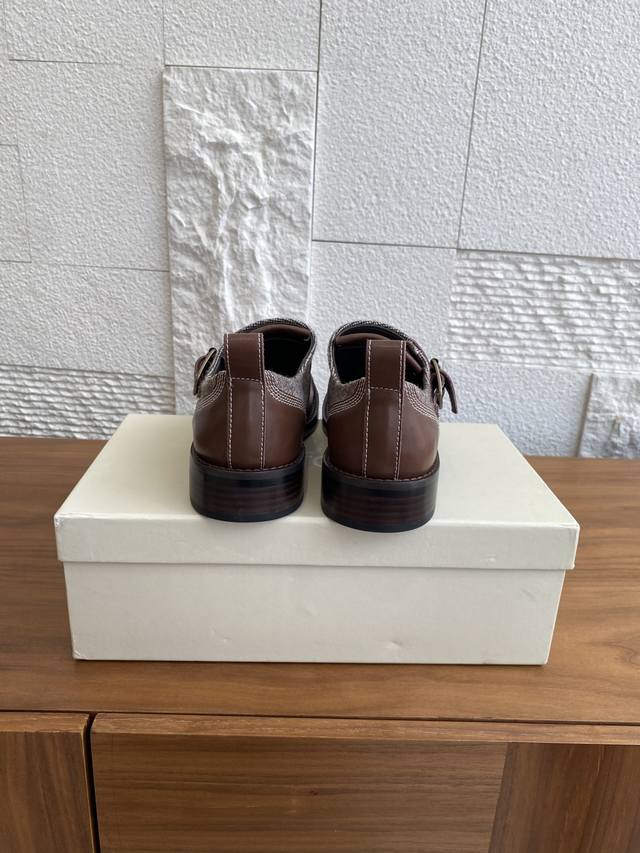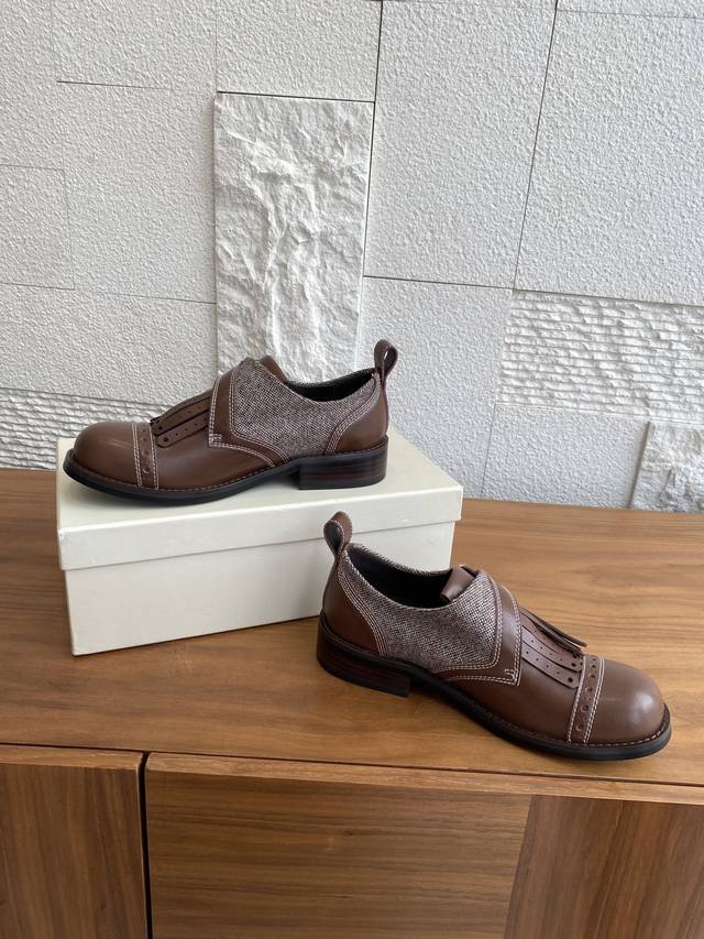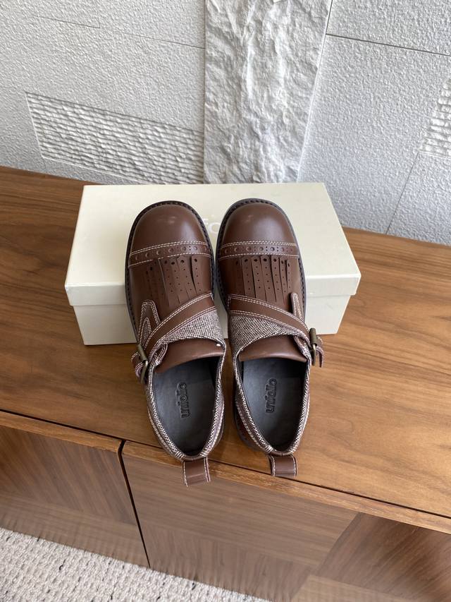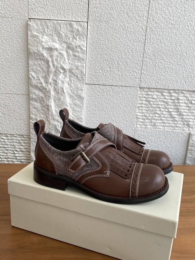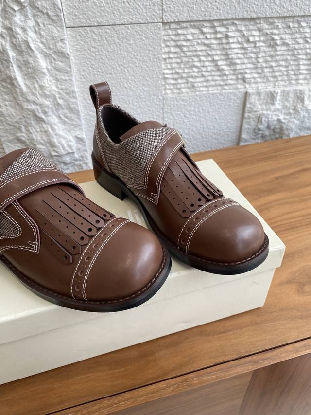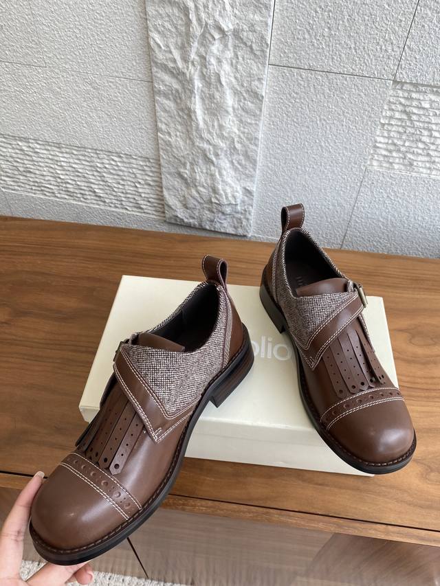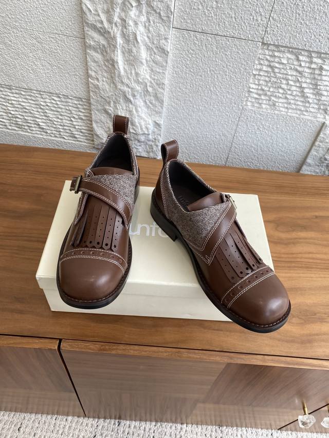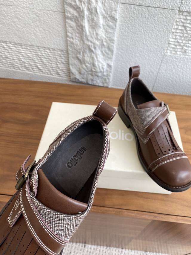 顶级版本: Unfolio 25Ss 早秋新款 复古塔扣流苏 孟克鞋 乐福鞋 Unfolio Eloise 孟克鞋以材质匠心诠释复古格调。黑色树膏皮保留原生蜡质光泽与肌理,随岁月生温润包浆;古铜棕色款以头层牛皮拼接同色系羊毛混纺毛呢,粒面纹理与格纹毛呢交织秋冬质感。内里按配色差异化设计,分别采用牛皮和柔滑羊皮。鞋底工艺突出,皮料沿条超绝质感,皮料包裹方跟搭配3.5厘米科学高度,底部覆厚实橡胶,兼顾传统制鞋美学与行走舒适度,让复古质感与实用功能浑然一体。 面料:进口头层牛皮 内里 垫脚:进口牛皮 大底:原版