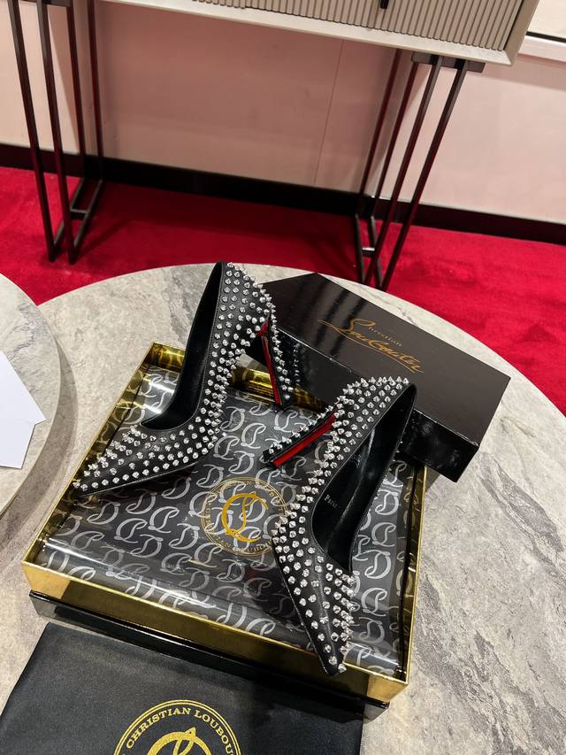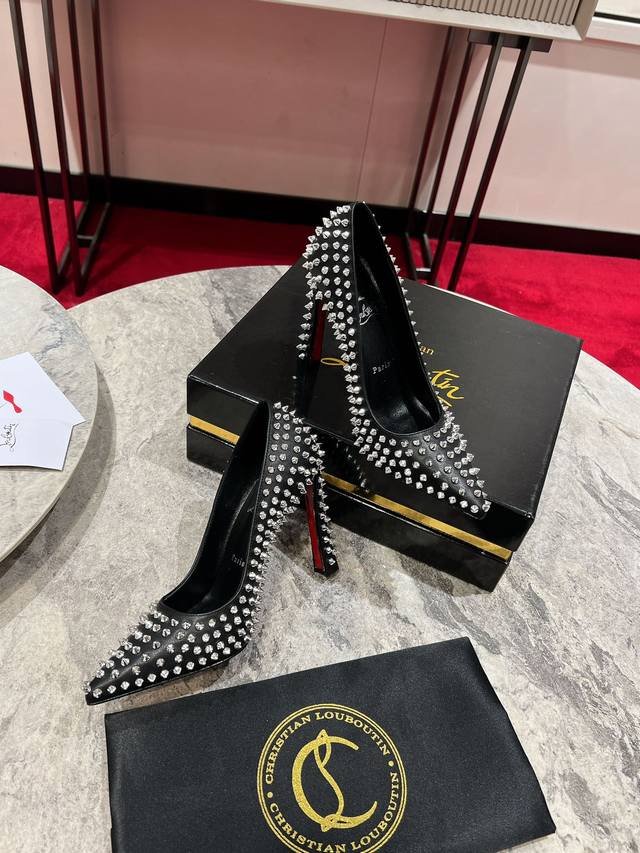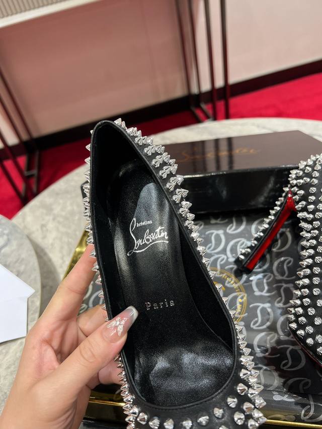 香蕉跟 满钉单鞋 W. 它的像鸟喙一样尖。这款黑色纳帕皮革的精致款式拥有大胆的低剪裁仿真鞋,露出脚部。它有一个100毫米的斜跟和标志性的金属尖钉。 Size:34码-44码 34.40.41.42.43.44定做不退不换,43.44码50 跟高:10Cm 颜色:黑 银