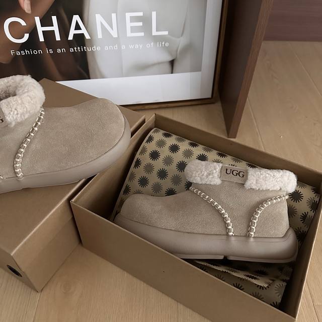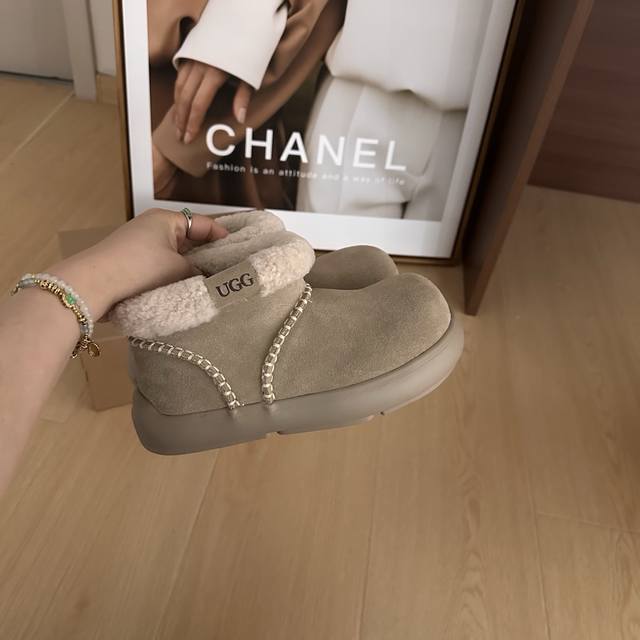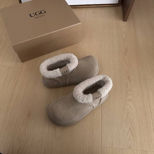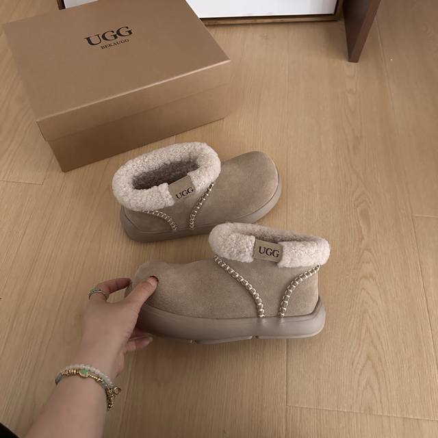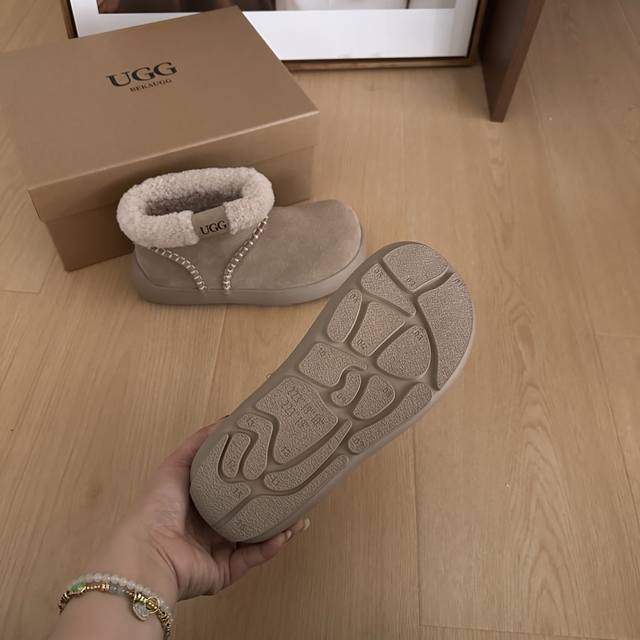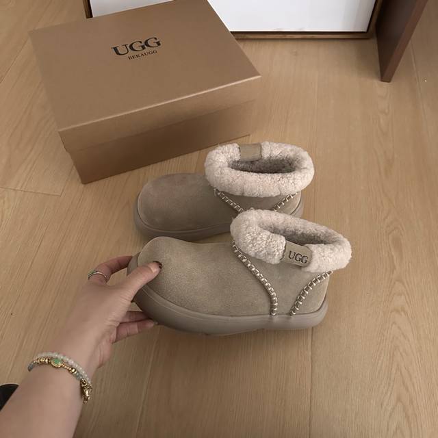 工厂p价p Ugg 2025秋冬新款防寒保暖系带皮毛一体女短靴 明星同款拼色厚底圆头一脚蹬机车骑士雪地靴...