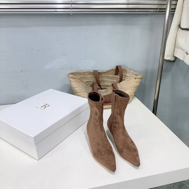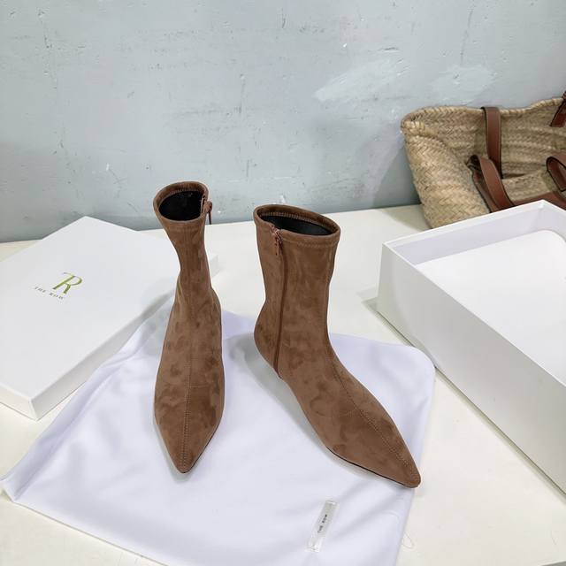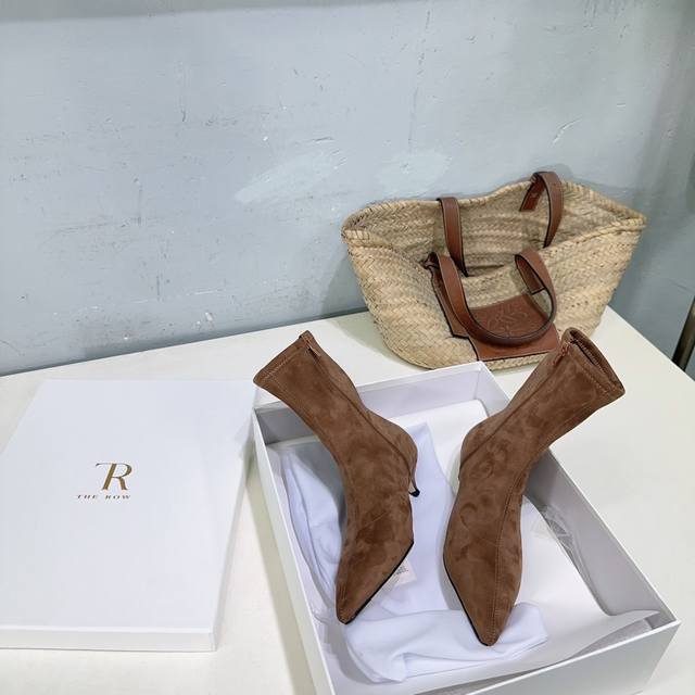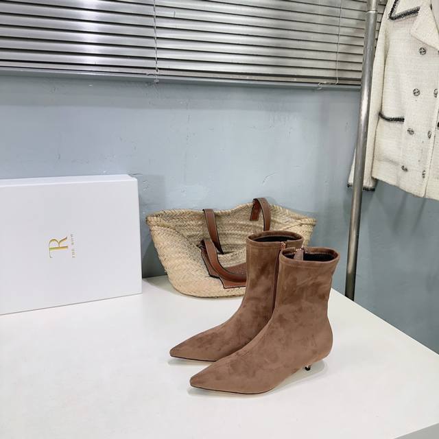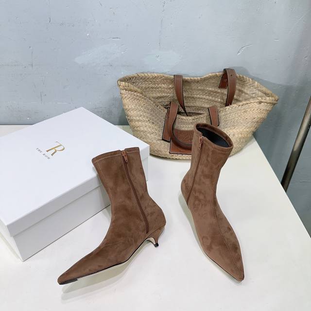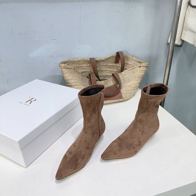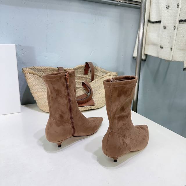 高品质出厂矮 !The Row 2025秋冬新款简易Tr松紧弹力尖头短靴小猫跟长靴! 这双长靴呈现出优雅又不失个性的风格,结合了时装靴的精致感与一定的时尚先锋性,适合搭配多种风格的服装,从简约的日常装到个性的晚宴造型都能适配。 弹力绒面材质,这种材质不仅贴合腿部线条,能很好地修饰腿型,让腿部看起来更修长流畅,而且绒面材质自带一种高级的哑光质感,增添了靴子的奢华感与复古氛围。靴筒的高度属于中高筒范围,能够覆盖到小腿部分,对小腿线条有一定的包容和修饰作用。 鞋面定制弹力绒 内里弹力莱卡 垫脚羊皮 意大利进口真