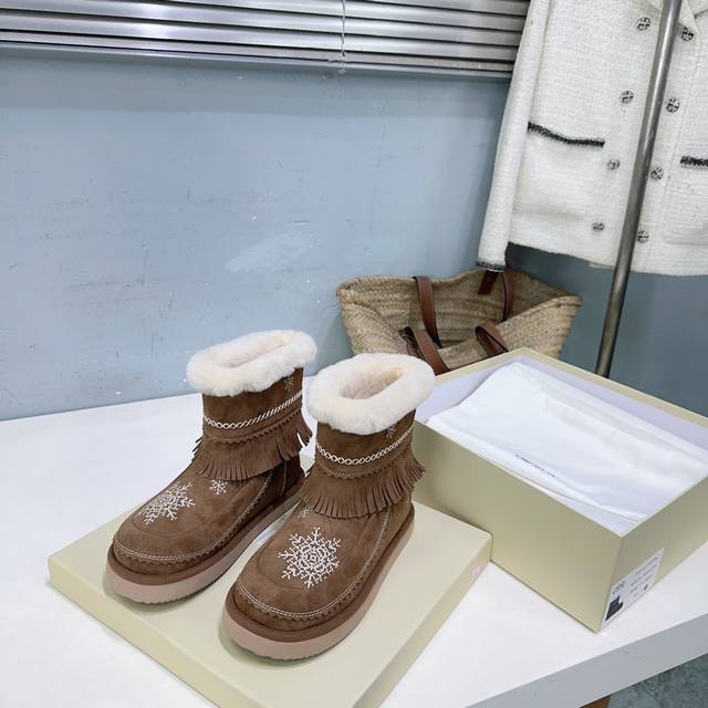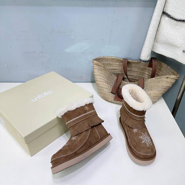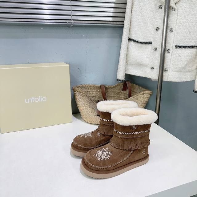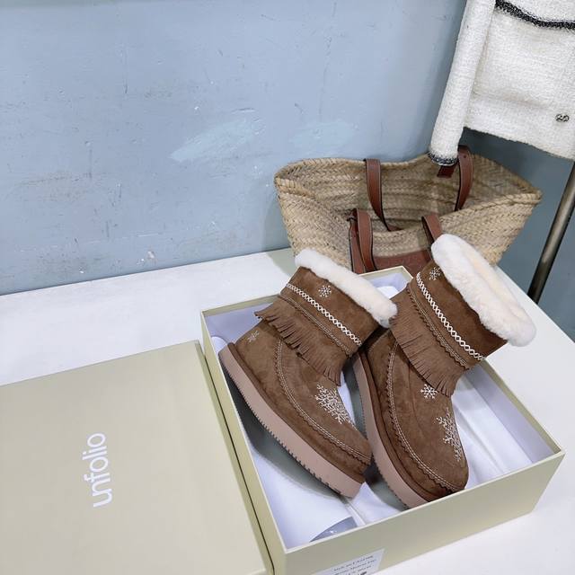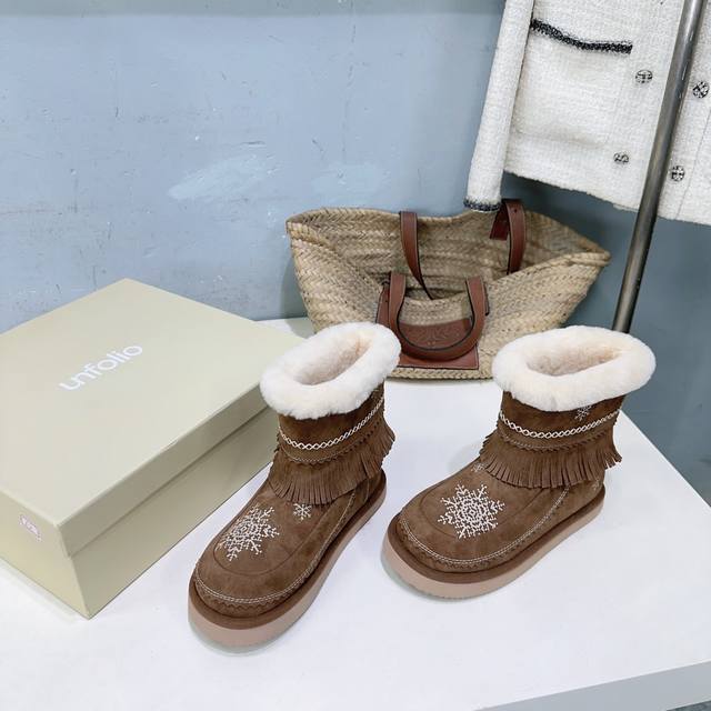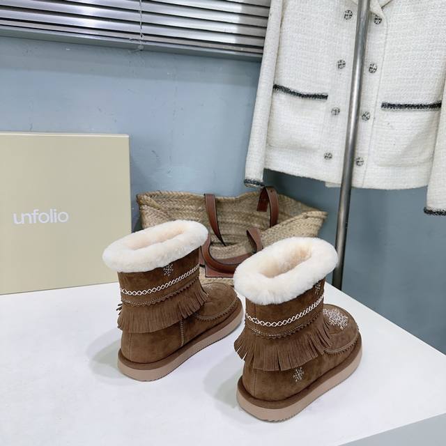 高品质出厂 !小众潮牌 Unfolio 25Ss秋冬新品羊羔毛雪地靴毛毛保暖厚底短靴!|把冬日时髦玩出花 DDD 流苏摇曳+雪花刺绣 麂皮与毛绒的温柔碰撞 奶茶色直接甜到心尖~ DDD 穿上它 在雪地也能走出时尚秀场感 这个冬天的温暖与时髦 被它一并承包 DDD 鞋面采用进口牛反绒 DDD 内里垫脚进口羊毛 DDD 原版开模橡胶大底 DDD 码数:35-41 40.41定不退换 DDD 配原版包装 DDD