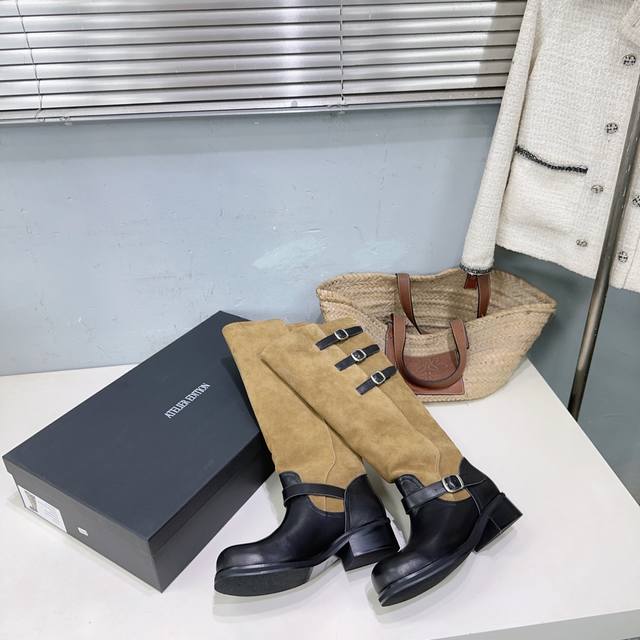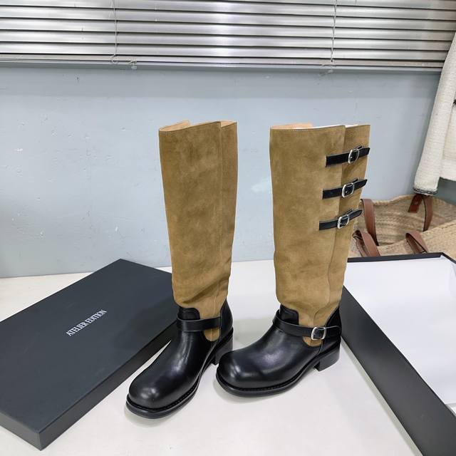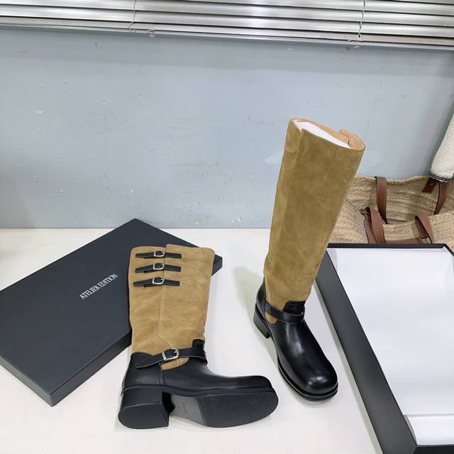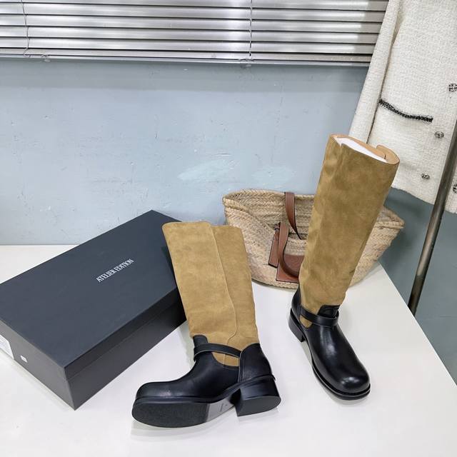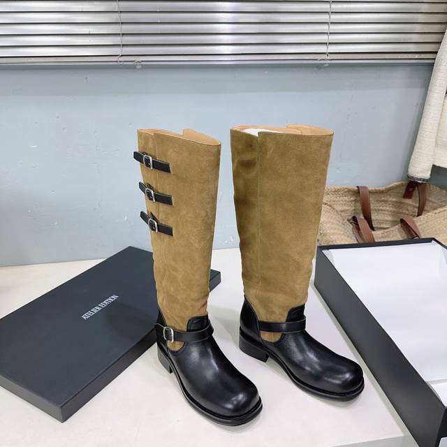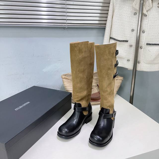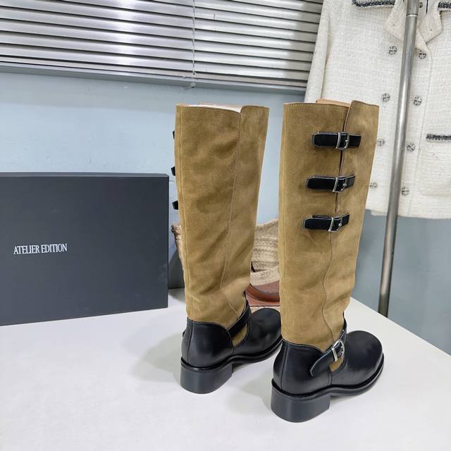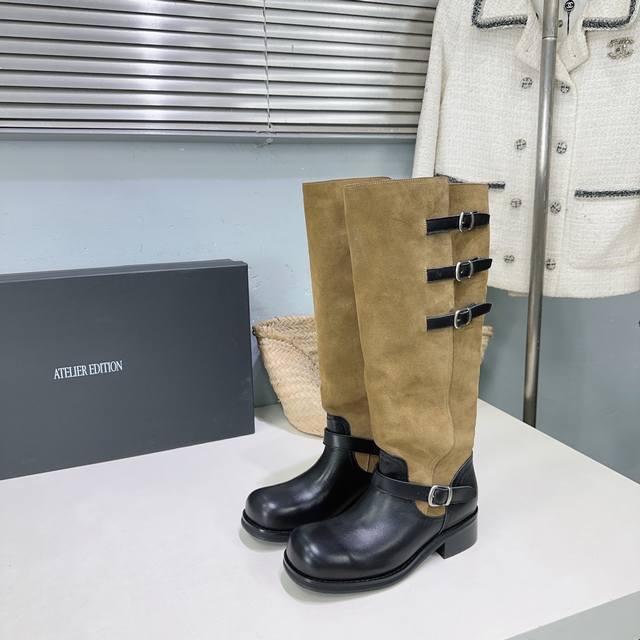 高品质出厂 !小众潮牌Atelier Edition25Ss秋冬新品韩国风复古扣带粗跟圆头拼色长靴骑士靴! DDD 松弛感非常强的一款时尚拼色韩风穿搭! DDD 这双长靴把复古与朋克揉成高級感。秋冬上脚軽軽松松拿捏,都能让你风格瞬间出圈~棕色长靴穿出不撞款的高级感氛围感也满满。 DDD 鞋面采用进口小牛皮拼接牛反绒 DDD 内里垫脚羊皮 DDD 原版开模大底 DDD 跟高:约4Cm DDD 码数:35-40 40订做不退换 DDD 配原版包装 DDD