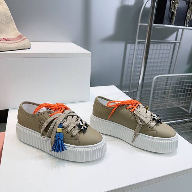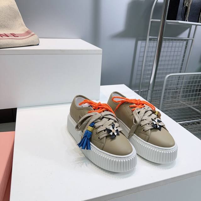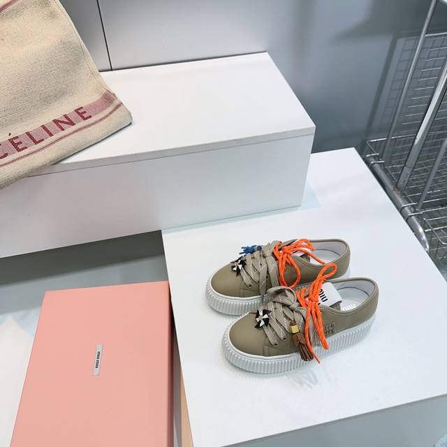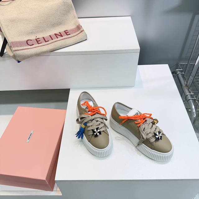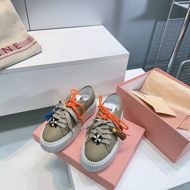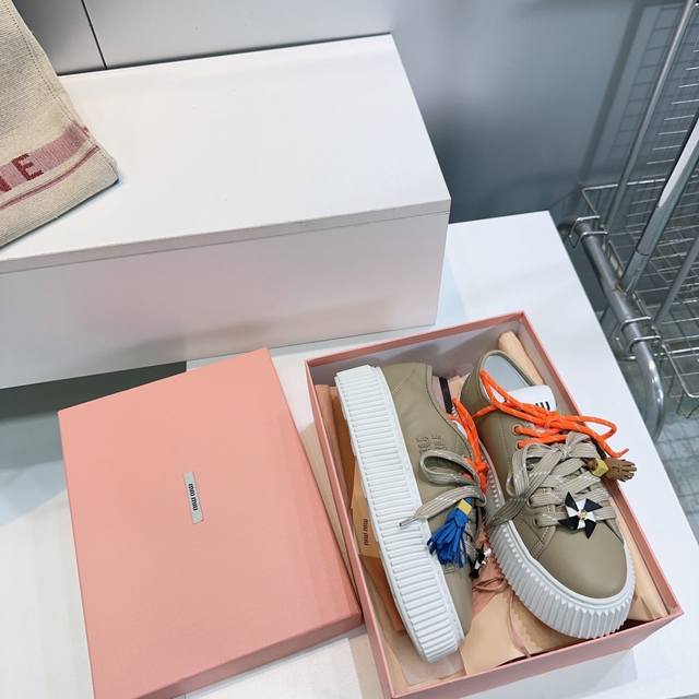 高品质出厂 !顶级品质缪缪Miumiu25秋冬专柜主打最新款松糕厚底彩色系带休闲小白鞋饼干鞋 高级感十足!国内外博主刷爆的一款,复古又时髦 上脚美炸了!官网主推款★ 简约的格板设计,彩色系带、鞋侧Logo装饰和极具辨识度的鞋舌,上脚超级阳光青春 少女味一足,能把休闲鞋打造的如此甜美,只有M才能做到了,上脚气场一足,随意搭配,长裙,短裙,短裤,休闲系列都能穿出与众不同的风格,减龄效果非常明显,高贵气质百搭型! 鞋面采用进口小牛皮 牛反绒 内里垫脚羊皮 原版开模橡胶大底! 底厚:约4.5Cm 码数:35-40