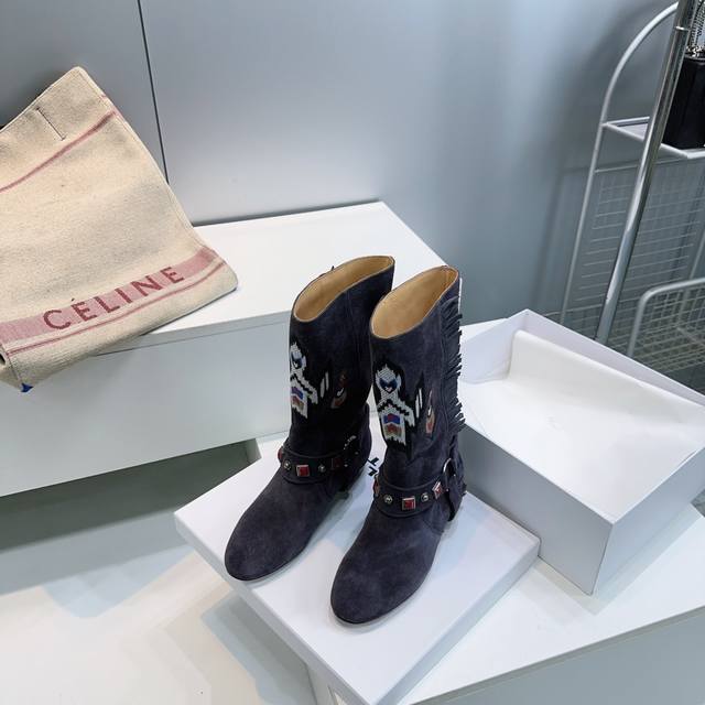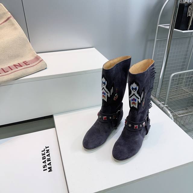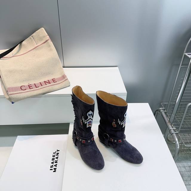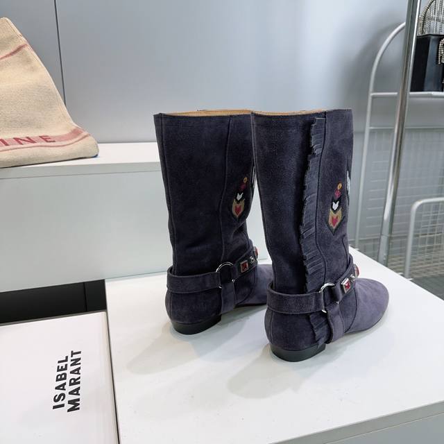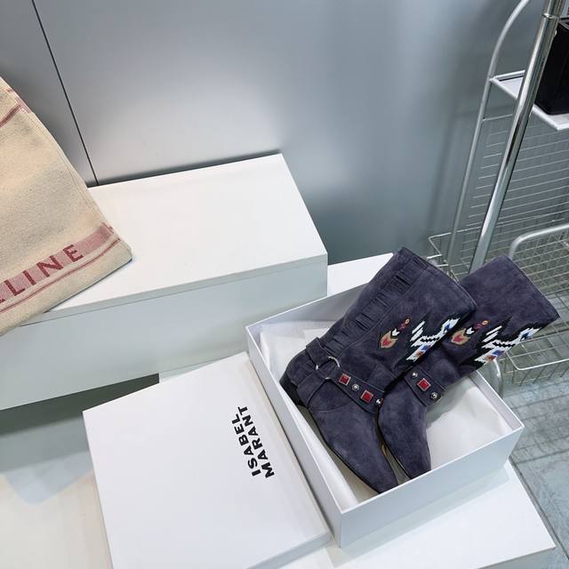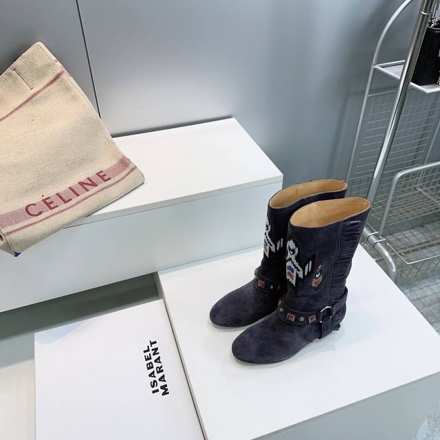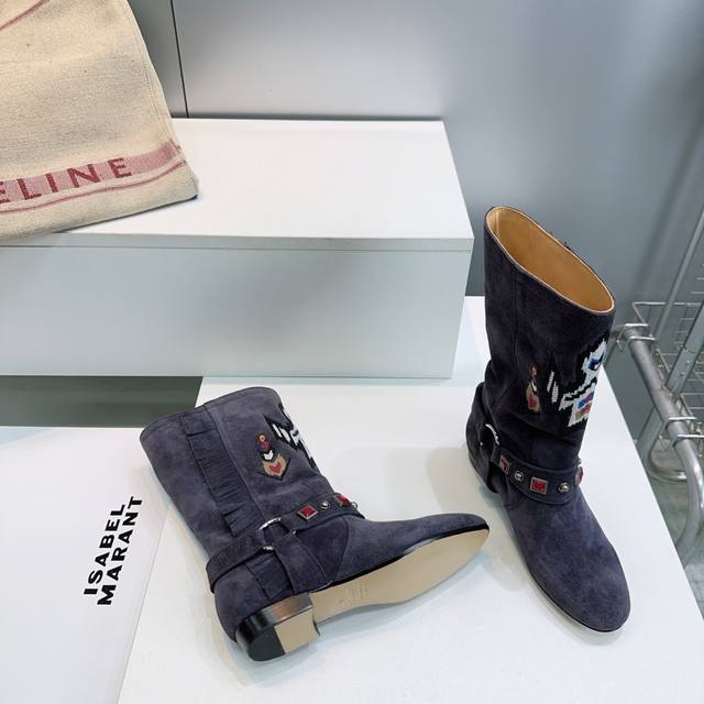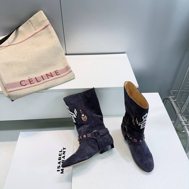 高品质出厂 !顶级品质Isabel Marant 伊莎贝尔25Ss秋冬名族风刺绣图案宝石五金扣圆头平跟一脚蹬短靴中靴!满满家族风格的一款经典女款拼接中短靴标准的欧美风格代表一个用极简风格来陈述一对靴子的牌子必不可少的一款简单靴~诠释百搭的味道!灰军绿非常高级的颜色,鞋面高丝光牛反绒,靴身超级柔软舒适,及踝的高度刚刚好,四季可搭,上脚帅气利落,慵懒风玩到了极致,酷酷女孩的时尚单品。 DDD 鞋面采用原版进口牛反绒 DDD 内里垫脚水染牛皮 DDD 意大利进口原色真皮大底 DDD 码数:35-41 40 41
