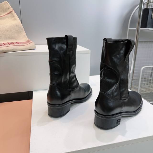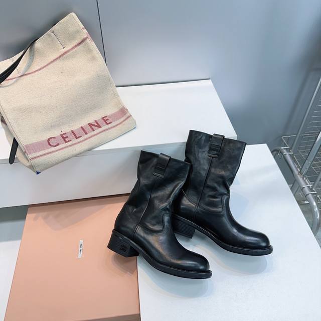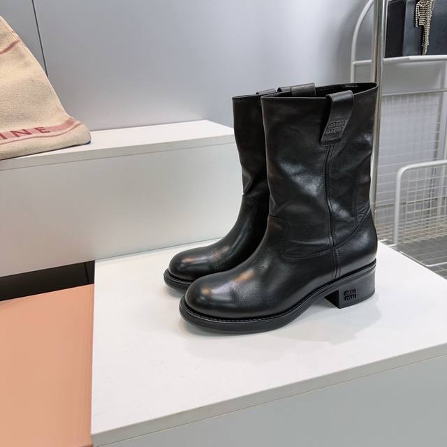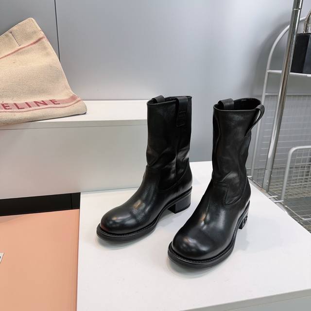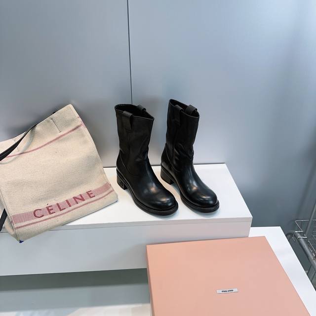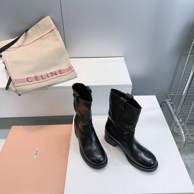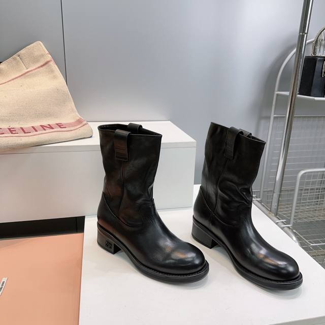 高品质出厂 !顶级品质Miu Miu 缪缪25Ss秋冬新品水染牛皮做旧复古双耳宽筒粗跟短靴中靴 秋冬走秀新款短靴! 今年最值得入手的靴子 没有之一!超多网红明星上脚 Miu家今年秋冬确实泰酷辣 秋冬限定款 专柜非常难买 看着很硬的样子 其实非常软巨好穿!脚感超赞! 靴筒宽大 不管腿粗腿细 都能穿出宽松感而且非常显腿直!!朋克风十足! 鞋面做旧擦色小牛皮 内里垫脚水染牛皮 原版开模橡胶大底 码数:35-40 40定制不退换 配原版包装