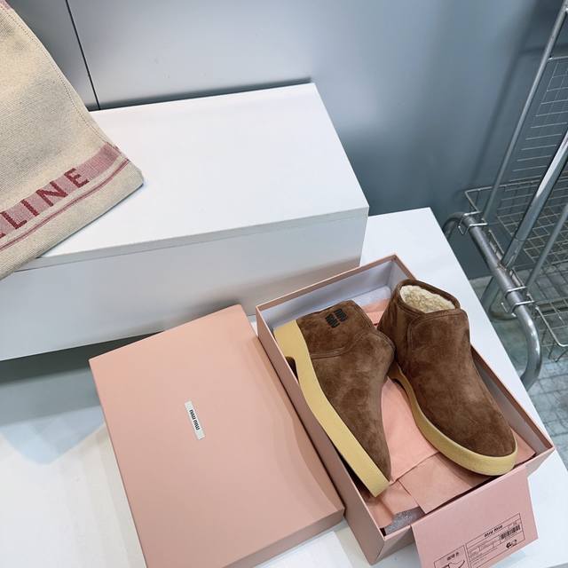 高品质出厂 !顶级品质Miumiu缪缪25Ss秋冬最新羊毛款保暖雪地靴圆头简易短靴低帮裸靴!蠢萌蠢萌的可爱到爆 DDD Miu家冬季保暖雪地靴 果然没让人失望, 一眼就被吸引住的蠢萌雪地靴,保暖舒适!全羊毛里质感真的绝了。迅速降温就是需要一双它呀! DDD 鞋面进口磨砂牛皮 DDD 内里垫脚进口羊羔毛 DDD 原版开模橡胶底大底 DDD 码数:35-40 40定制不退换 DDD 配原版包装 DDD