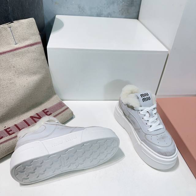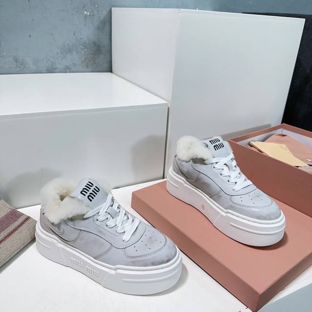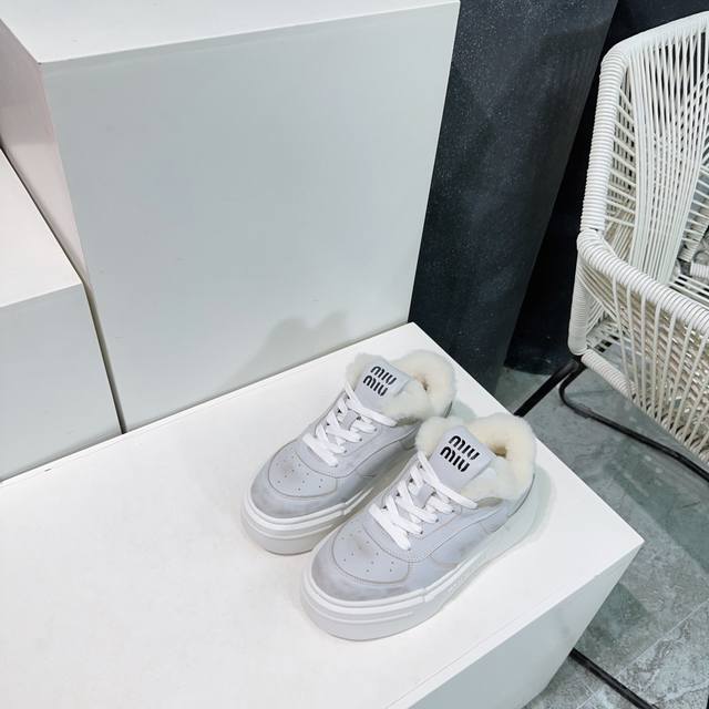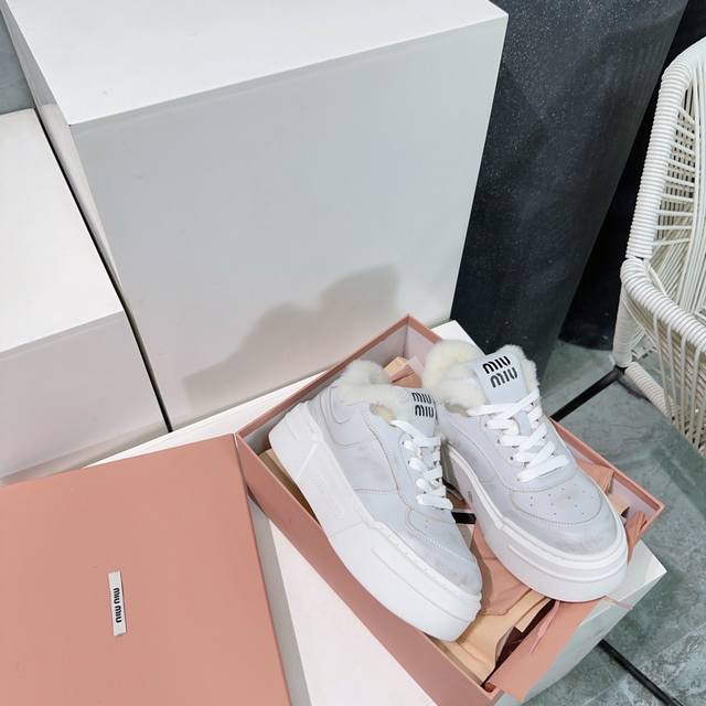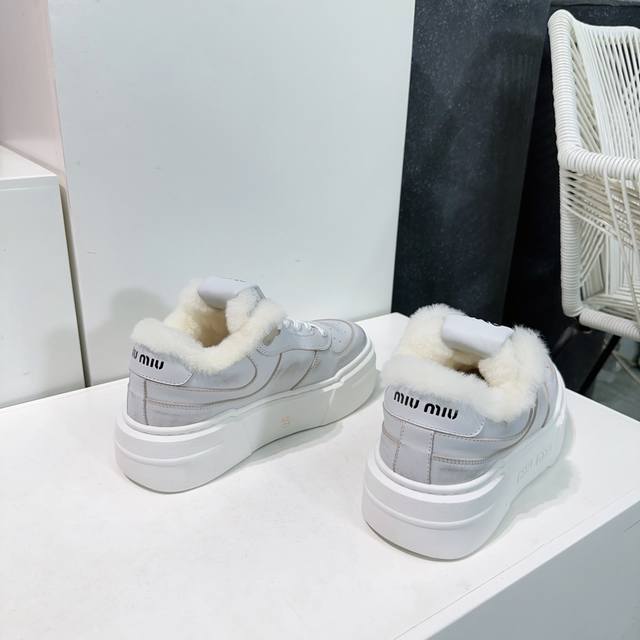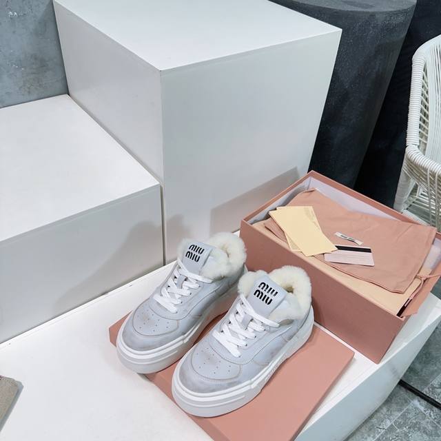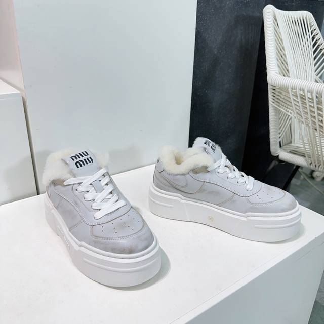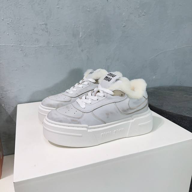 高品质出厂 !顶级品质Miumiu25Ss秋冬新款小白鞋!来感受财阀千金的Miumiu毛毛小脏鞋休闲鞋! 新款保暖羊毛休闲鞋板鞋!一眼看中的毛绒绒复古小白鞋 奶里奶气的 秋冬的氛围感立刻拉满,羊羔毛超暖和,颜值兼备 Miu太懂女人心啦!!! 喜欢甜美温柔的宝子快去冲冲~ 减龄神器敲优雅敲可爱 瞬间拉长身高,显腿细 鞋面采用原版头层小牛皮,手工擦色做旧!质感原版一致! 内里垫脚采用进口顶级羊羔毛,触感柔软细腻!舒适保暖! 与灰色小腿袜真的很配哦 底厚:约4Cm 码数:34-40 40定做不退换 配原版包装