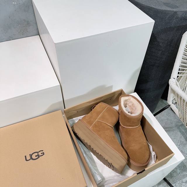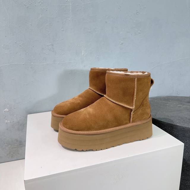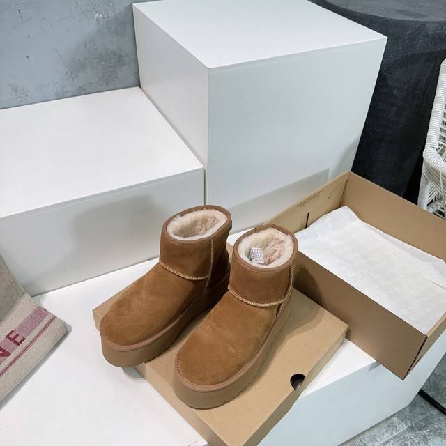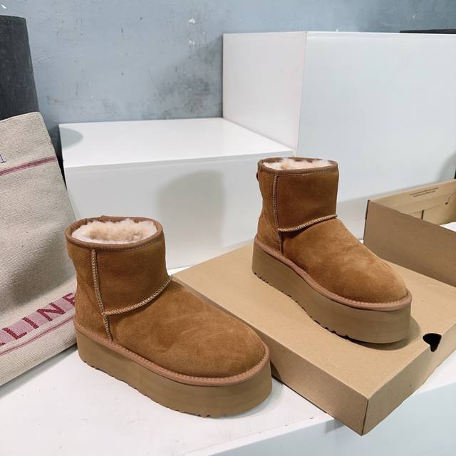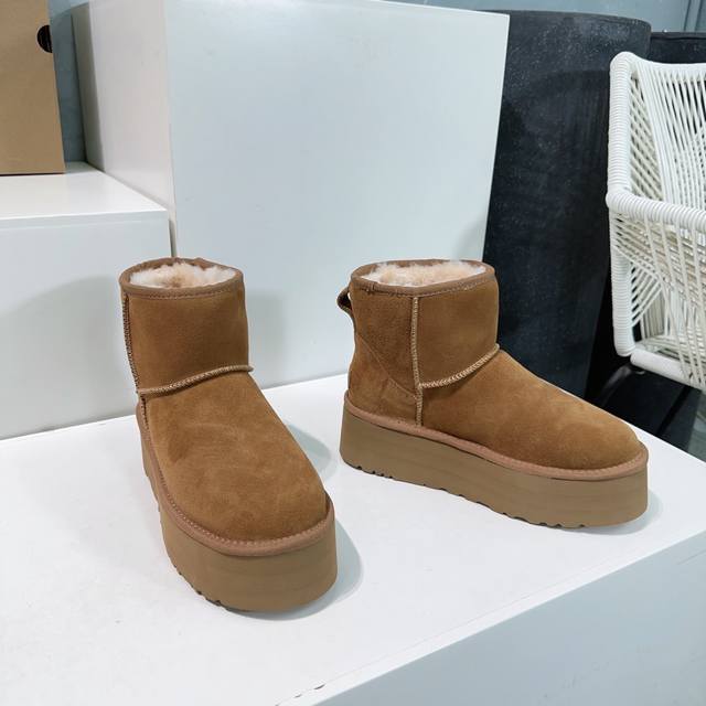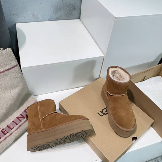 高品质出厂 !顶级品质Ugg油鸡鸡25Ss秋冬新款经典Mini厚底毛毛雪地靴 被Bella、Gigi种草的一款,火的爆炸,搭配一双堆堆袜,又高级又时髦,纯纯的美式穿搭,厚底尽显大长腿! 隆丰厚实皮毛一体!保真羊皮保暖舒适!Pvc发泡超轻大底,底厚约7Cm左右! 码数:35-41 40 41定做不退换 配原版包装