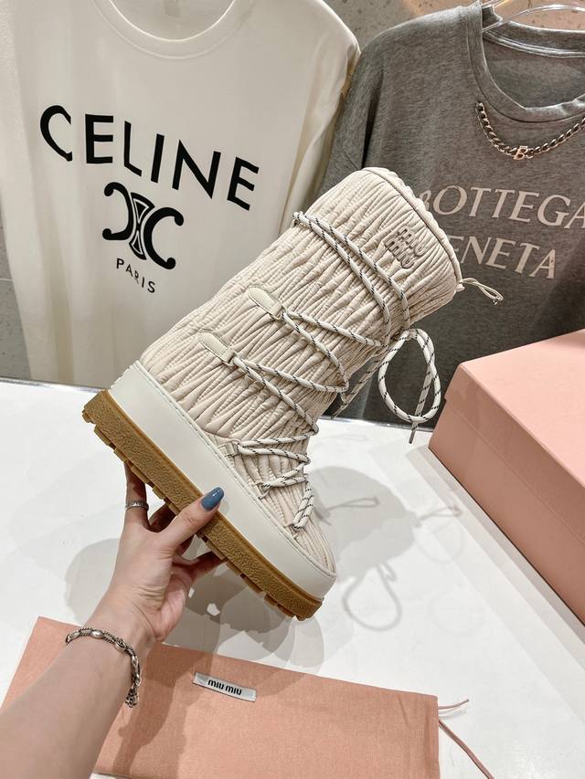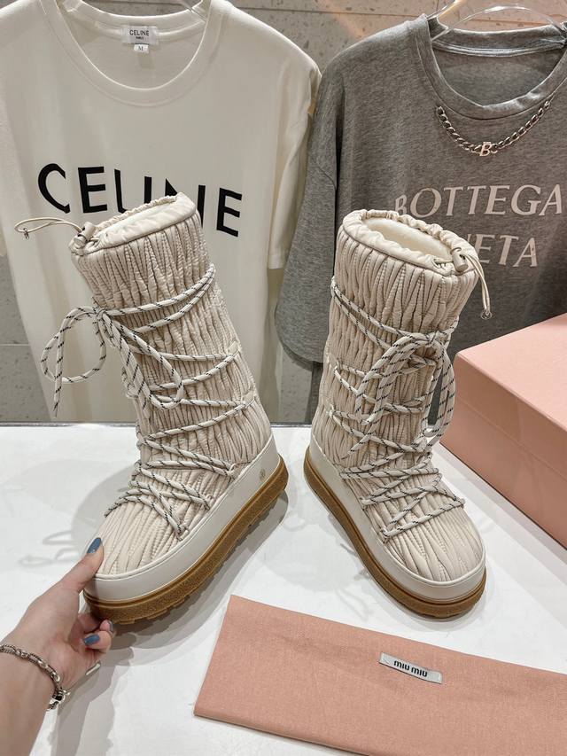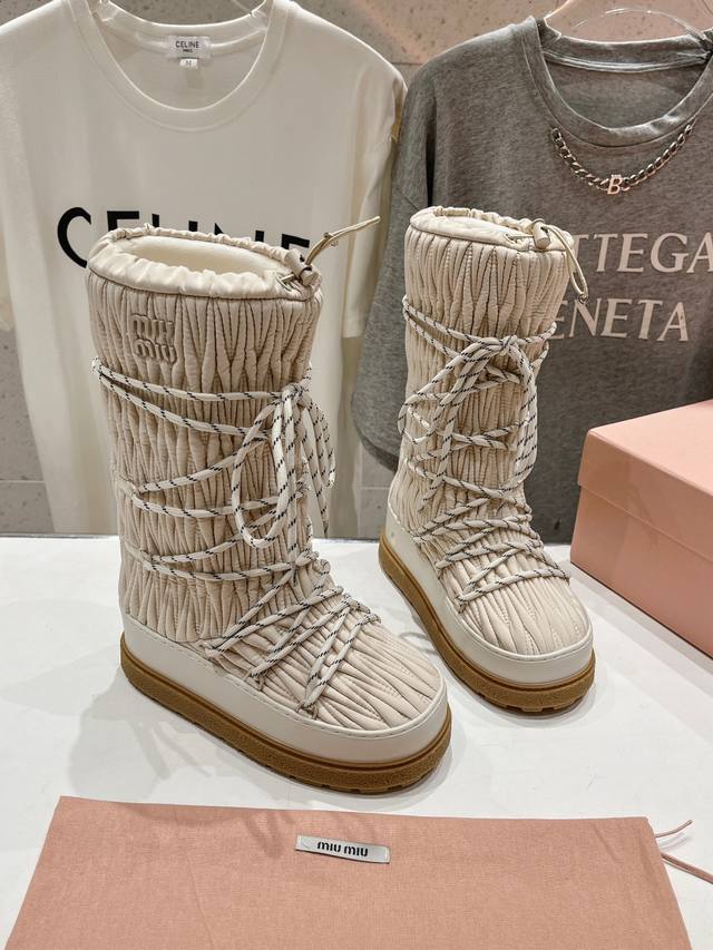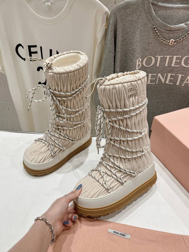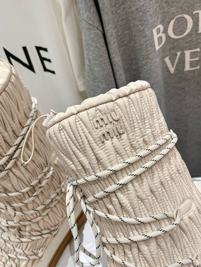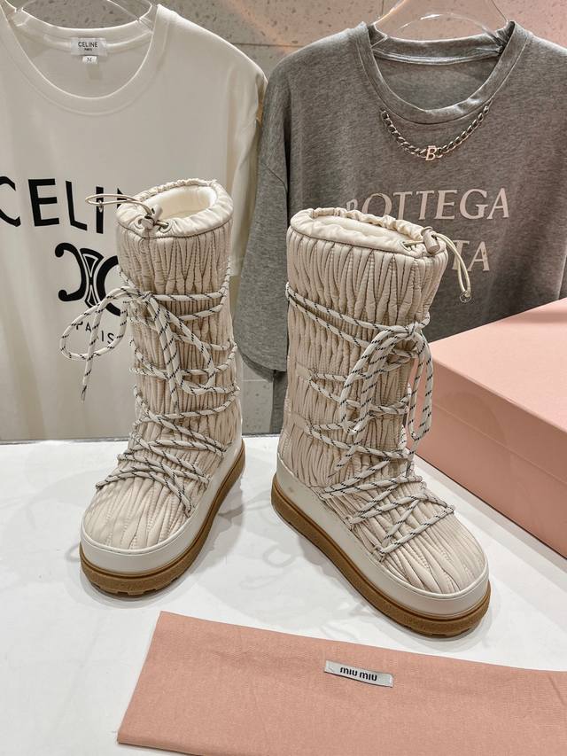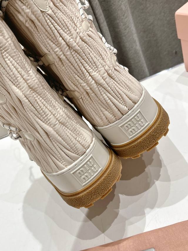 高版本出厂 Miumiu 缪缪24Ss秋冬新款系列,女士徽标尼龙华达呢雪地派对金属标双色厚底收缩系带羽绒雪地靴滑雪靴胖头靴! 有轻奢的内蕴品质,自带温暖的腔调,