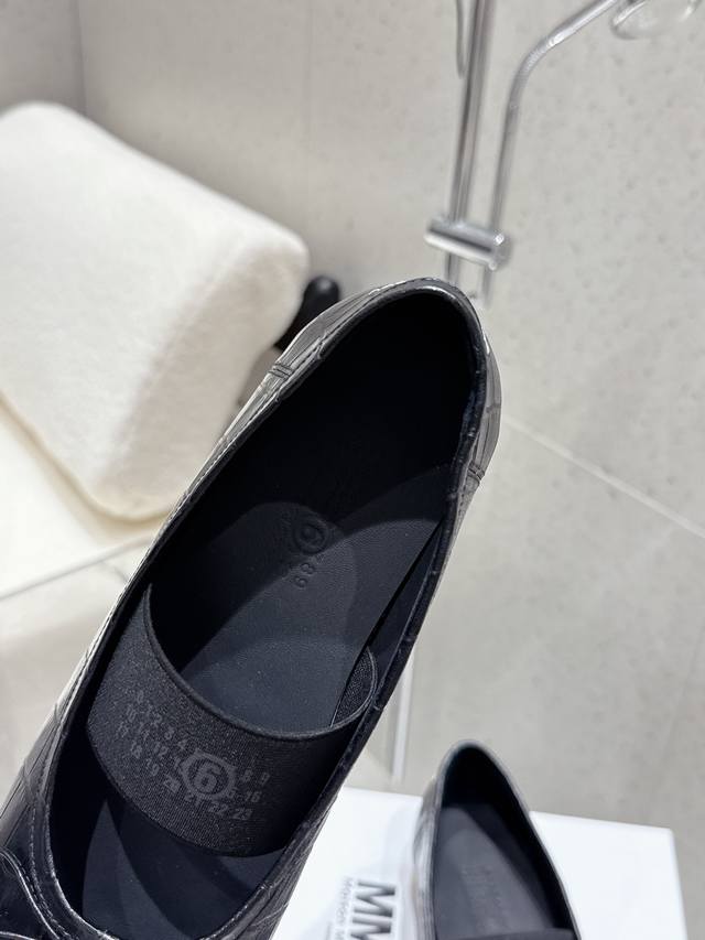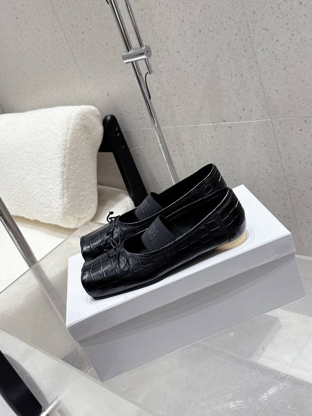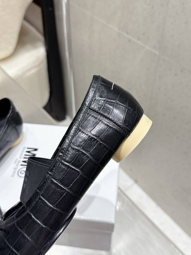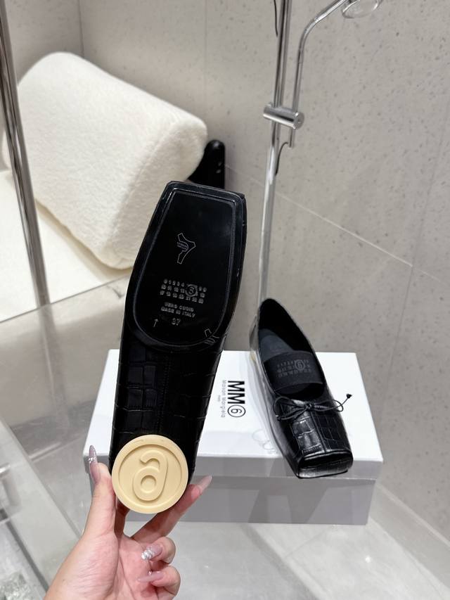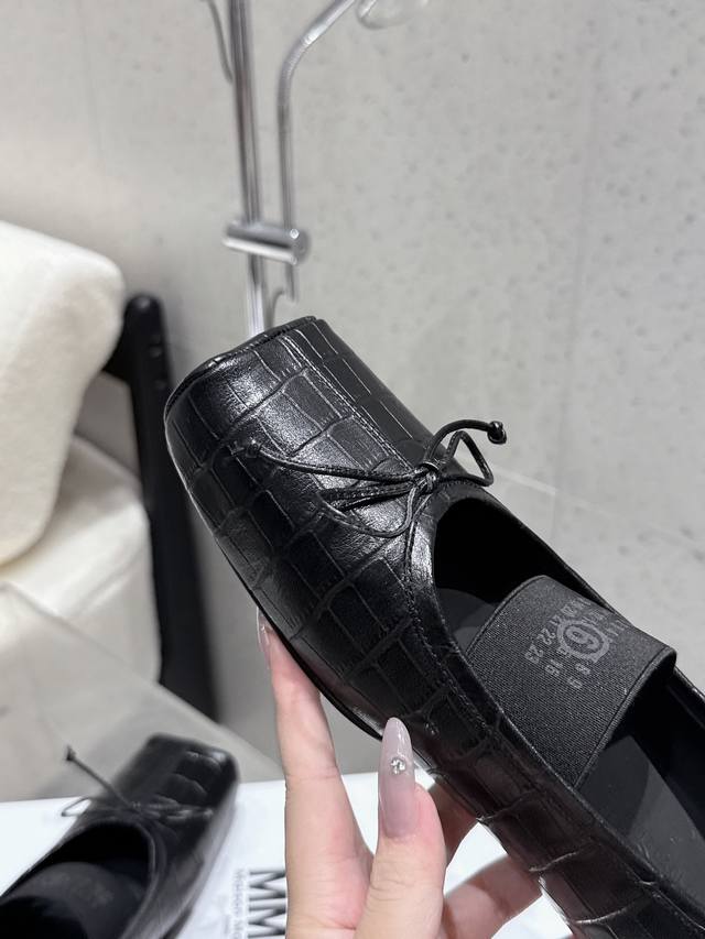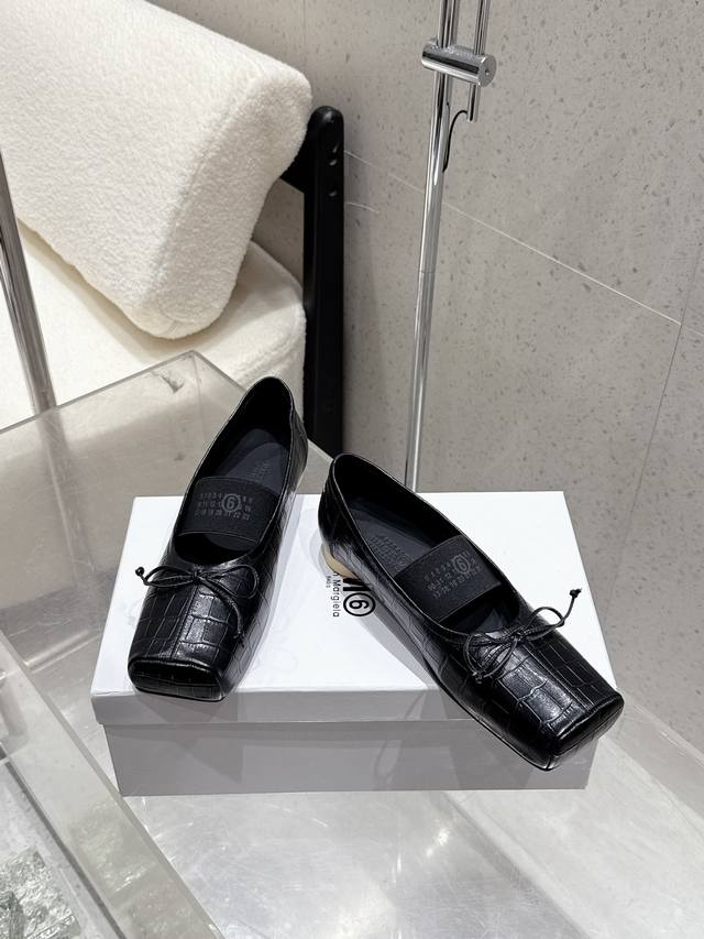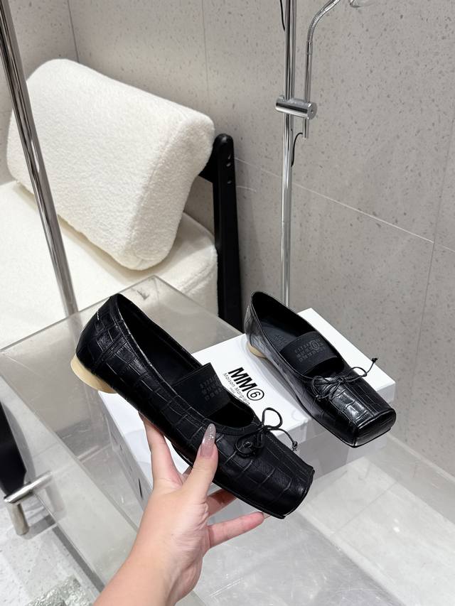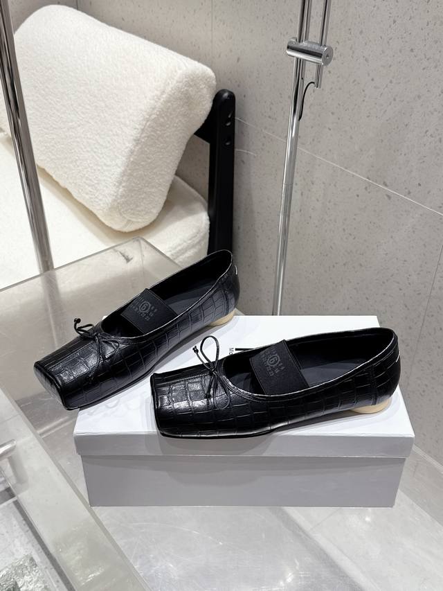 高版本出厂 Mm6马吉拉2025Ss新品最近超级火的方头平底玛丽珍芭蕾舞鞋 舒适度不用说 肯定会很舒服的 廓形 独具匠心的布料和对比材质的拼贴均是 Mm6 Maison Magical,值得期待的特色 这款芭蕾舞鞋采用很有质感的进口鳄鱼纹牛皮面料 方头的雅致和Logo松紧带 意大利真皮大底 简直绝绝子了 码数:35-39 40定做 配原版一致包装
