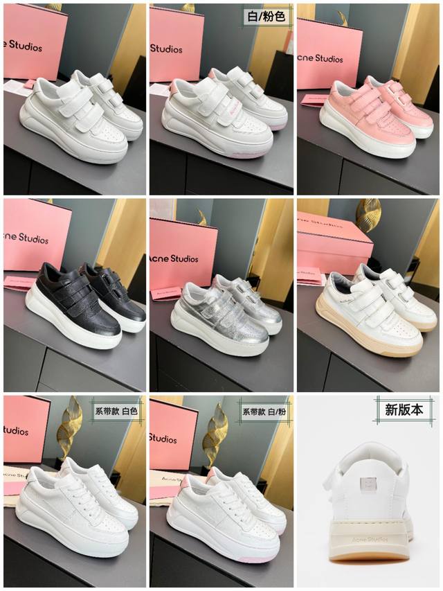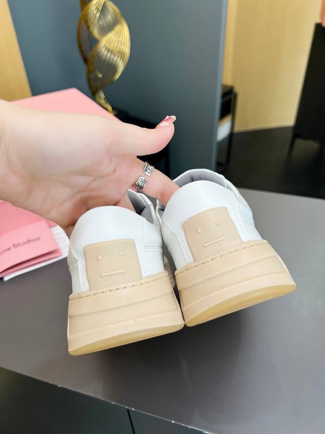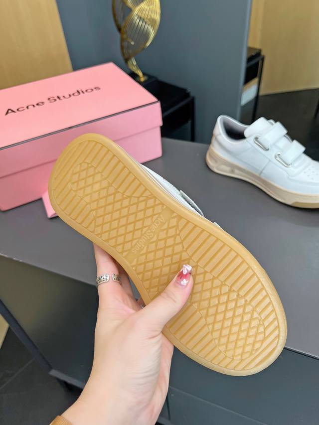 高版本 全套包装Acne Studios笑脸魔术贴小白鞋 DDD 马思纯同款厚底魔术贴小白鞋,好看又好穿 DDD 胖胖哒圆润鞋头带着一些呆萌和可爱 DDD 后跟处的小方脸莫名其妙就戳中了我的萌点 DDD 这款小白鞋的最大亮点是 DDD 穿脱方便这双鞋是魔术贴粘着穿的 DDD 是懒癌救星哈哈哈哈哈 DDD 鞋子的宽松可以通过粘魔术贴来调整 DDD 觉得松了就粘紧一点 紧了就粘松一点 DDD 收到试穿多调整几次 DDD 原厂底是复合材质,不是普通的橡胶,是牛筋底橡胶一体成型,更软更架耐磨,多次变折也不容易变形