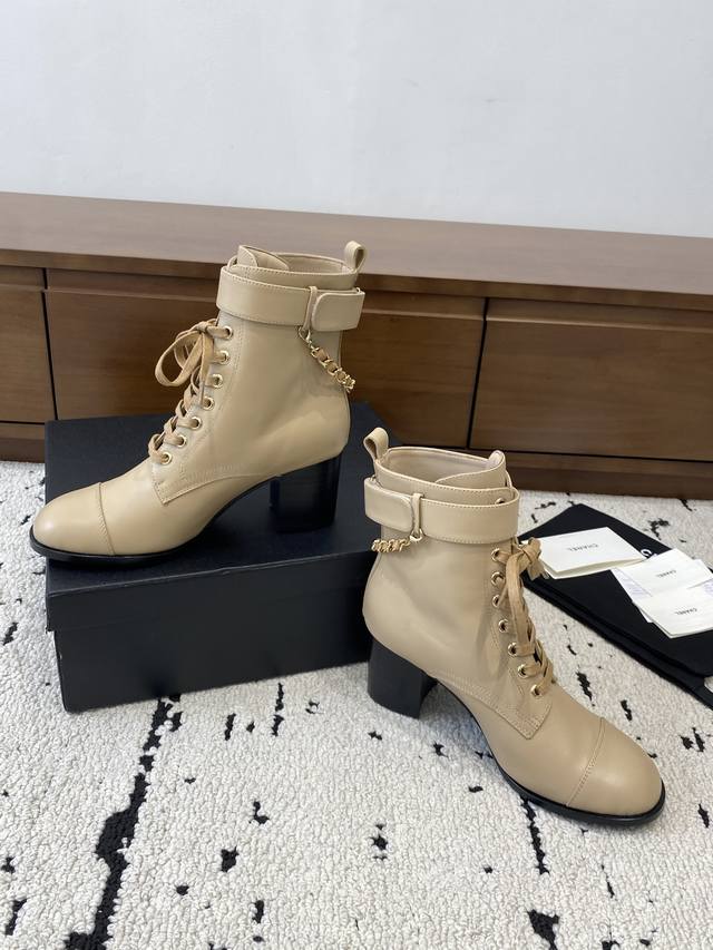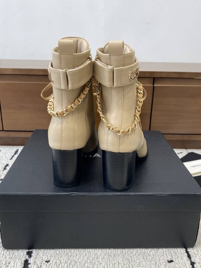 高版本 Chan**小香秋冬双C链条平底短靴小牛皮材质的鞋面,细腻且质感十足,原版开模五金扣饰彰显出优雅高贵的气质,是秋冬季的完美配搭。中跟设计,既显高挑身材,