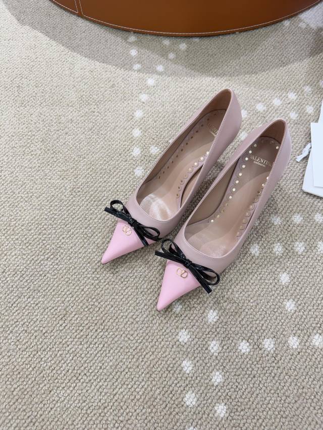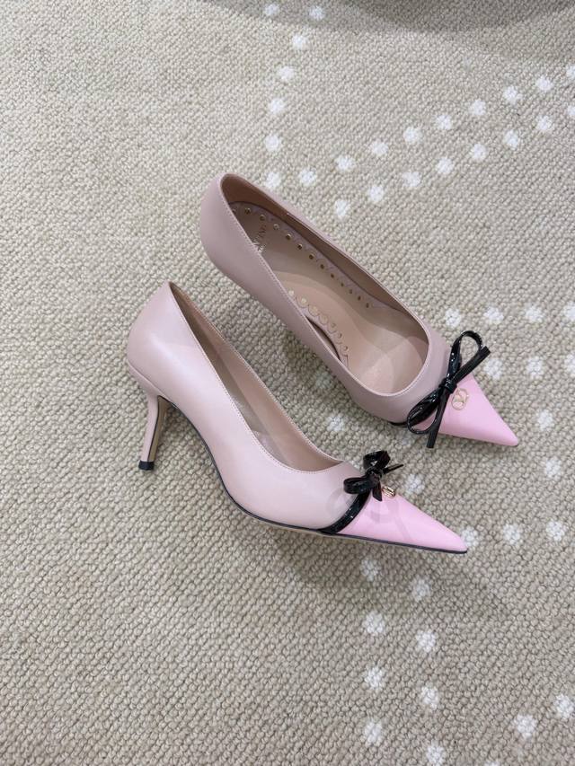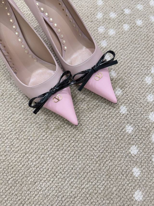 / 高版本 Vt 25春夏新款蝴蝶结撞色高跟鞋 -进口胎小牛皮面 羊皮内里 羊皮垫脚. 漆皮蝴蝶结装饰 Mini Vlogo点缀. 意大利真皮大底. 跟高:4.5C