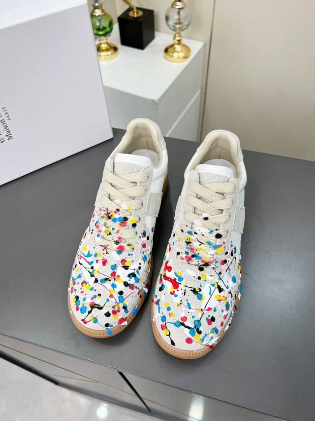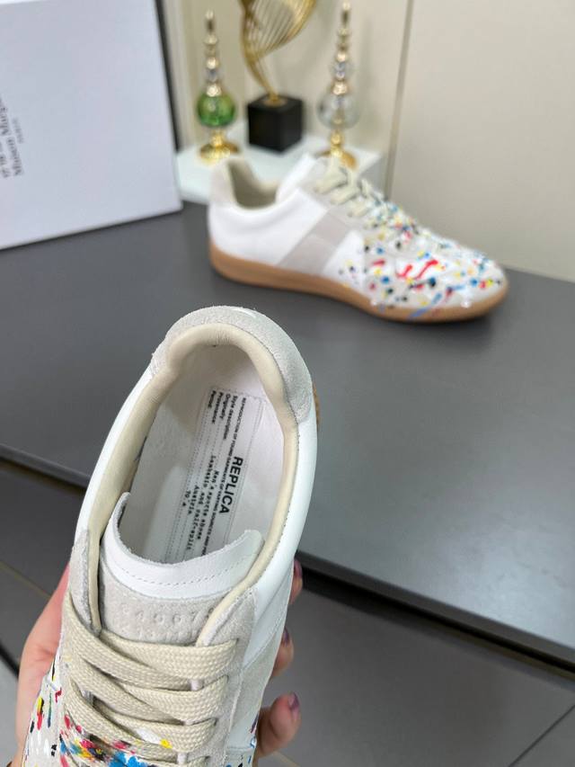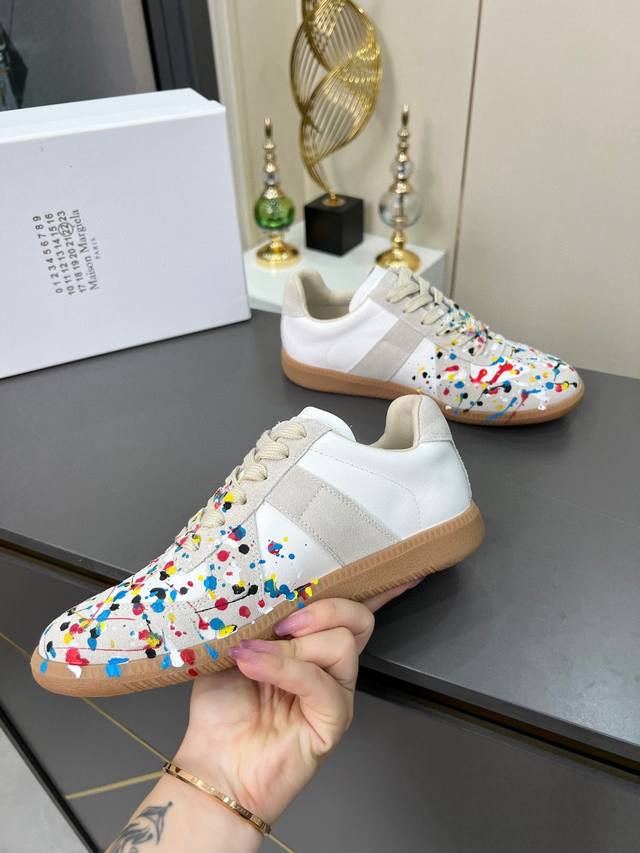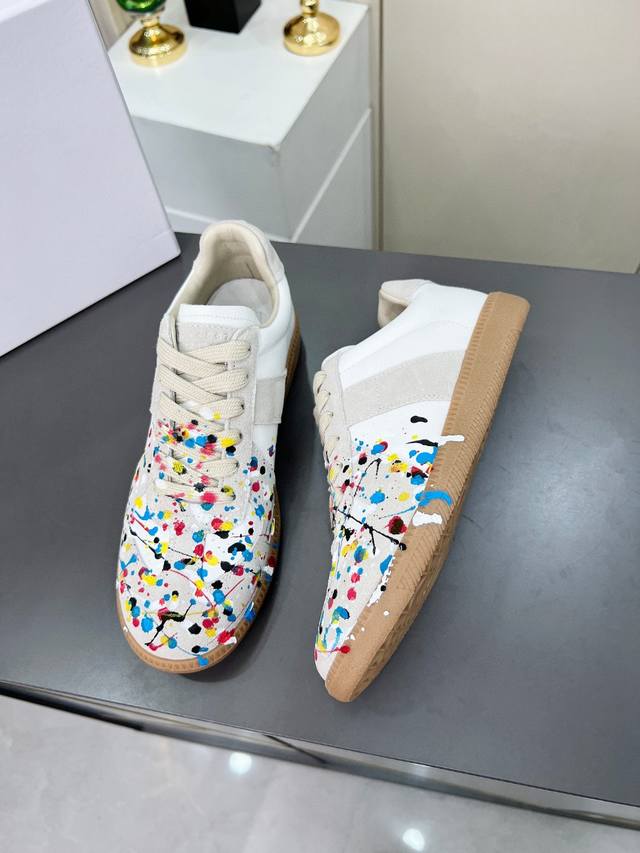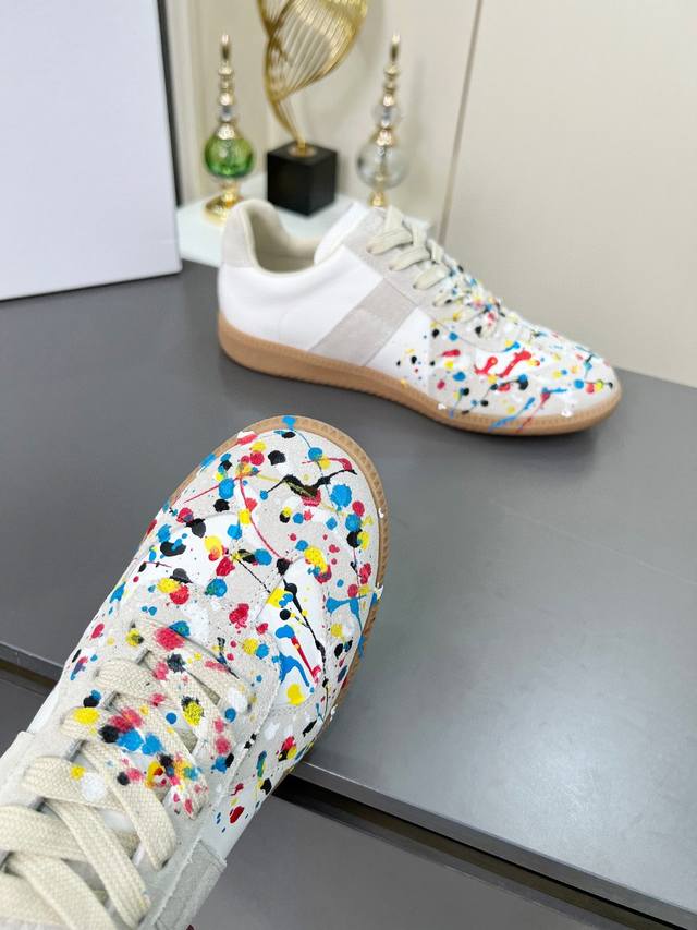 高版本35--45情侣款 DDD |德训休闲板鞋,鬼才设计师品牌,一个轻奢品牌 DDD 这一款德国训练鞋延续了经典的T形真皮拼接设计,经过设计团队多次的精心改良,只为让您体验最原始的军旅味道~~~ DDD 柔软细腻的特点与时尚潮流的布面相结合,使其既有超高的柔软舒适度,又同时保持不错的透气性能~舒适与质感并行,轻松驾驭四季穿着任何搭配,哈哈哈 上脚很百搭哦~ DDD 鞋面采用头层牛皮拼接牛反绒,喷墨涂鸦工艺,简约复古作旧,更具有个性穿着 鞋底采用复古牛津大底,柔软度远远高于其他任何橡胶底的鞋子 DDD 喷