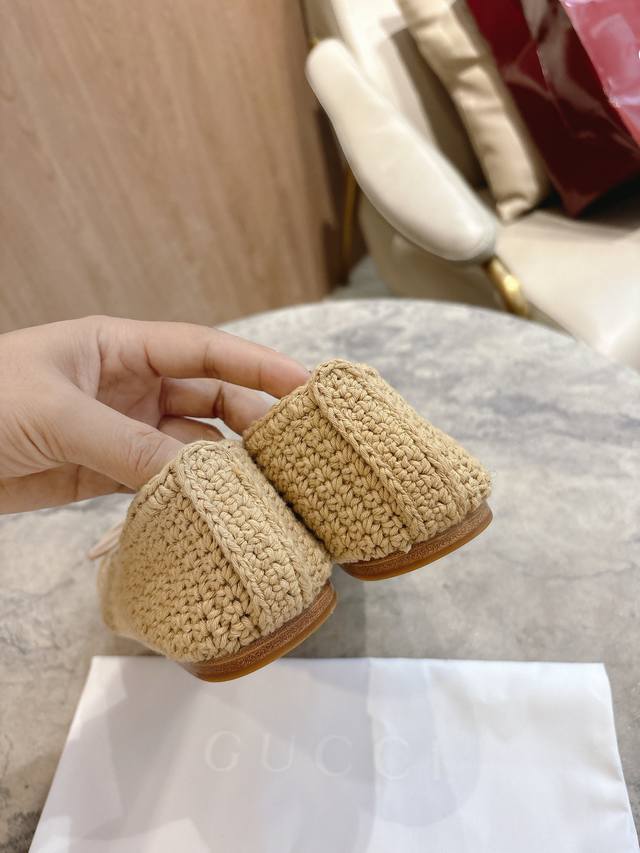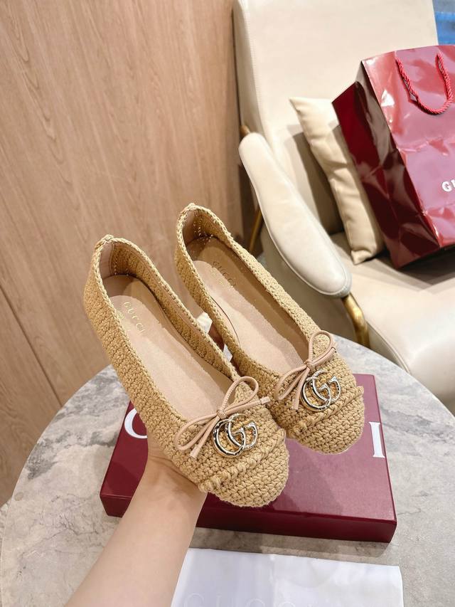 1054-2 卡其¥ 35-42 这款平底芭蕾舞鞋以精致棉质钩织面料匠心打造。鲜亮而不失内敛的浅金色双G配件令整个设计魅力倍增。皮革鞋底和内底最大程度提升舒适感