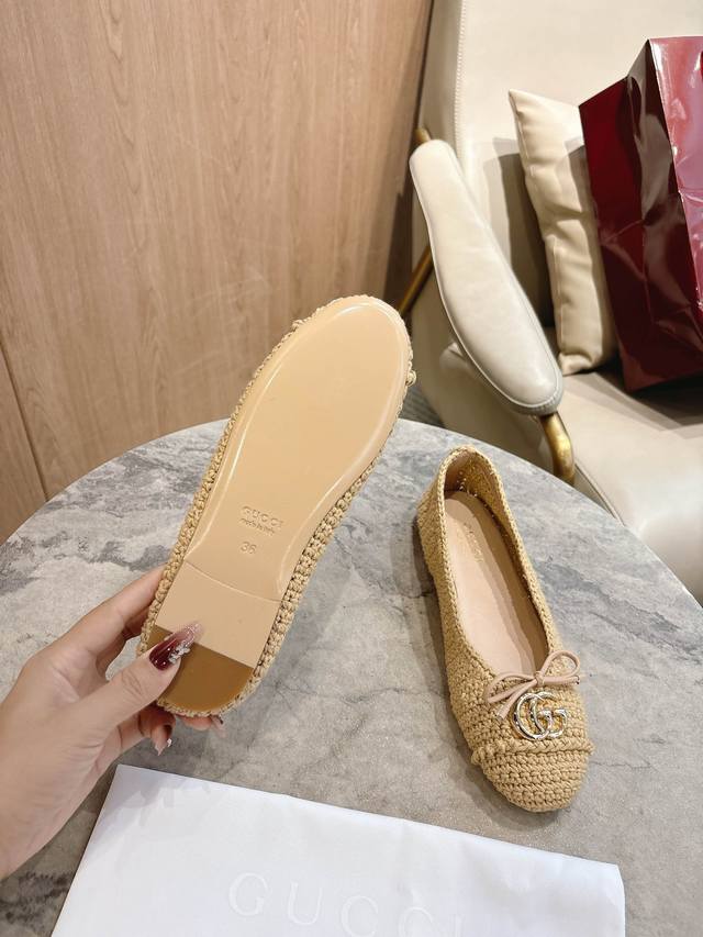 / 1054-2 卡其¥ 35-42 这款平底芭蕾舞鞋以精致棉质钩织面料匠心打造。鲜亮而不失内敛的浅金色双G配件令整个设计魅力倍增。皮革鞋底和内底最大程度提升舒适感