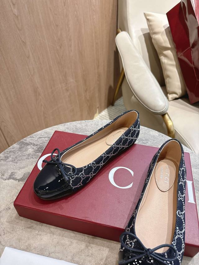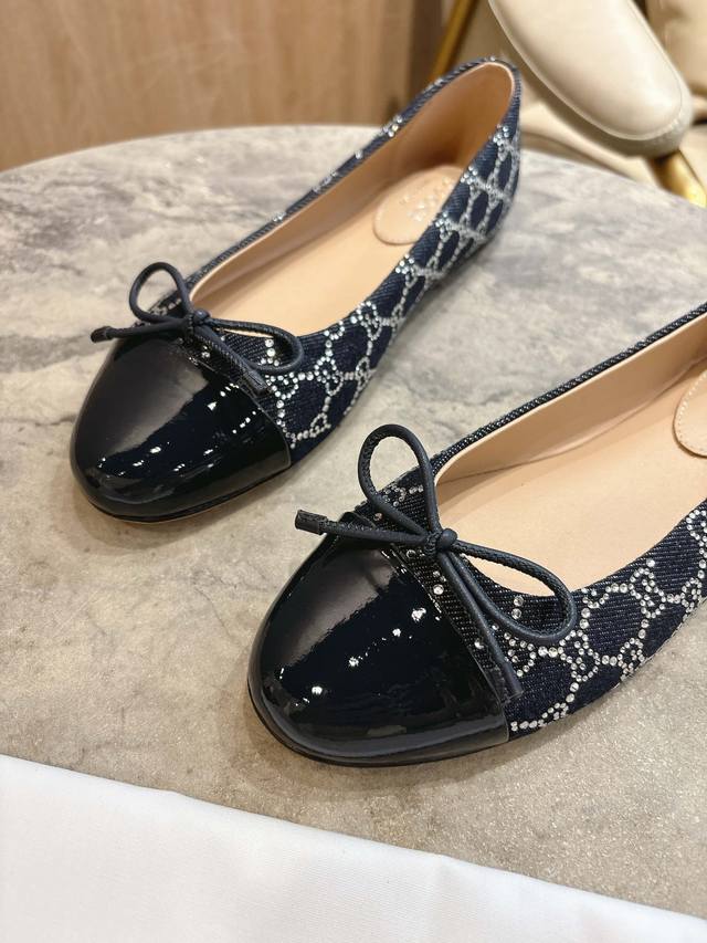 / 1054-2 牛仔钻¥ 35-42 这款女士芭蕾平底鞋采用深蓝色Gg水晶丹宁面料匠心打造,富有标志性的品牌面料焕新诠释双G字母图案,以闪亮细节为经典廓形精致质感