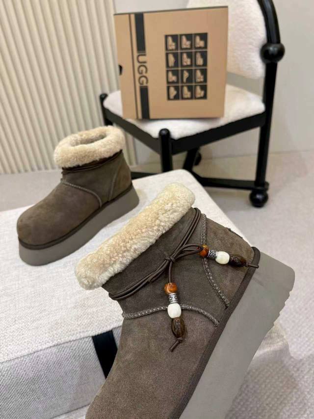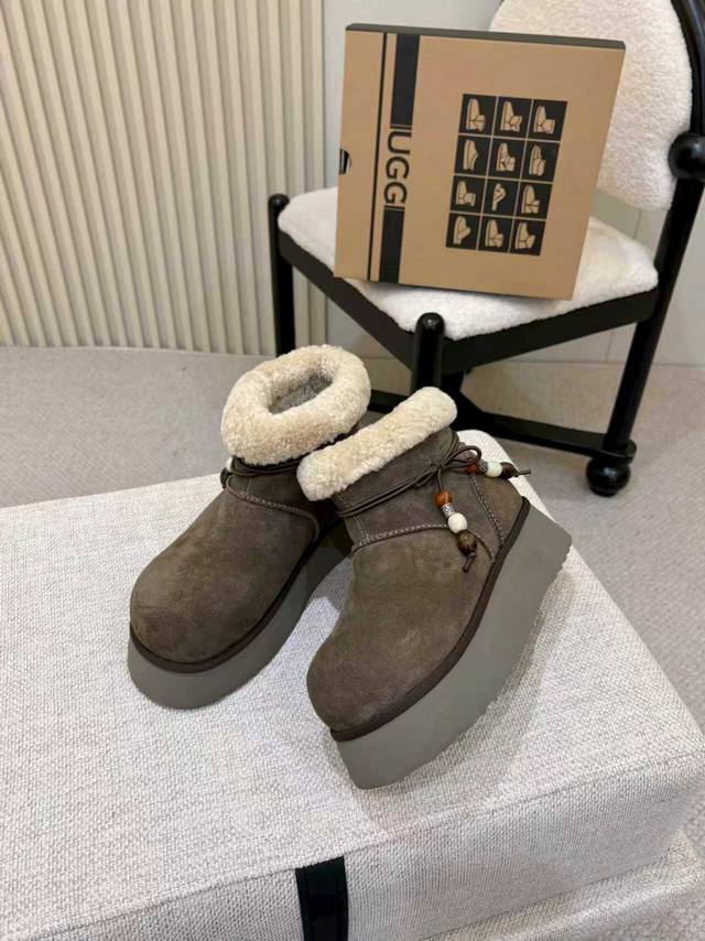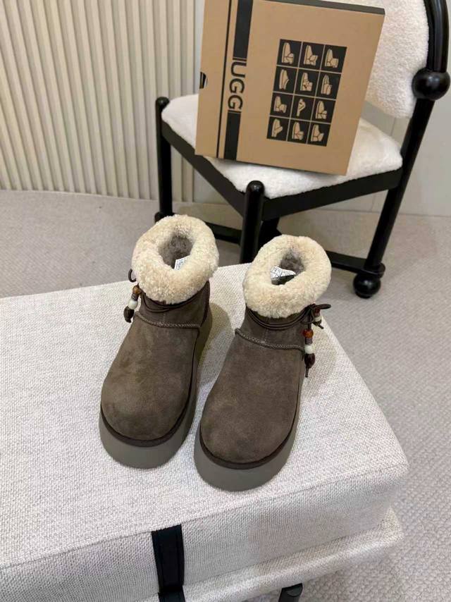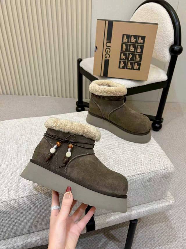 2025新款U家雪地靴 两种穿搭 DDD 厚底大头靴,面料牛皮 DDD ,内里羊毛,保暖舒适高弹厚底,随意应对各种天气,走路舒适,时尚吊坠,彰显不一样的个性。 DDD 颜色 :栗色 胡桃木 DDD 码数:35~40 DDD 厂价p: DDD