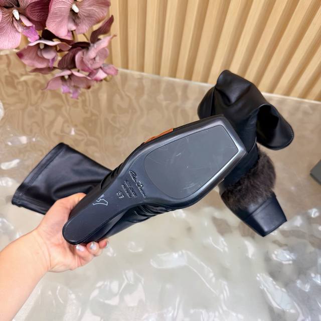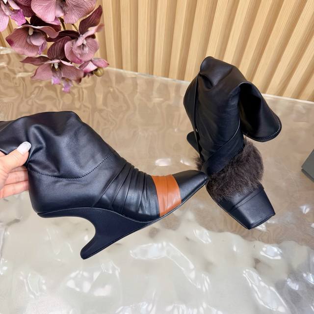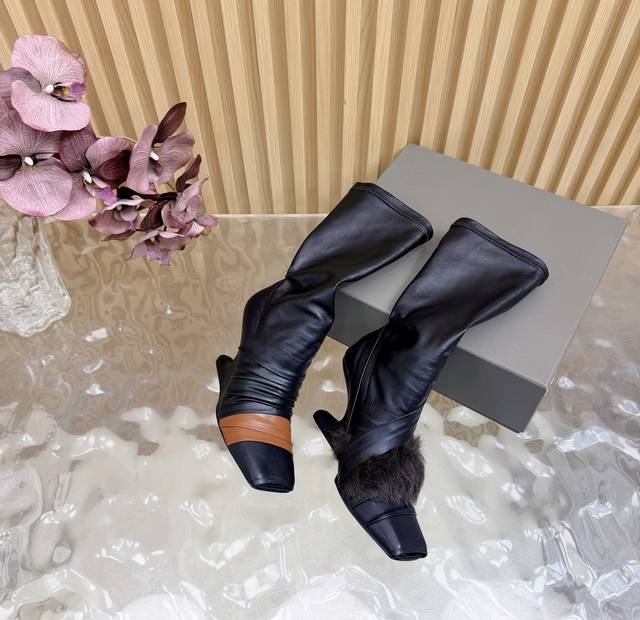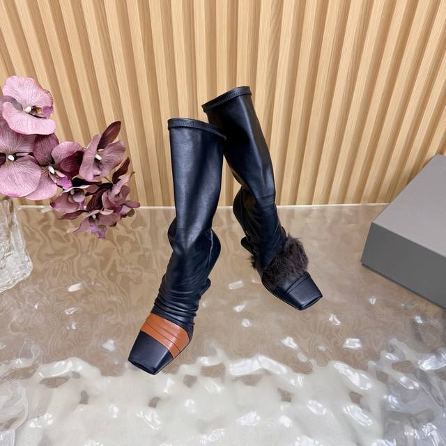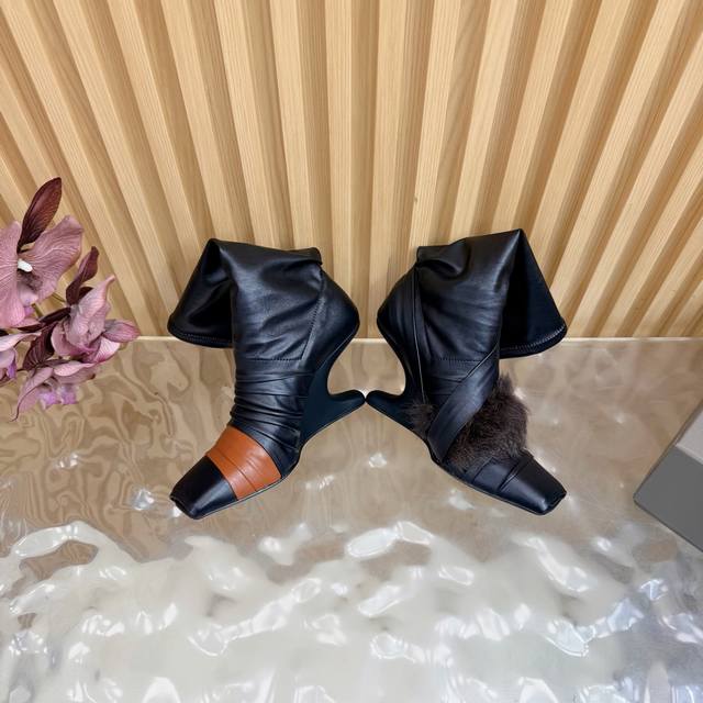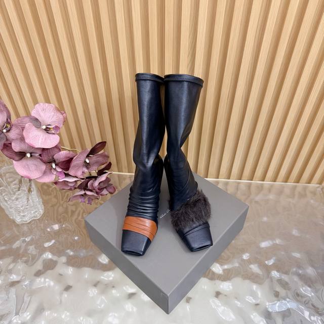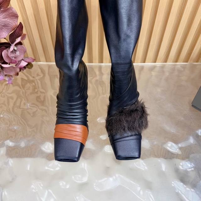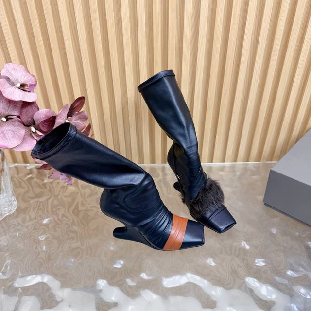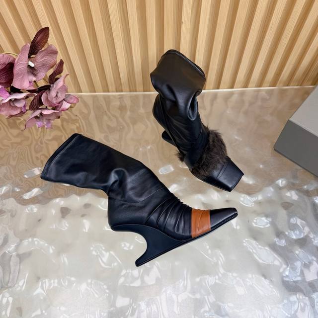 2025秋冬新品Rick Owens欧文斯高跟弹力坡跟高筒靴,时装走秀同步发售 牛羊皮拼接棕色羊皮,鱼嘴方头设计 带毛毛拼接 细节独特 全新带盒 36-41 4