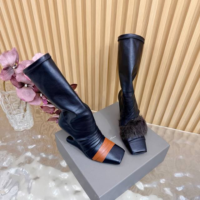 2025秋冬新品Rick Owens欧文斯高跟弹力坡跟高筒靴,时装走秀同步发售 Ddd 牛羊皮拼接棕色羊皮,鱼嘴方头设计 Ddd 带毛毛拼接 Ddd 细节独特 Ddd 全新带盒 Ddd 36-41 40.41定做 DDD