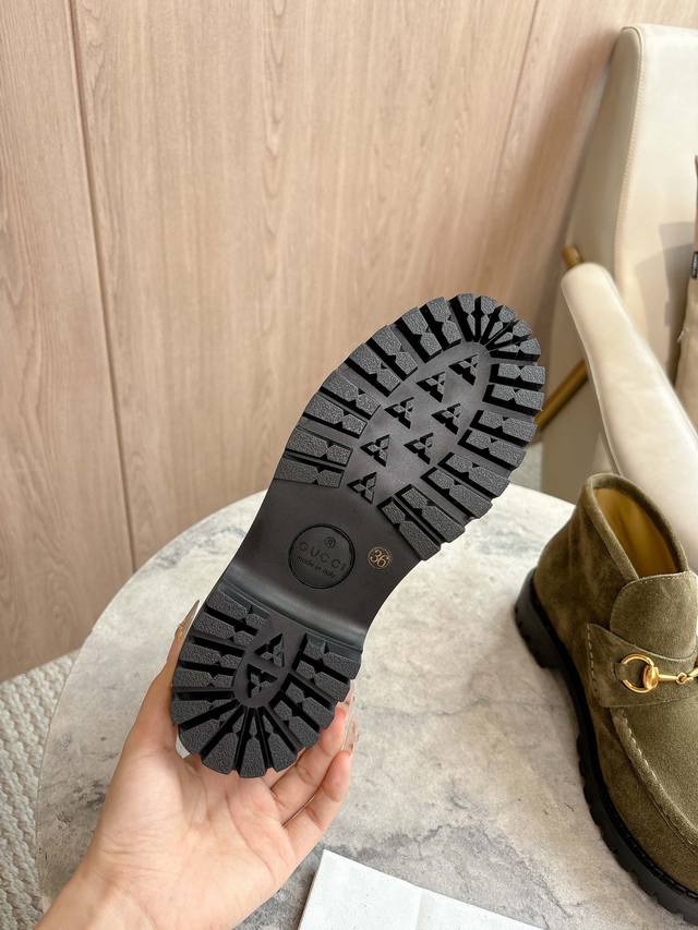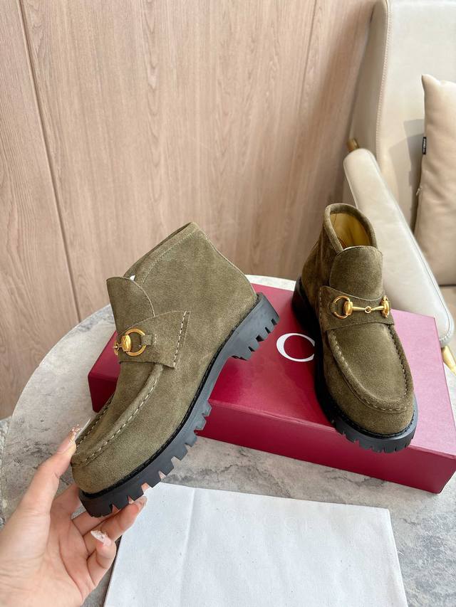 / 2025-1 绿 35-42 这款马衔扣踝靴采用经典乐福鞋版型,将典藏设计与现代精髓合而为一。这款靴子采用特有的瘦窄版型,以咖啡色绒面材质匠心打造,意在致敬品牌