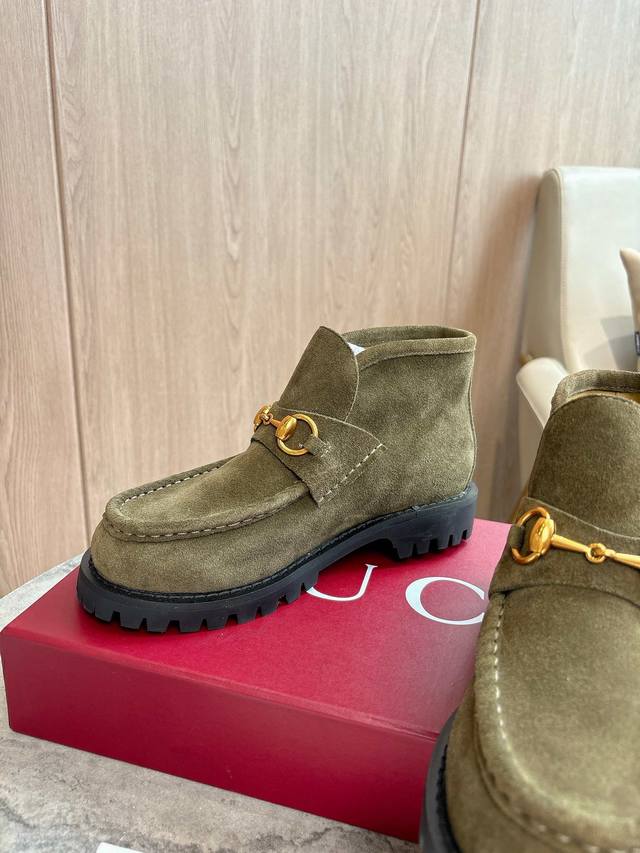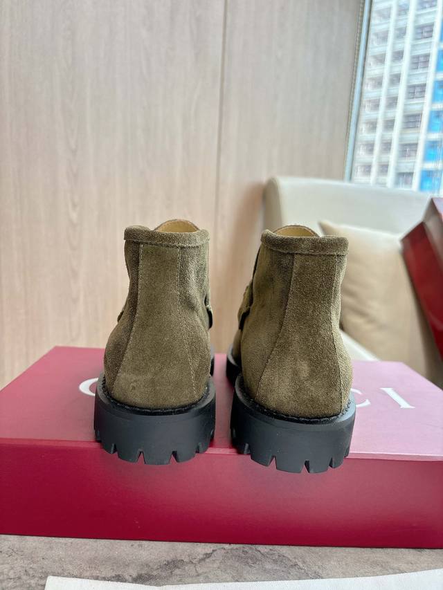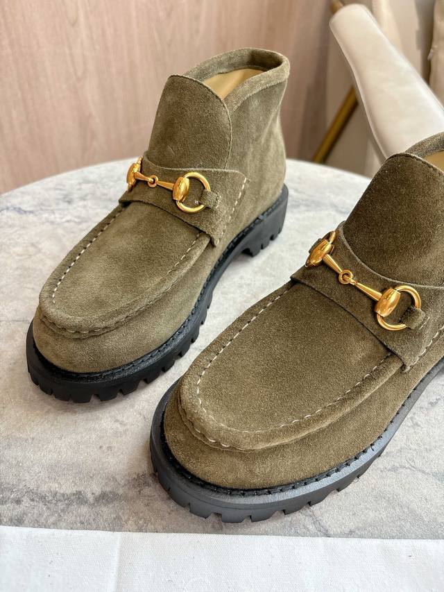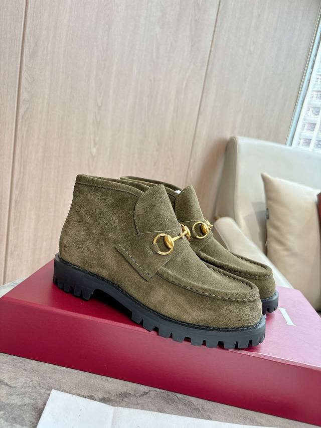 2025-1 绿 35-42 这款马衔扣踝靴采用经典乐福鞋版型,将典藏设计与现代精髓合而为一。这款靴子采用特有的瘦窄版型,以咖啡色绒面材质匠心打造,意在致敬品牌