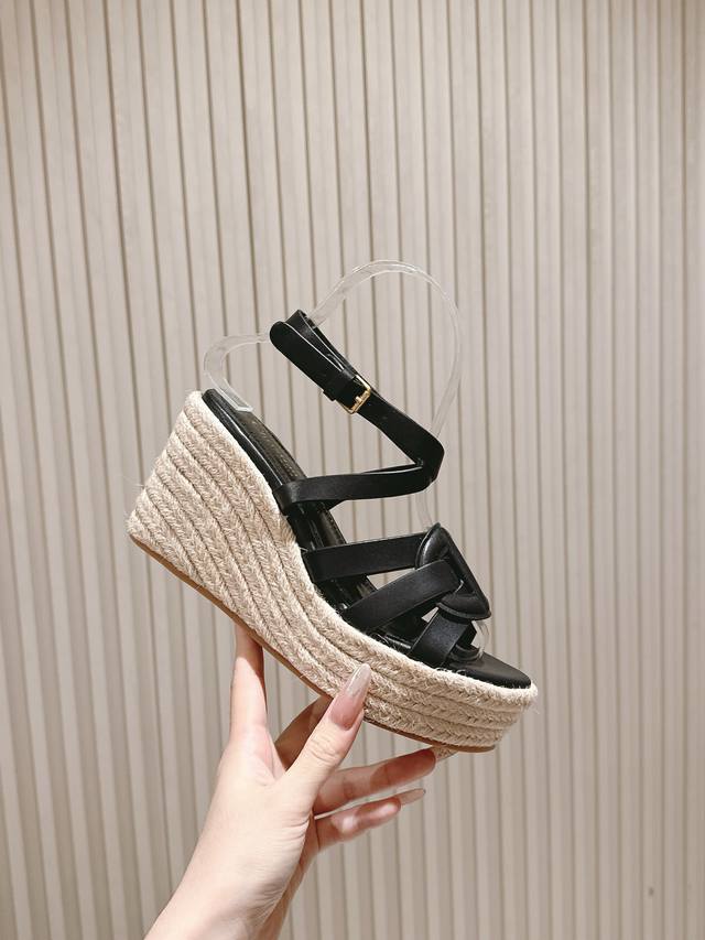 225 早春新款麻绳坡跟拖鞋 专柜新款顶级上新 鞋面:原版定制小羊皮电镀五金Logo 内里:透气柔软全羊皮内里 大底:原版麻绳坡跟大底 鞋码: 35-40 跟高