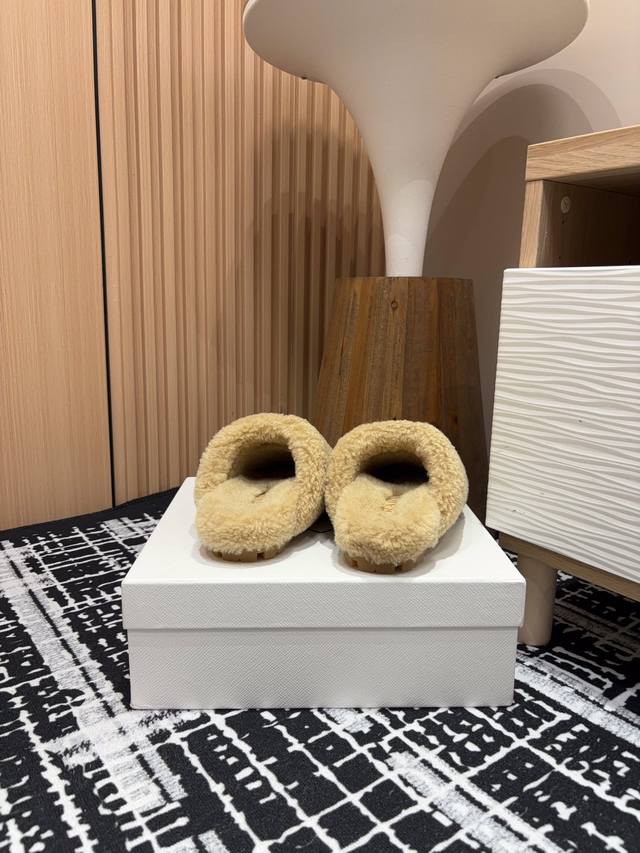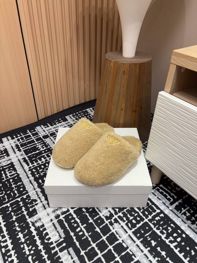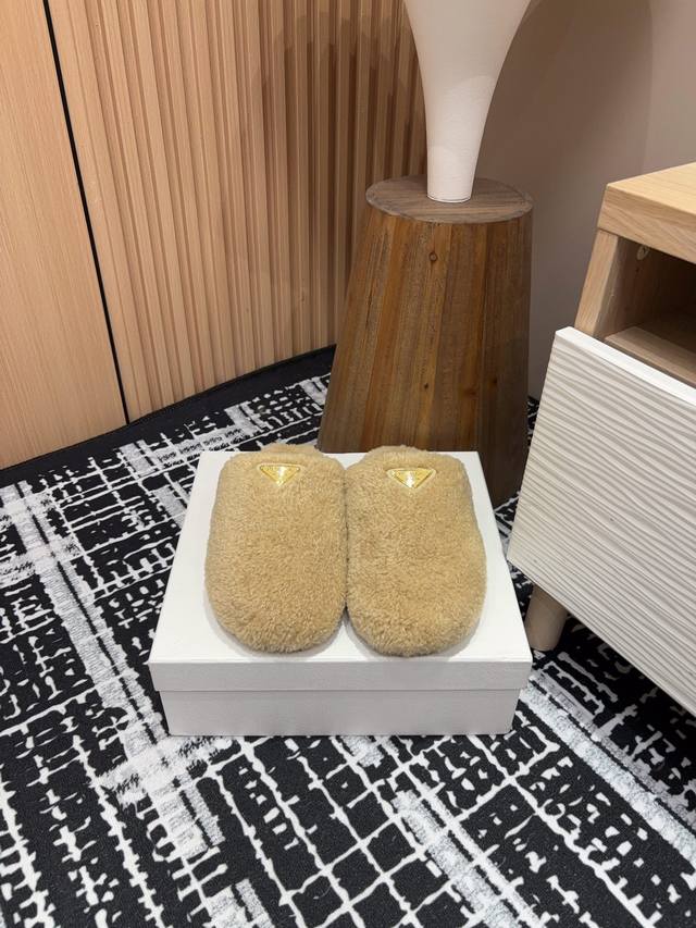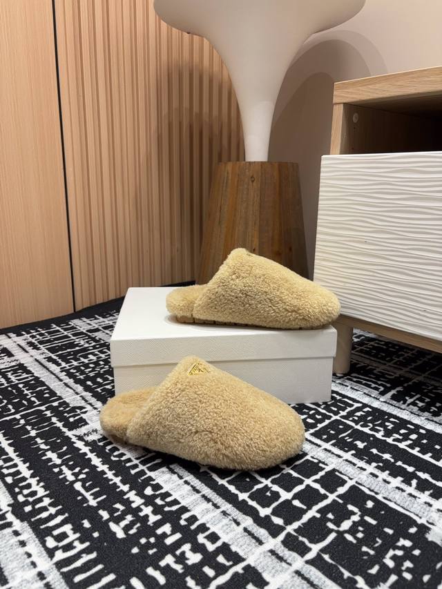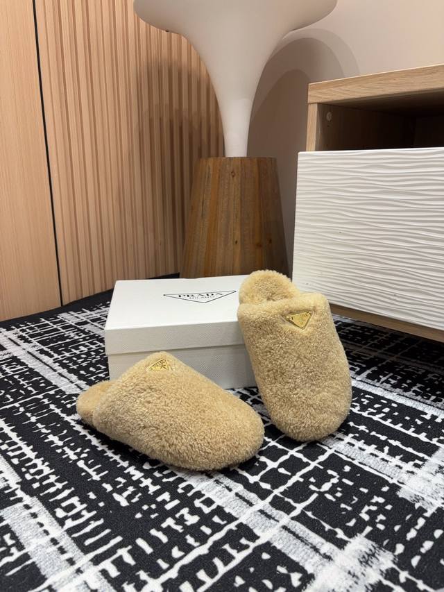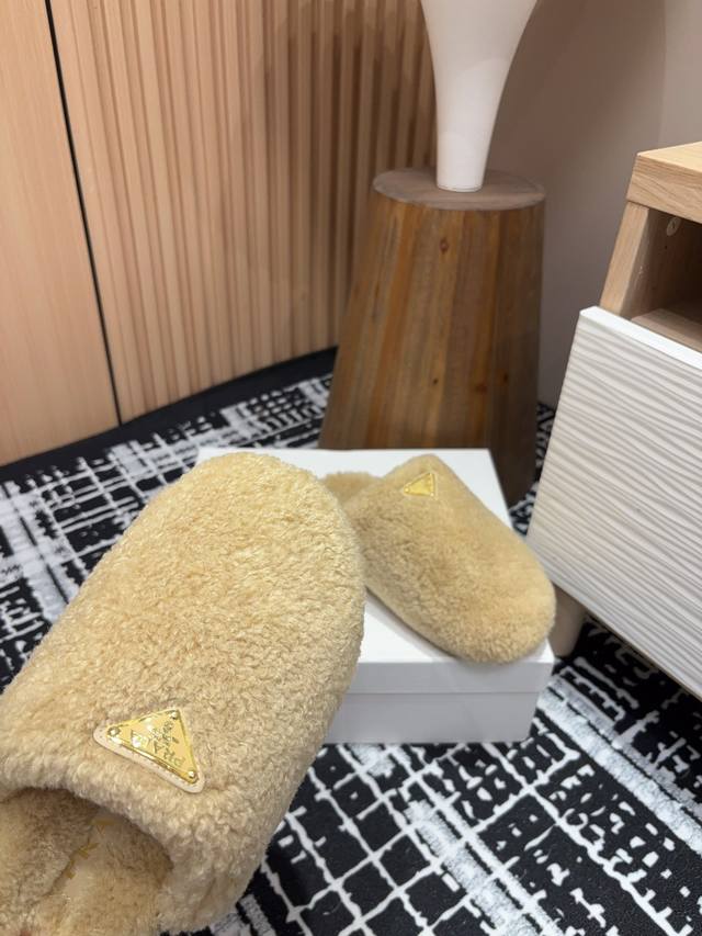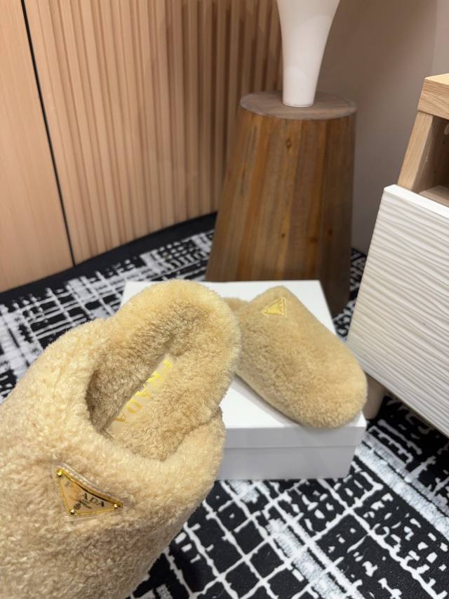 / 24Ss秋冬新款prada三角标羊毛绒毛拖半拖鞋 这款简约毛里半拖鞋取材羊毛绒打造。新意迭出的三角形徽标重释为经典元素! 鞋面:羊毛绒 内里:羊毛绒 鞋底:生胶