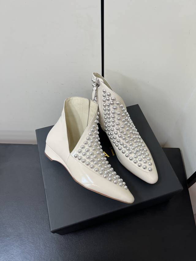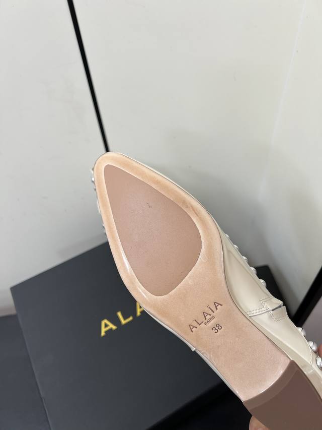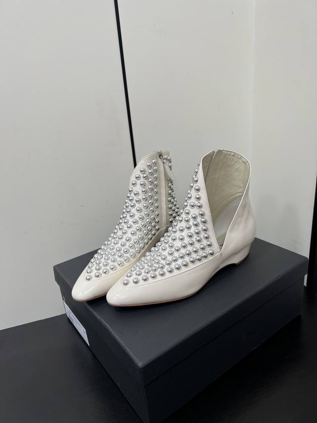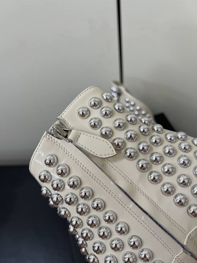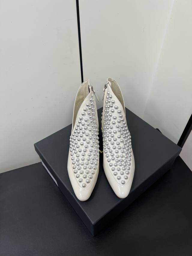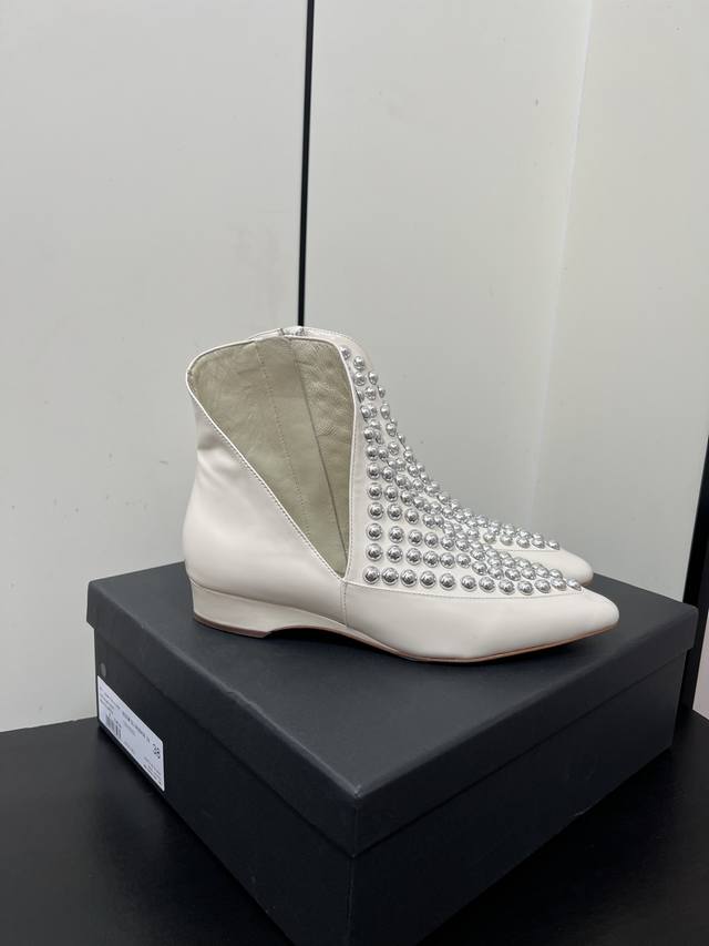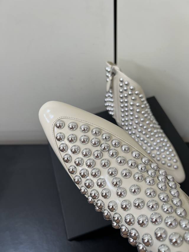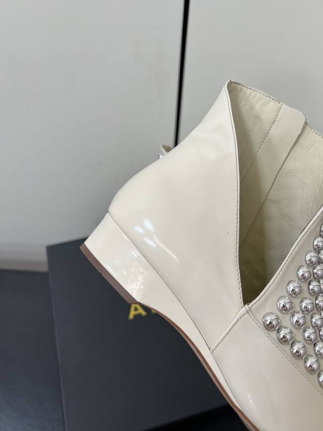 25早秋新款Alaia阿莱亚 时髦铆钉短靴牛皮圆珠侧拉链踝靴 采用了经典的短靴款式,鞋头为尖锐的形状,线条流畅且锐利,这种鞋头设计不仅能拉长腿部线条,还增添了时尚感与攻击性,展现出独特的个性风格。 铆钉设计,独特的视觉效果,为整体造型注入了摇滚、朋克风格的叛逆与前卫感。 风格一如其时装,性感而又摩登!满满的少女风 既摩登又复古的味道 !非常的简约大气 不管是半身裙连衣裙还是牛仔裤 它都能成为点睛之笔! 鞋面:牛皮 内里垫脚:羊皮 鞋底:意大利真皮大底 码数:35-39 40.41定做不退换