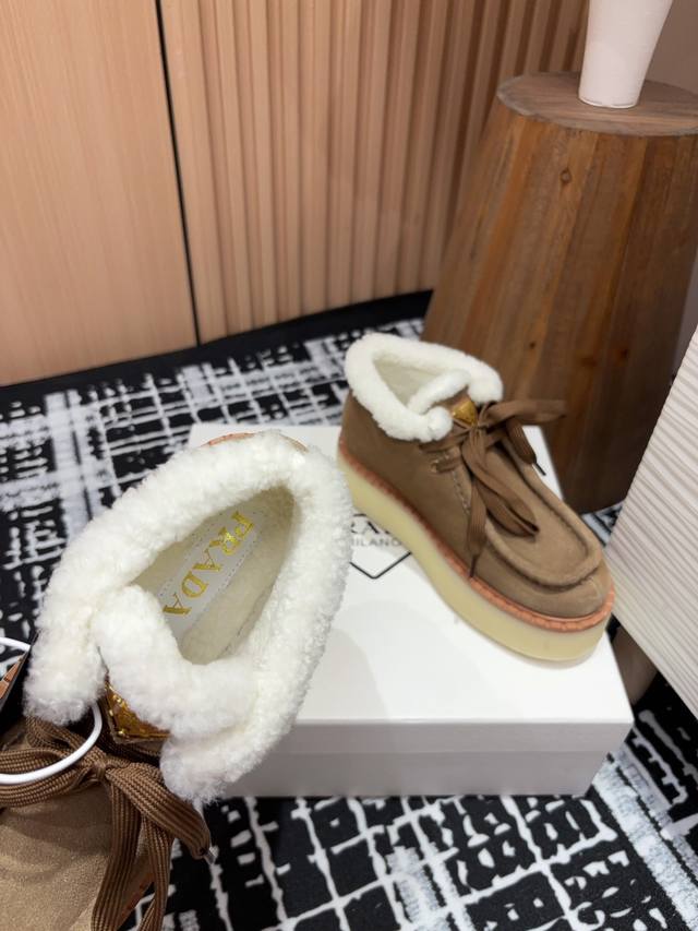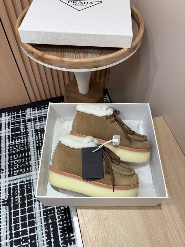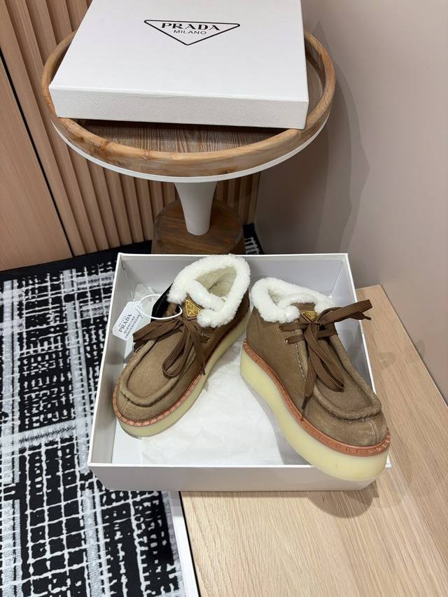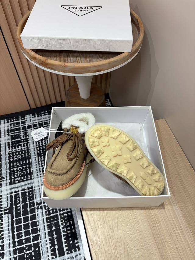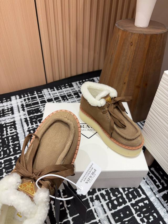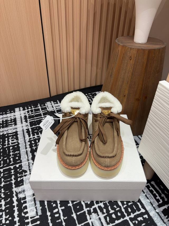 / 25Ss秋冬新款prada三角标厚底短靴系带雪地靴 这款简约厚底毛里短靴取材羊羔毛打造。新意迭出的三角形徽标重释为经典元素! 鞋面:双色擦色牛绒 内里:真羊羔毛