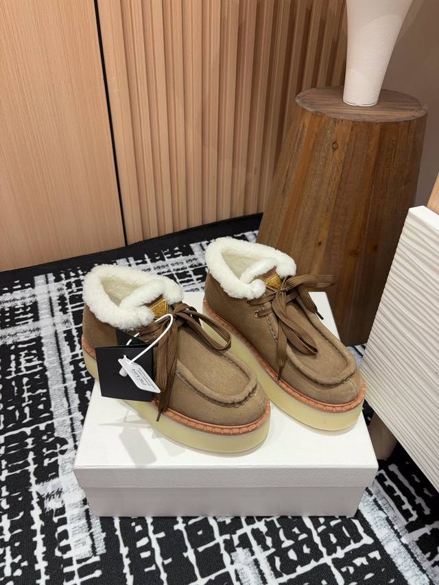 25Ss秋冬新款prada三角标厚底短靴系带雪地靴 这款简约厚底毛里短靴取材羊羔毛打造。新意迭出的三角形徽标重释为经典元素! 鞋面:双色擦色牛绒 内里:真羊羔毛